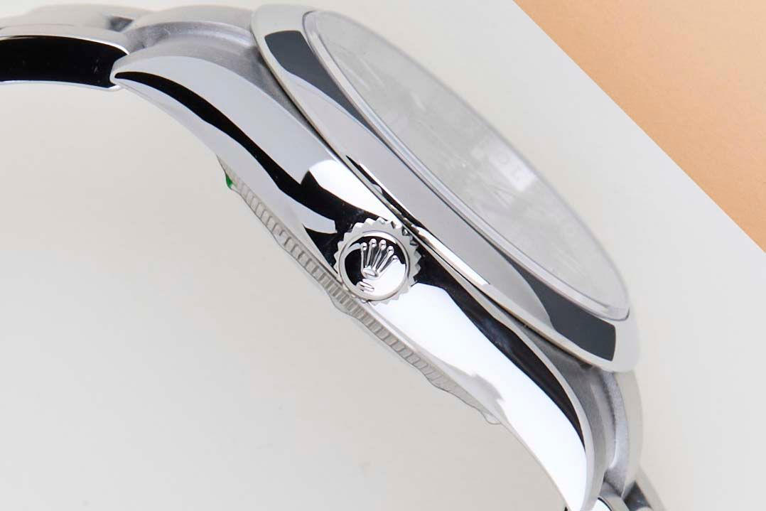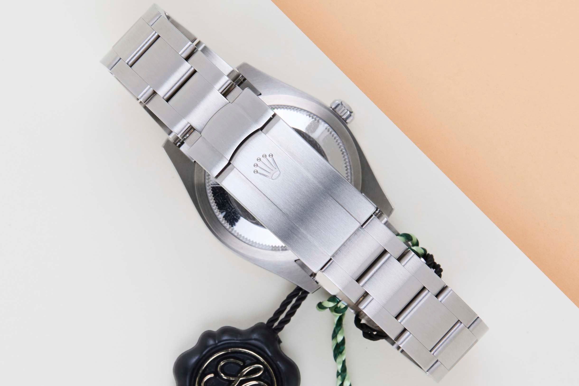 Die Uhr besteht vollständig aus Edelstahl. Rolex verwendet 904L in seinen Stahluhren, was eine extrem widerstandsfähige und hochpolierbare Superlegierung ist.