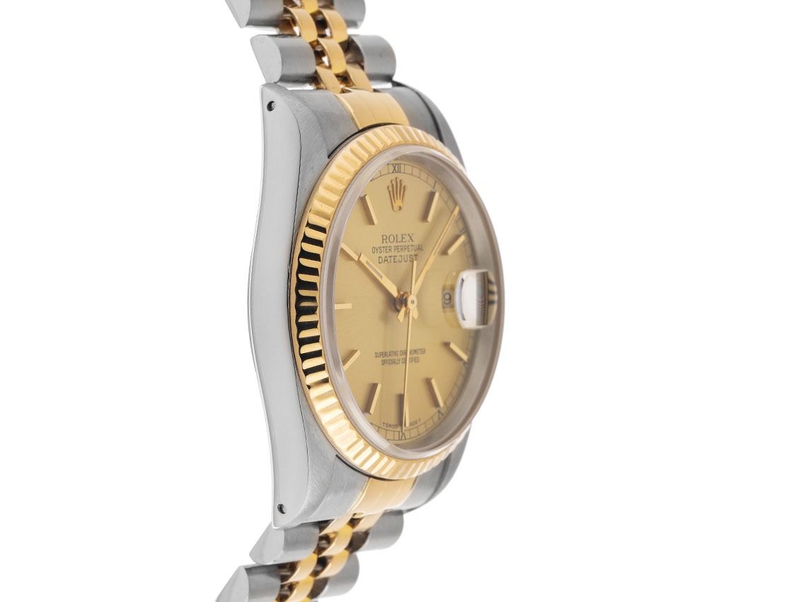 Gehäuse aus poliertem und satiniertem Edelstahl, Gehäusedurchmesser ohne Krone 36mm, Gehäusehöhe 11,9mm. Lünette aus 18kt Gelbgold, geriffelt und poliert. Armband Jubilé aus poliertem und satiniertem Edelstahl / 18kt Gelbgold, Faltschließe aus Edelstahl mit Hersteller-Logo. Zifferblatt in champagnerfarben mit aufgesetzten gelbgoldenen Indexen und gelbgoldenen Zeigern, "T SWISS MADE T" Aufschrift bei 6 Uhr. Uhrwerk Automatik, Chronometer mit Zeugnis, Rolex Manufakturkaliber 3135 mit 31 Edelsteinen. Anzeige von Stunde, Minute und Sekunde über Zeiger aus der Mitte mit Sekundenstopp zur sekundengenauen Einstellung der Uhrzeit, Datumsanzeige mit Schnellverstellung unter Glaslupe bei 3 Uhr. Saphirglas kratzfest. Verschraubbare Krone mit Hersteller-Logo. Boden aus Edelstahl, verschraubt. Gewicht der Uhr inklusive Armband 98g, Länge des Armbandes inklusive Gehäuse 170mm. Referenznummer: 16233, Baujahr: 1991, Gehäusenummer: X691XXX, ID: P211390001225H-7900, Artikelnummer: 10000083882. Mit Gangkontrolle und kompletter äußerlicher Aufarbeitung von Dezember 2025. Original Rolex Box mit Umkarton und Beschreibung, Ledermäppchen, Übersetzungsheft, Rolex Chronometer-Siegel sowie Watchregister Auszug von Dezember 2025, The Watch Register Zertifikat / ohne Eintrag (Internationale Datenbank für verlorene oder gestohlene Uhren). Kapitalanlage mit Wertsteigerungspotential. Sehr guter Zustand. Lieferzeit sofort.