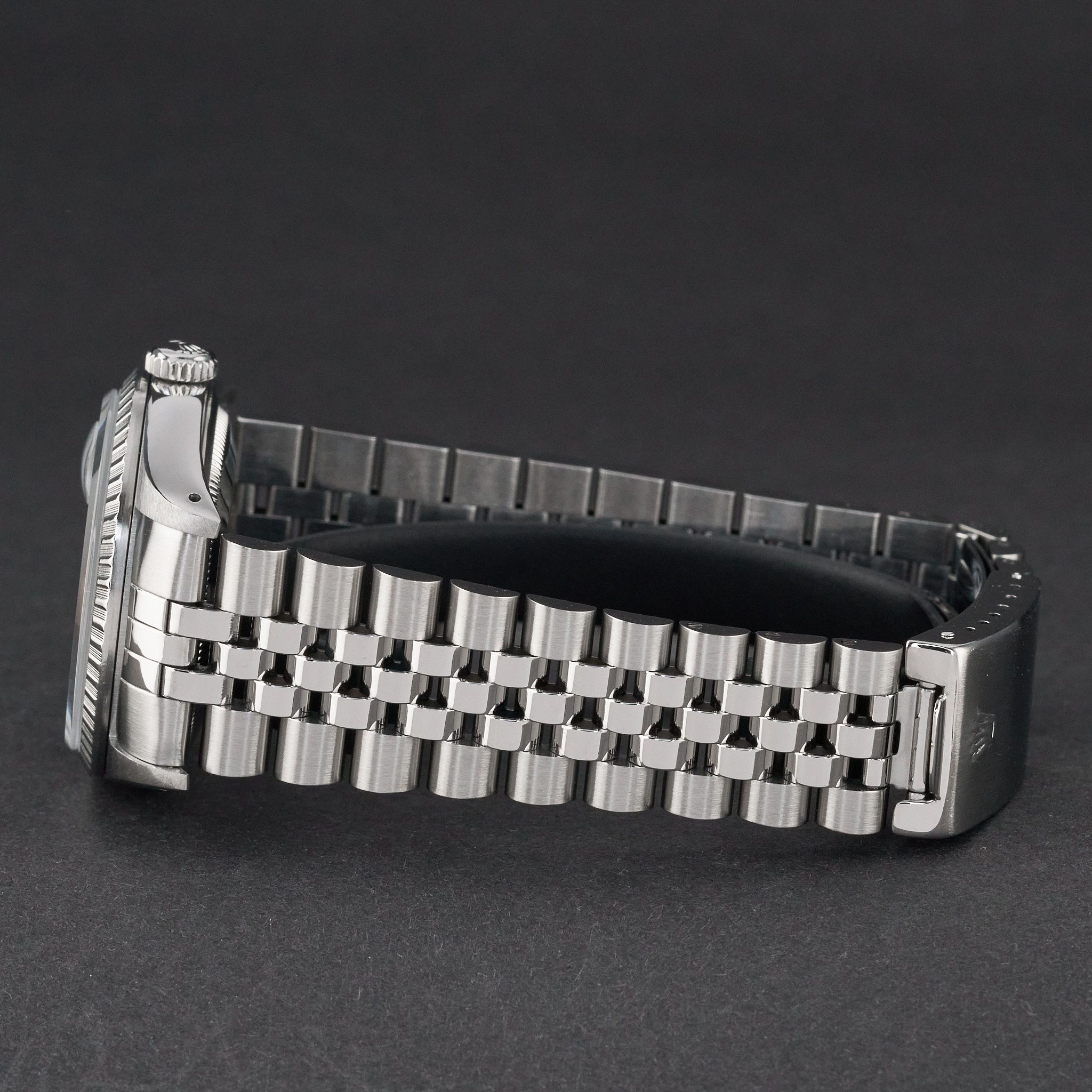 Diese Rolex Datejust 16220 verfügt über eine silberne Leinen-Optik auf der Zifferblatt und ist aus Edelstahl gefertigt, mit einem Produktionsjahr von 1991.