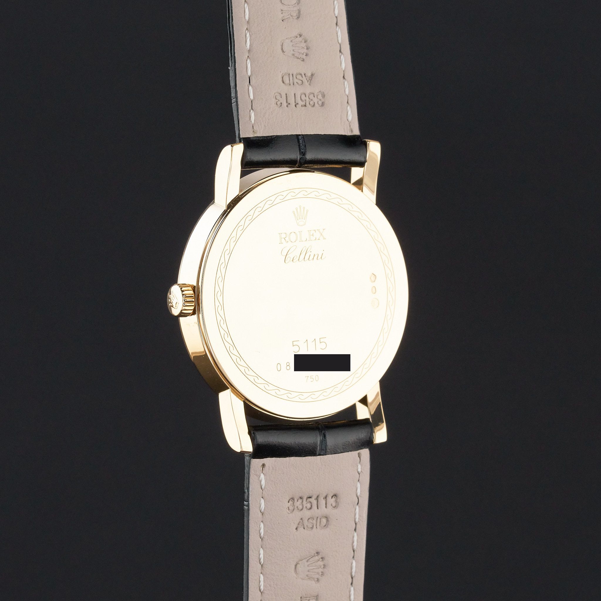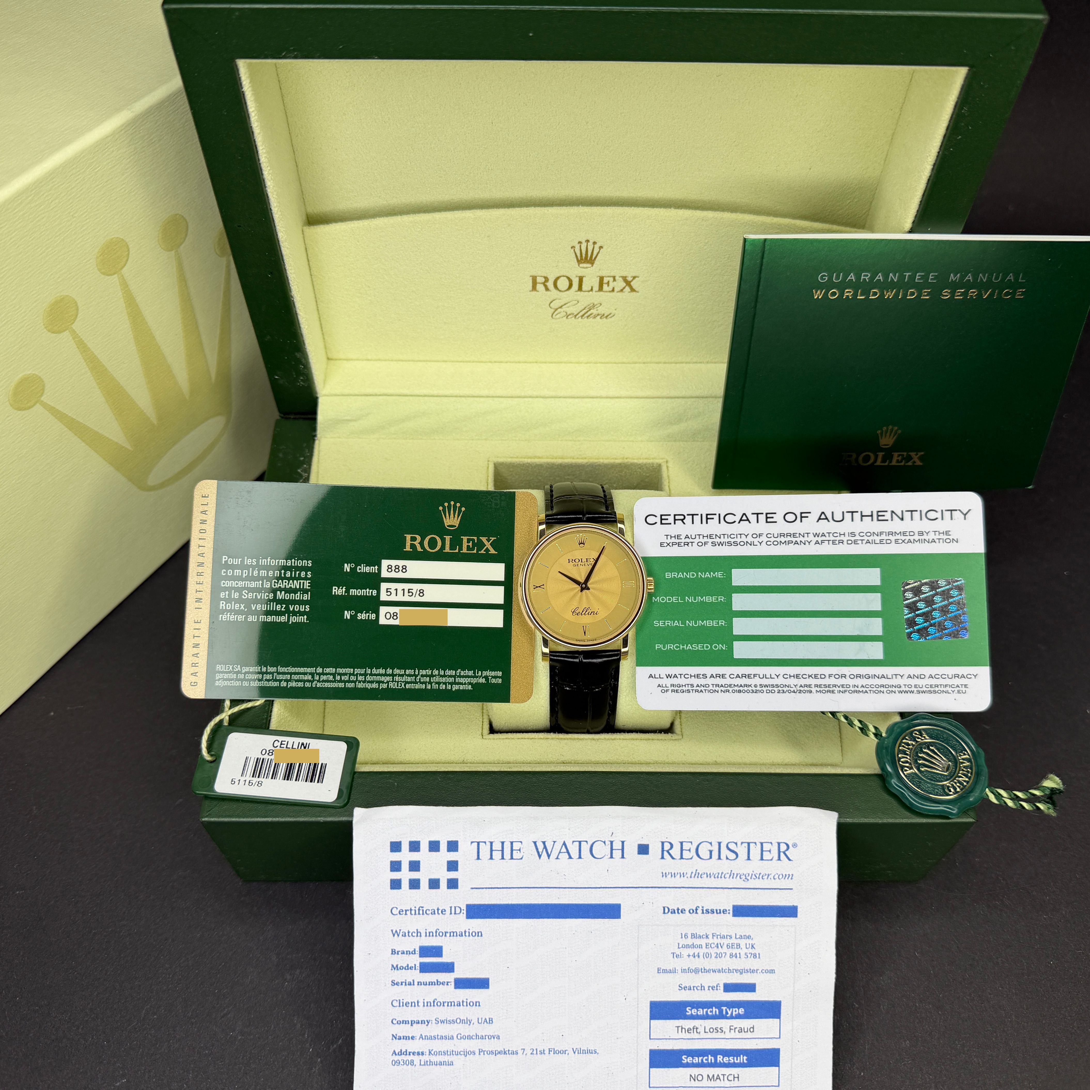This Rolex Cellini 5115/8 features a Champagne Roman dial and is crafted from 18K yellow gold, with a production year of 2013.Case No: 08QGXXXX