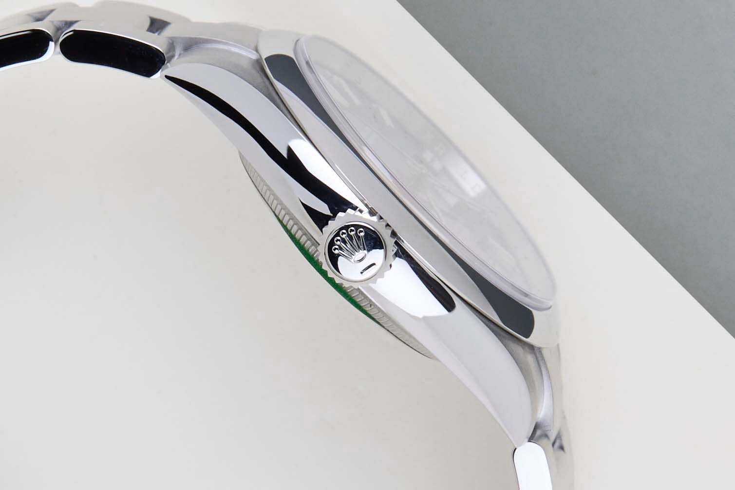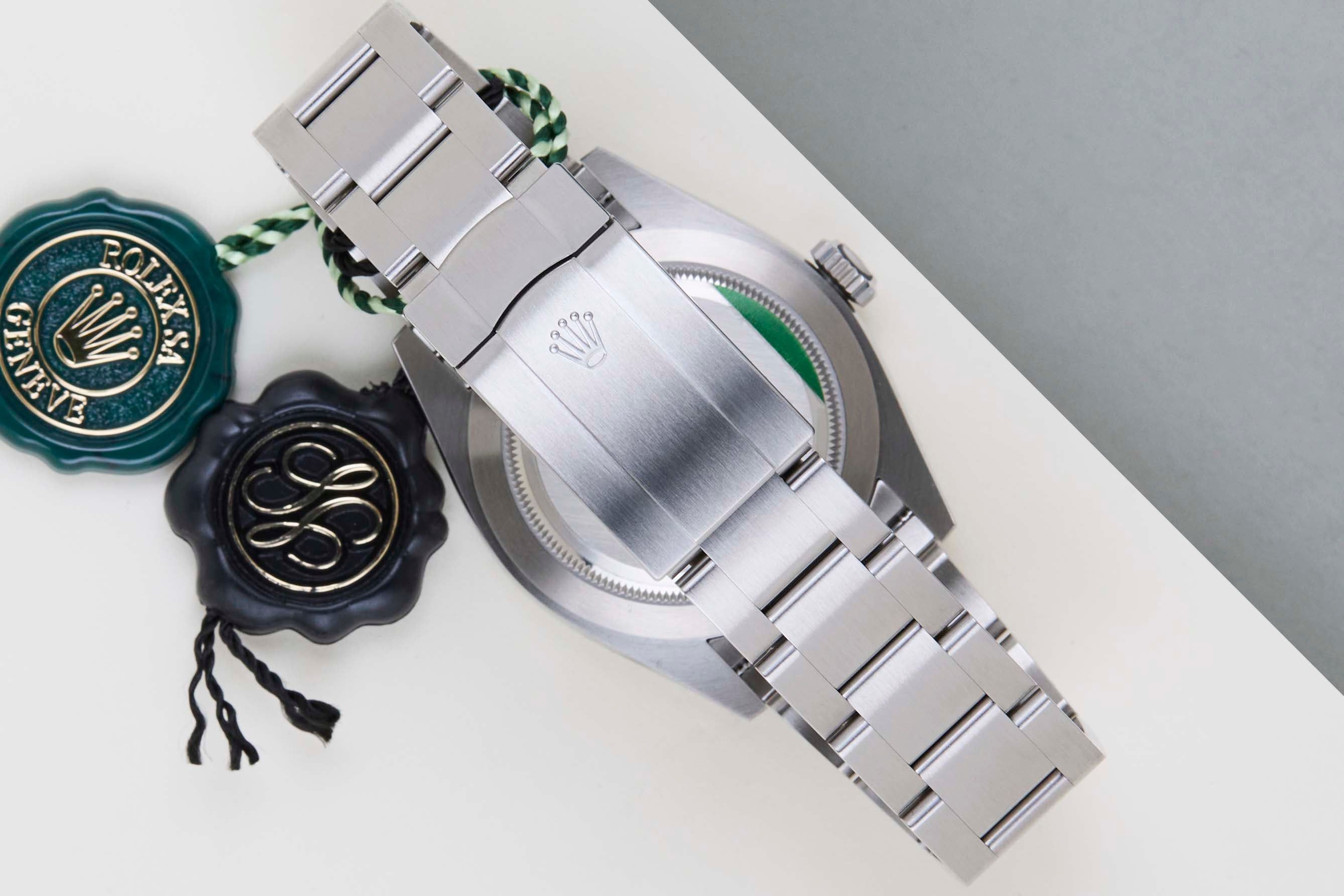 Die Uhr besteht vollständig aus Edelstahl. Rolex verwendet 904L in seinen Stahluhren, das ist eine extrem widerstandsfähige und hochpolierbare Superlegierung.