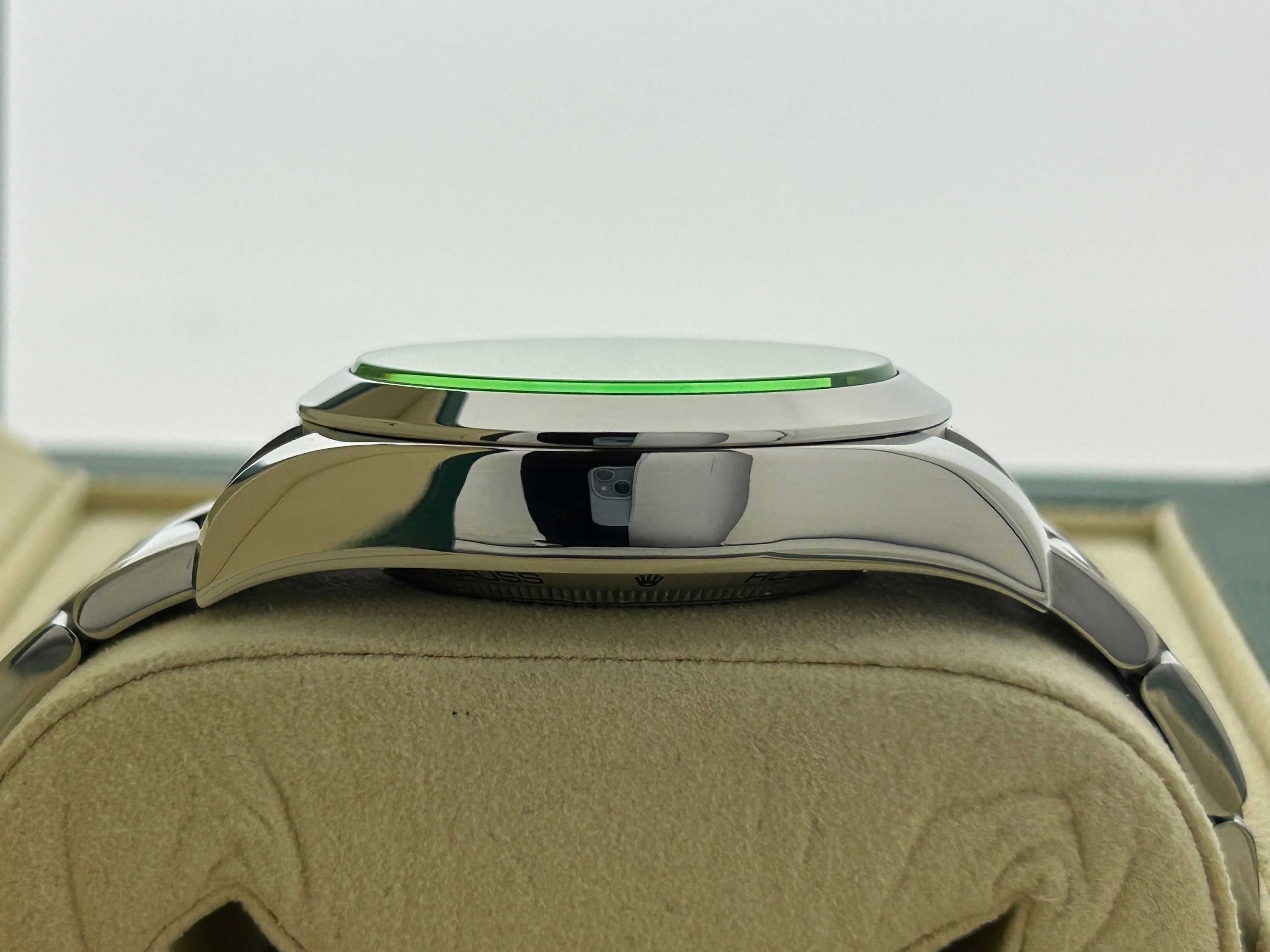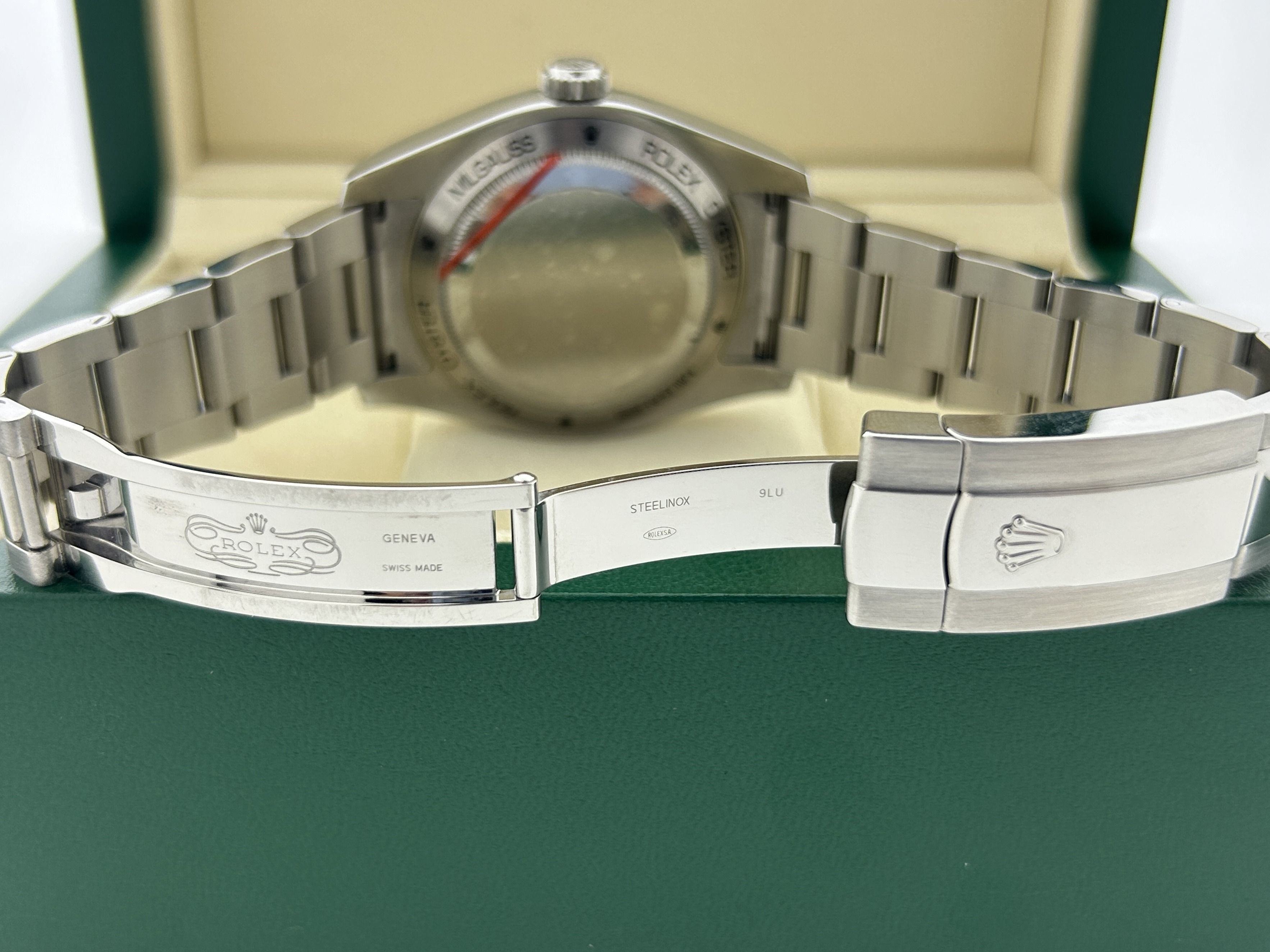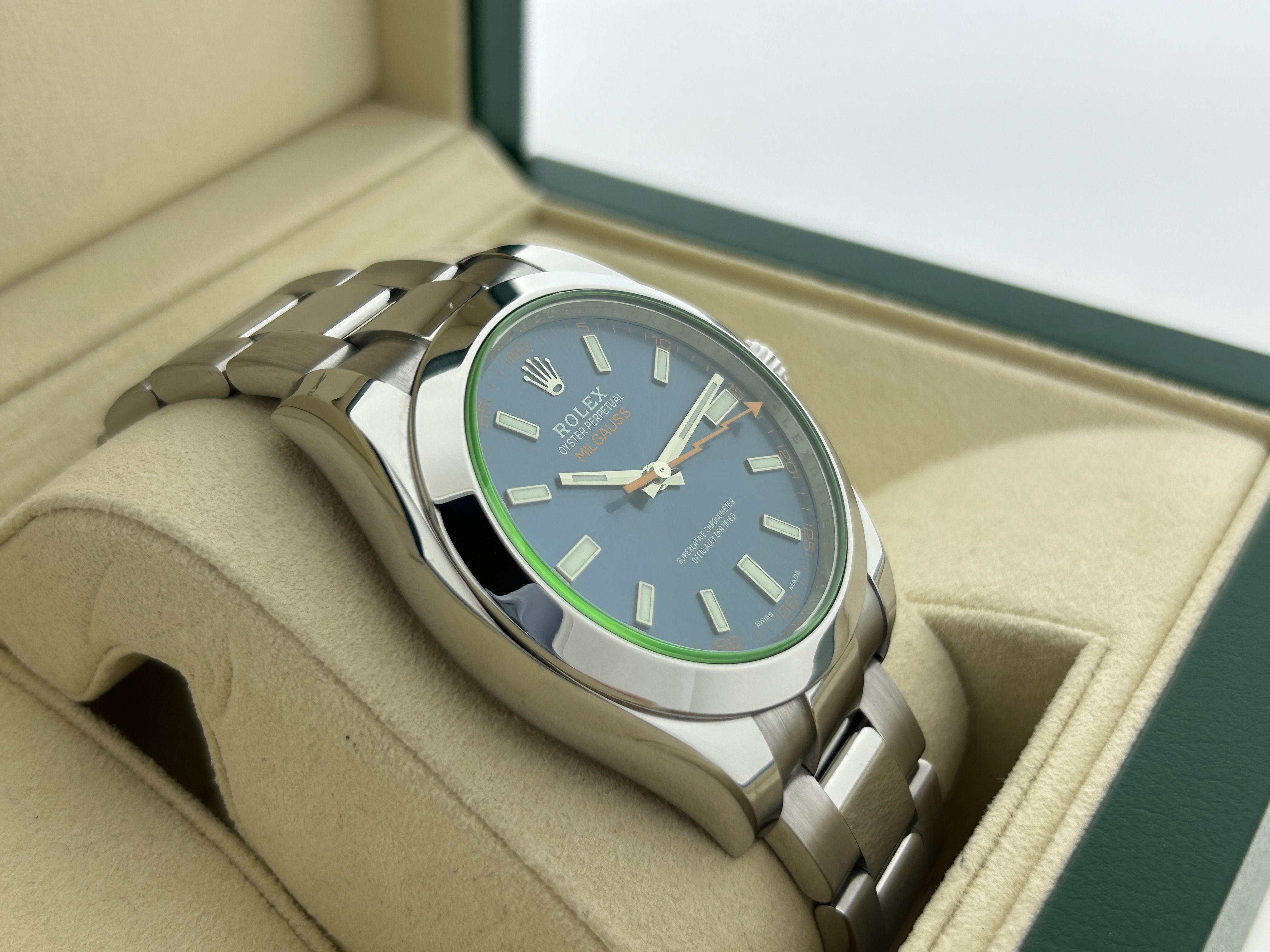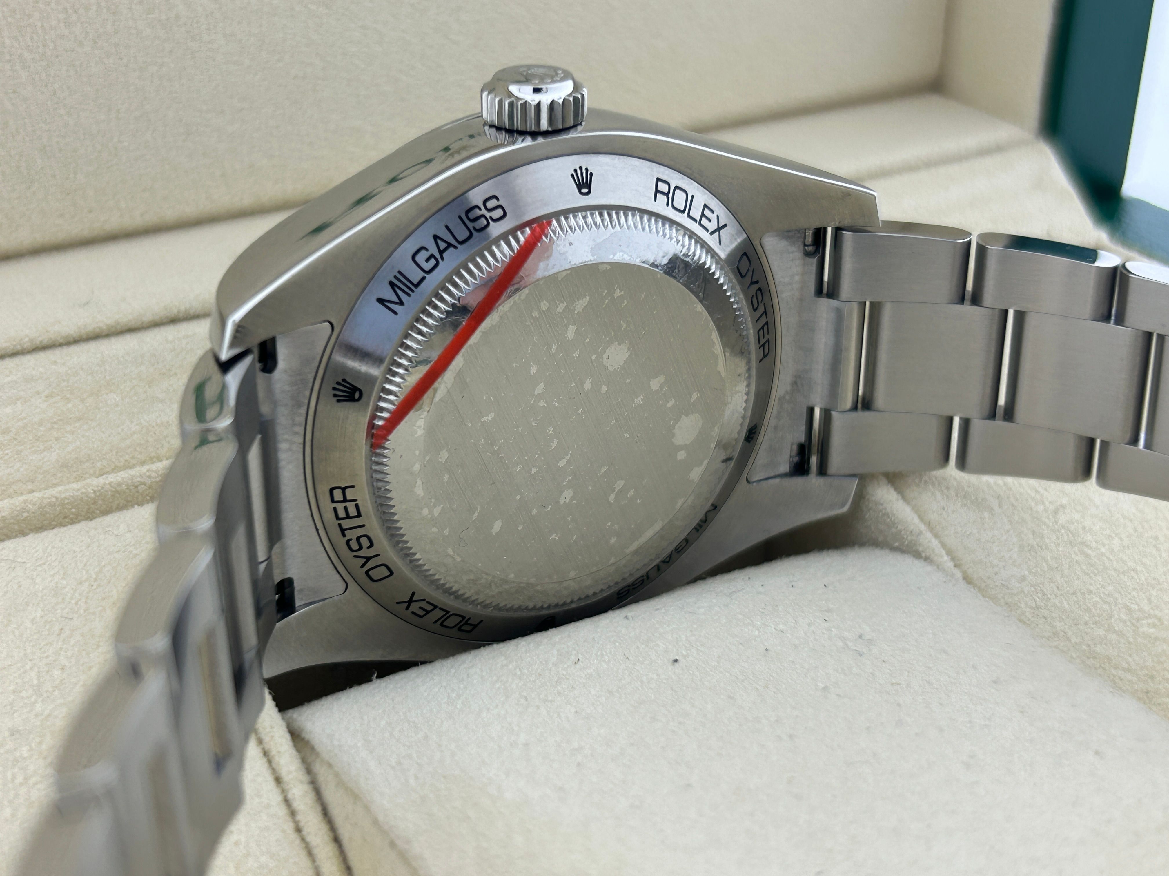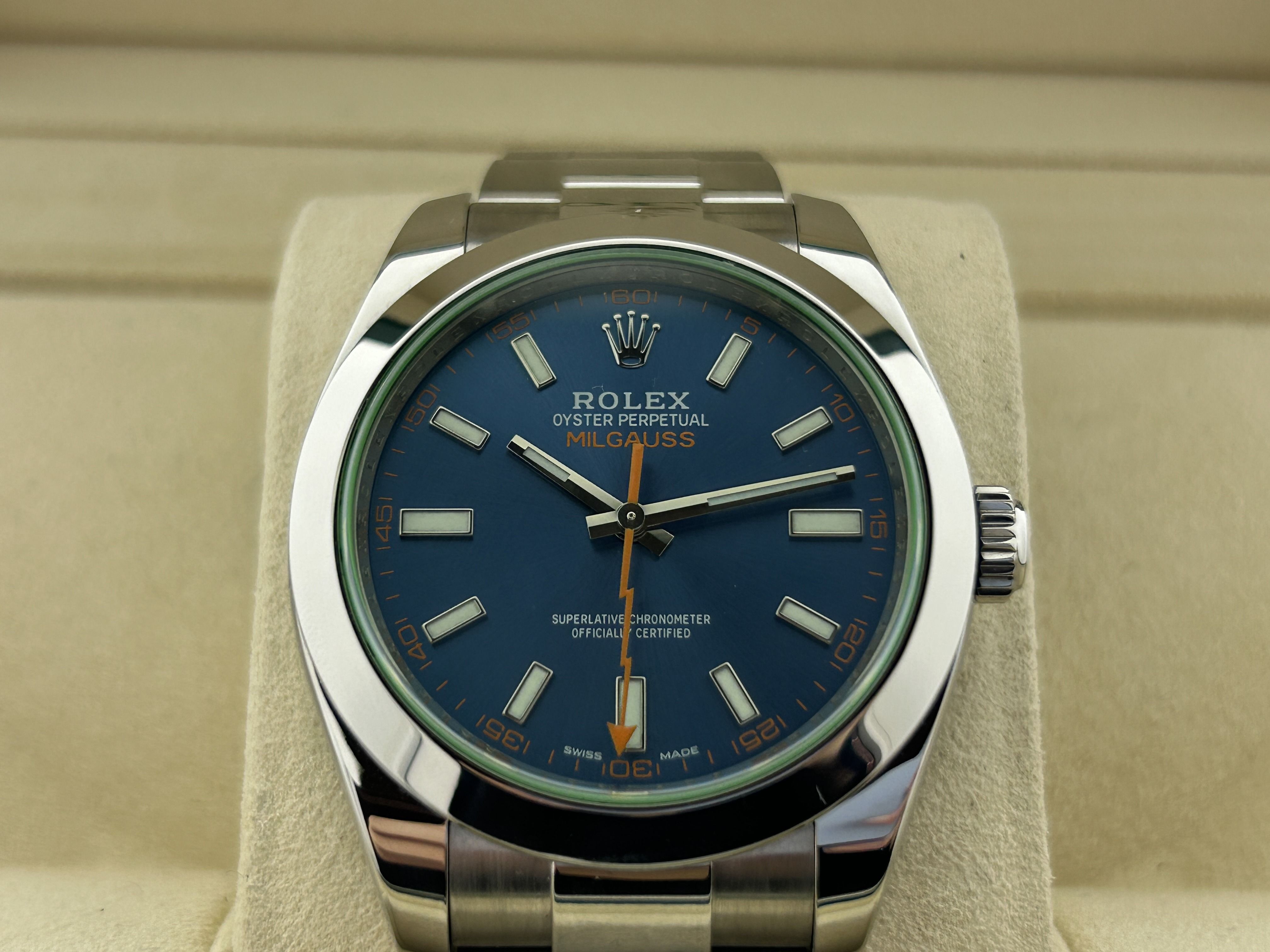 Eine Rolex Milgauss Uhr, Ref. 116400GV, Fullset, aus 2017. Die Uhr hat ein 40 mm Gehäuse aus Stahl mit einem Stahl-Oyster-Armband. Die Uhr hat eine blaue Zifferblatt mit Stab-Stundenmarkierungen und dem ikonischen orangen Blitz als Sekundenzeiger. Die Milgauss hat ein grünes Saphirglas. Die Uhr ist in einem hervorragenden Zustand, stammt aus 2017 und kommt mit ihrer originalen Box und dem Zertifikat.