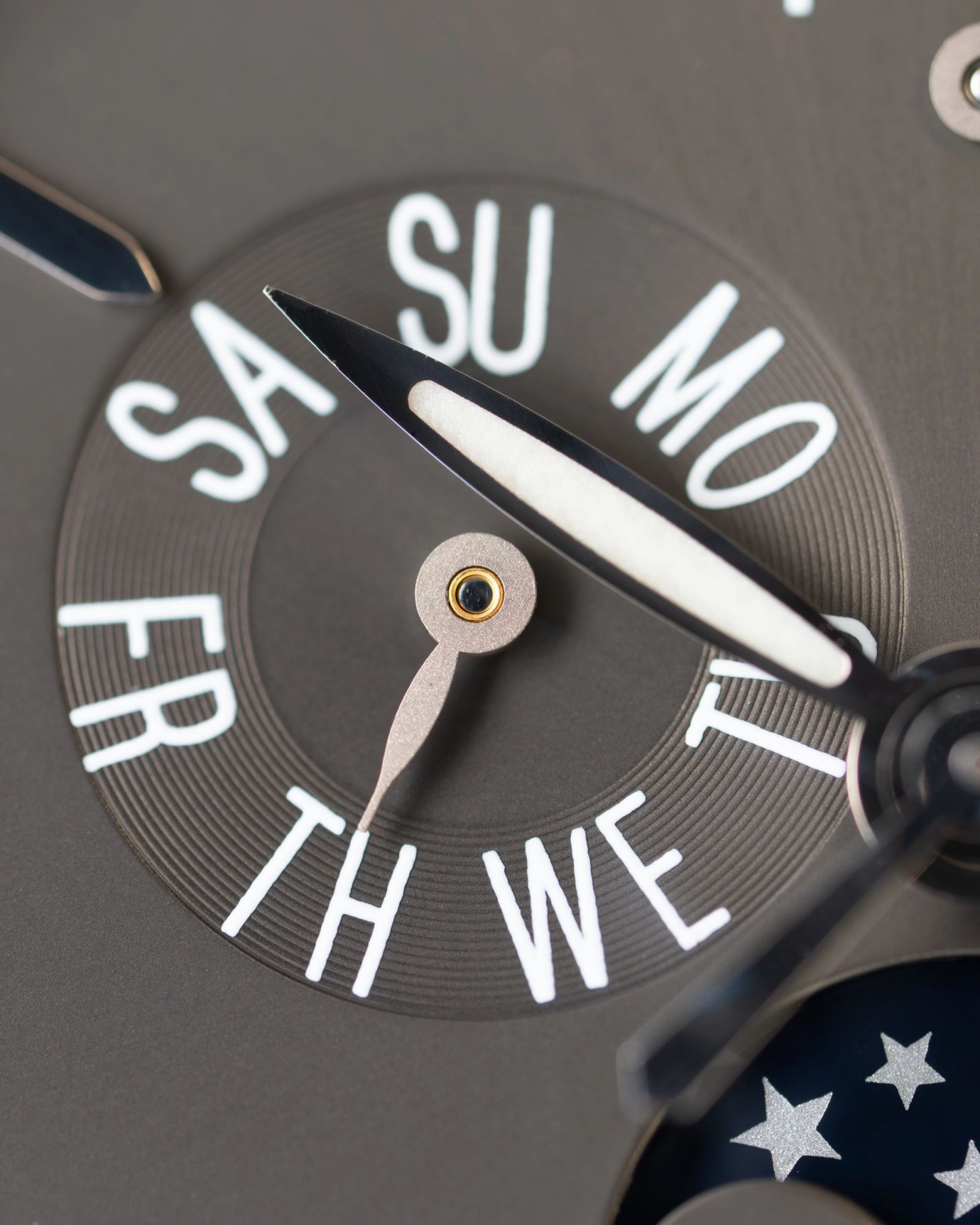 Das Zifferblatt verfügt über aufgesetzte arabische Ziffern bei 3, 9 und 12, Stab-Stundenmarkierungen und elegante Feuille (blattförmige) Zeiger. Die Jahreskalenderkomplikation wird klar auf den Zifferblättern angezeigt, die das Datum, den Wochentag, den Monat, die Gangreserve und die Mondphase zeigen.
