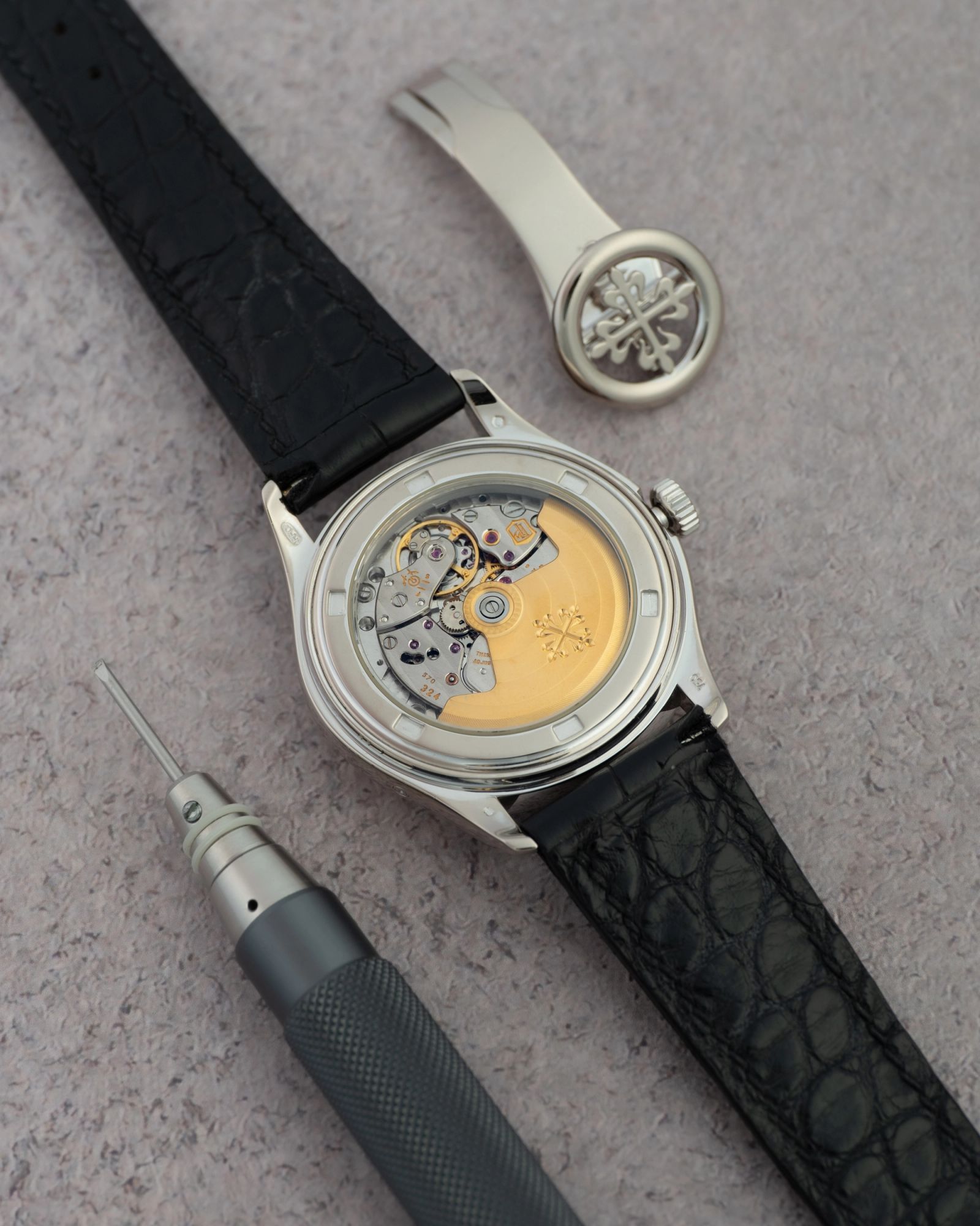 Das Gehäuse aus Weißgold ist an einem schwarzen Krokodillederarmband befestigt, das mit der originalen 18k Weißgold-Faltschließe von Patek Philippe ausgestattet ist. Die Uhr wird komplett mit dem „Extract from the Archives“ geliefert (auf unsere Anfrage hin und wird bald erwartet).