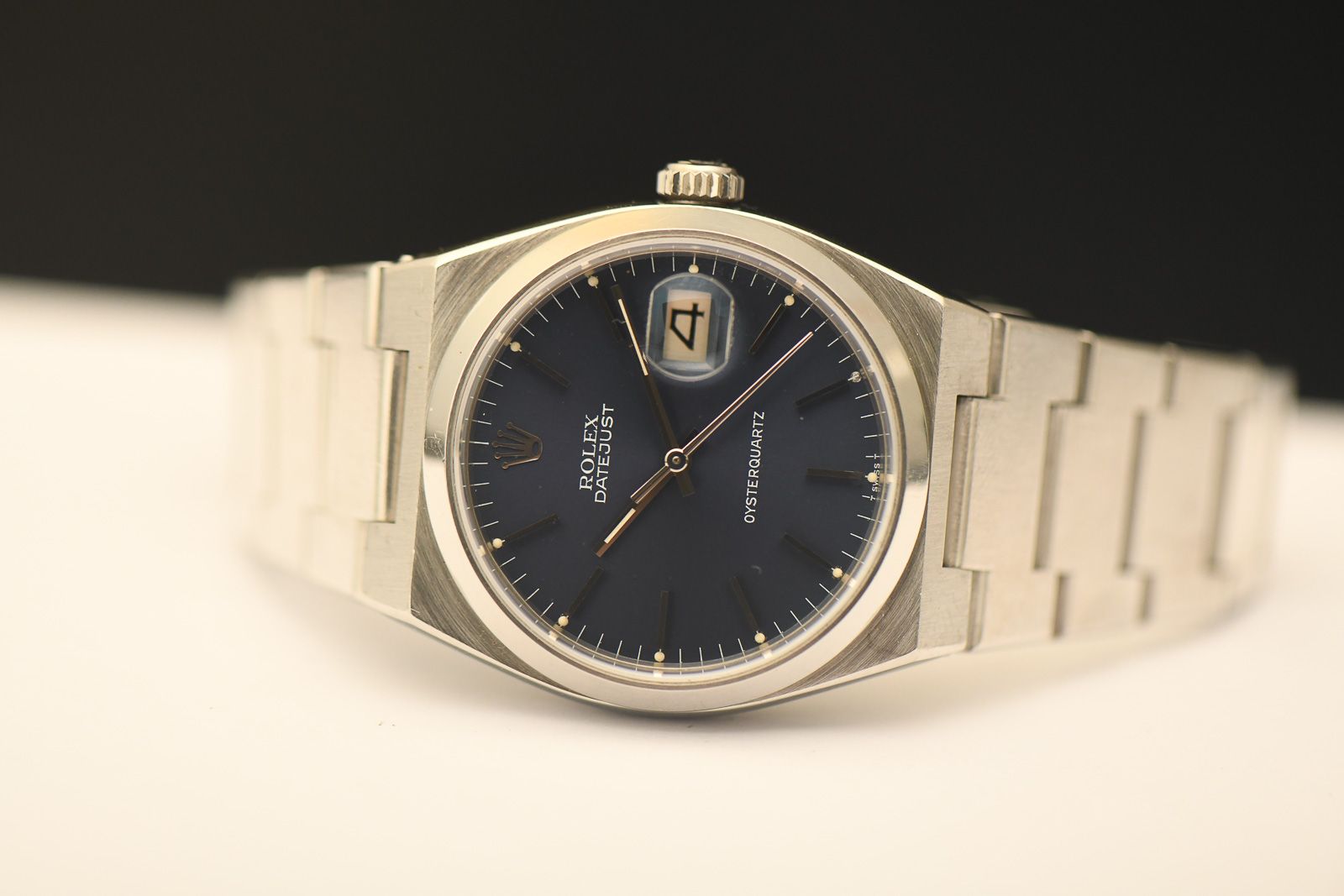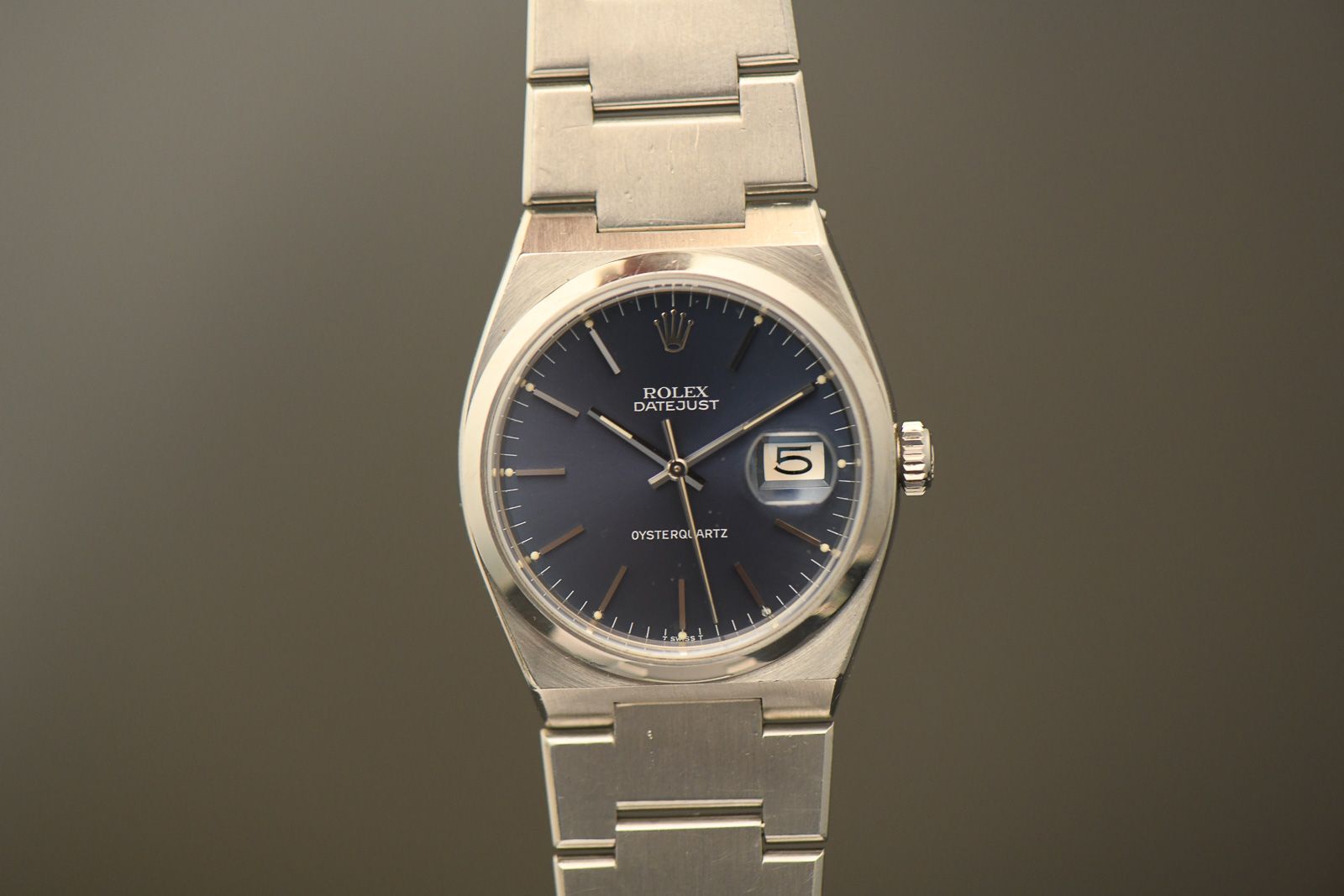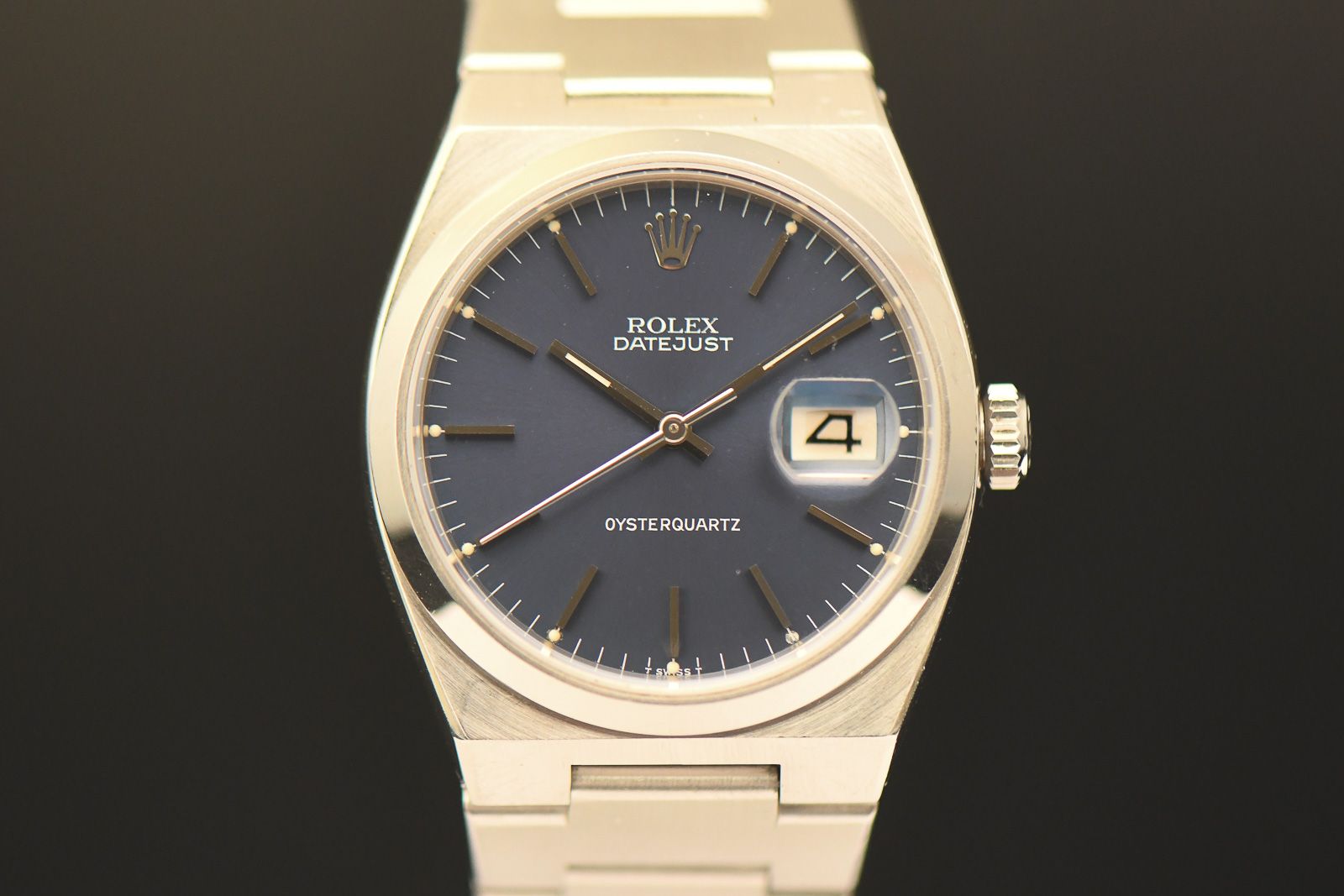 ROLEX 17000 1982 Oysterquartz MK1 Blue Dial. Very beautiful unpolished Rolex 17000 Oysterquatz in steel from 1981 with the rare dial from the first series. The beautiful blue dial is in very good condition, with only one luminous dot at 5 o’clock showing signs of wear. The strap and case are in good worn condition but have not been polished in the past. This is extremely important with this type of case, as they are often polished incorrectly and disproportionately. The movement runs perfectly and had a new battery fitted in November 2025.