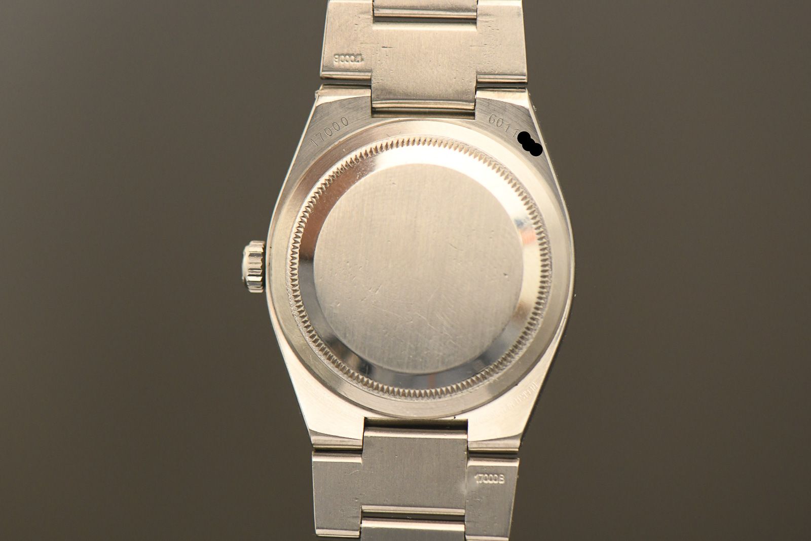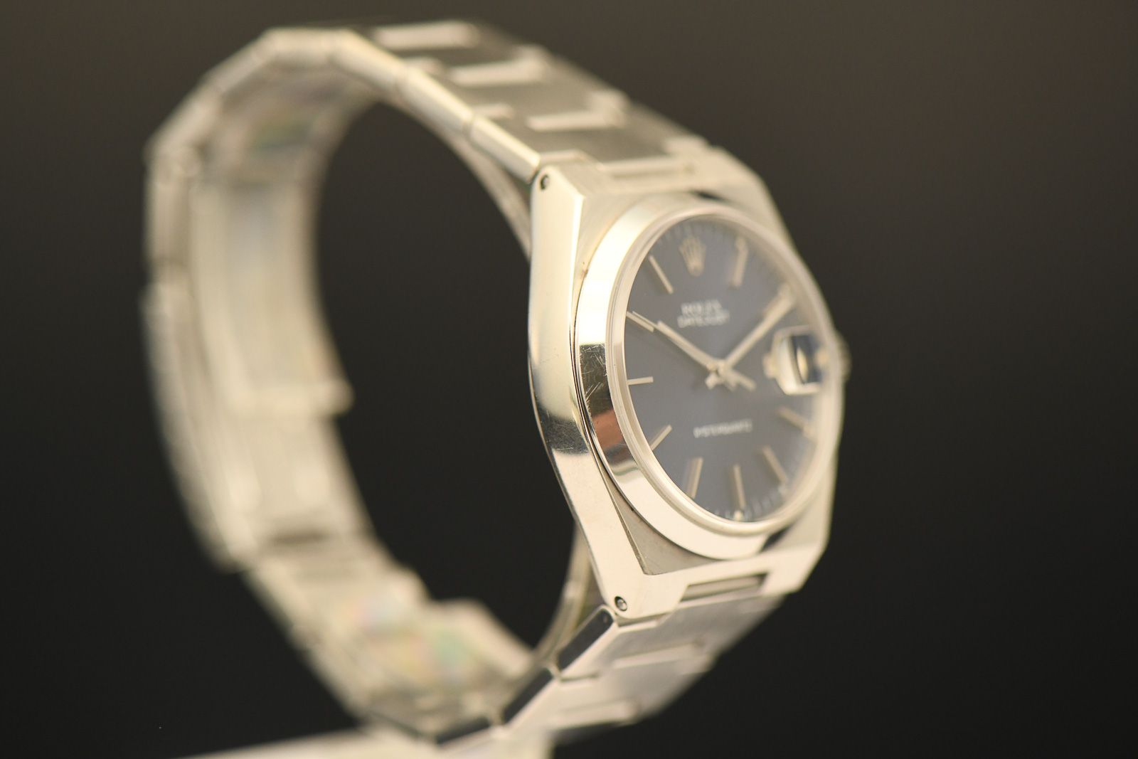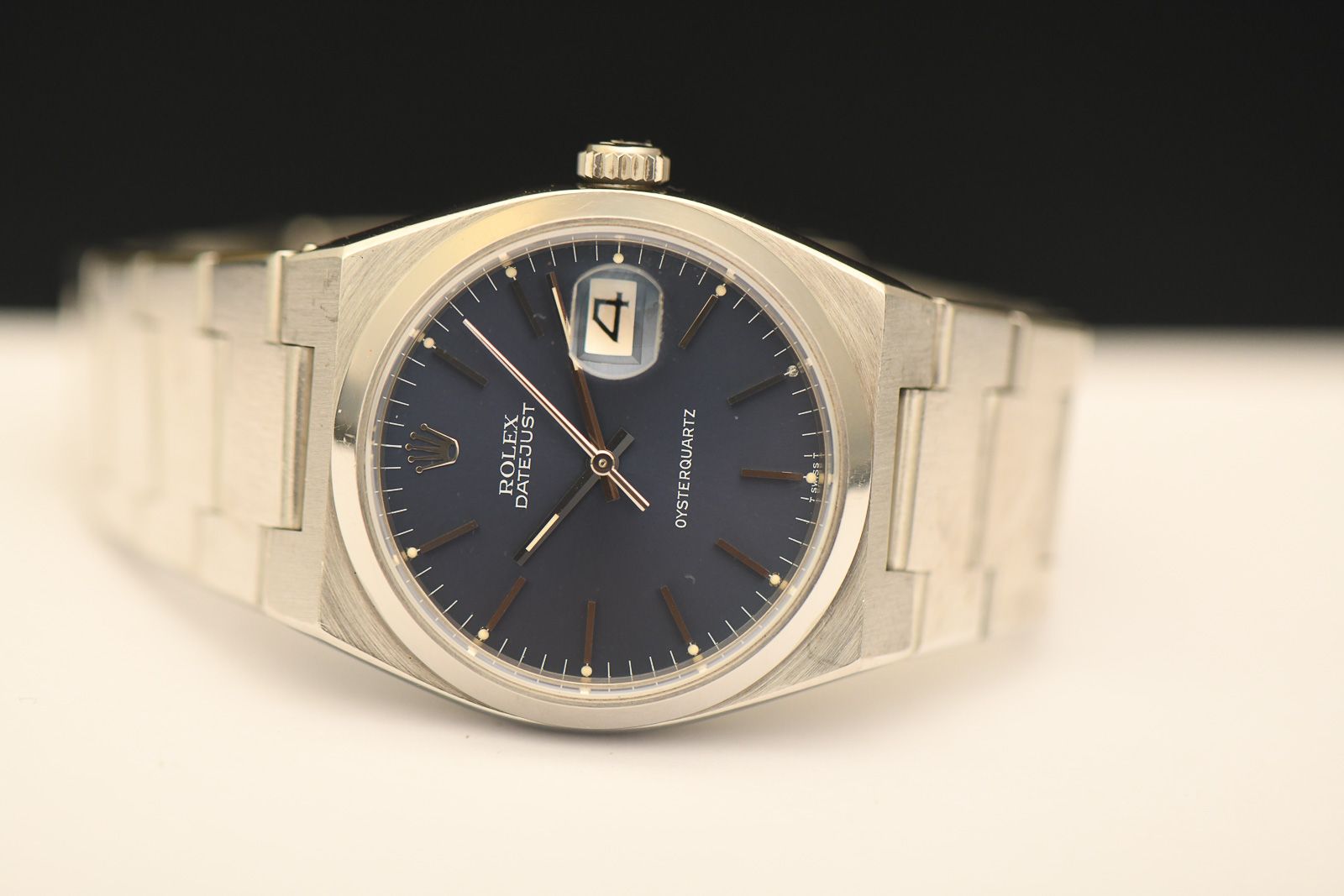 ROLEX 17000 1982 Oysterquartz MK1 Blue Dial. Very beautiful unpolished Rolex 17000 Oysterquatz in steel from 1981 with the rare dial from the first series. The beautiful blue dial is in very good condition, with only one luminous dot at 5 o’clock showing signs of wear. The strap and case are in good worn condition but have not been polished in the past. This is extremely important with this type of case, as they are often polished incorrectly and disproportionately. The movement runs perfectly and had a new battery fitted in November 2025.