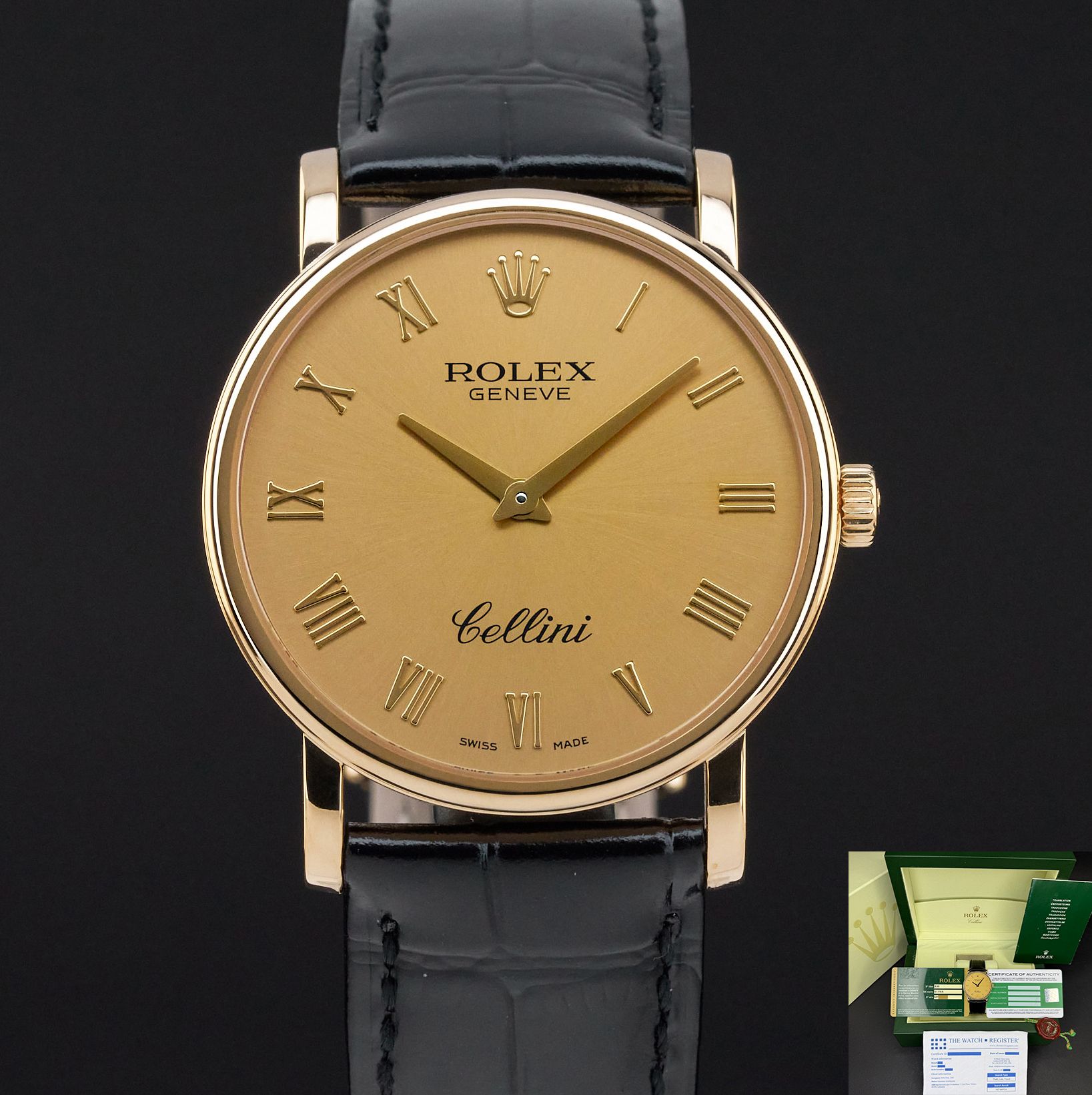 Diese Rolex Cellini 5115/8 verfügt über eine champagnerfarbene römische Zifferblatt und ist aus 18 Karat Gelbgold gefertigt, mit einem Produktionsjahr von 2008.