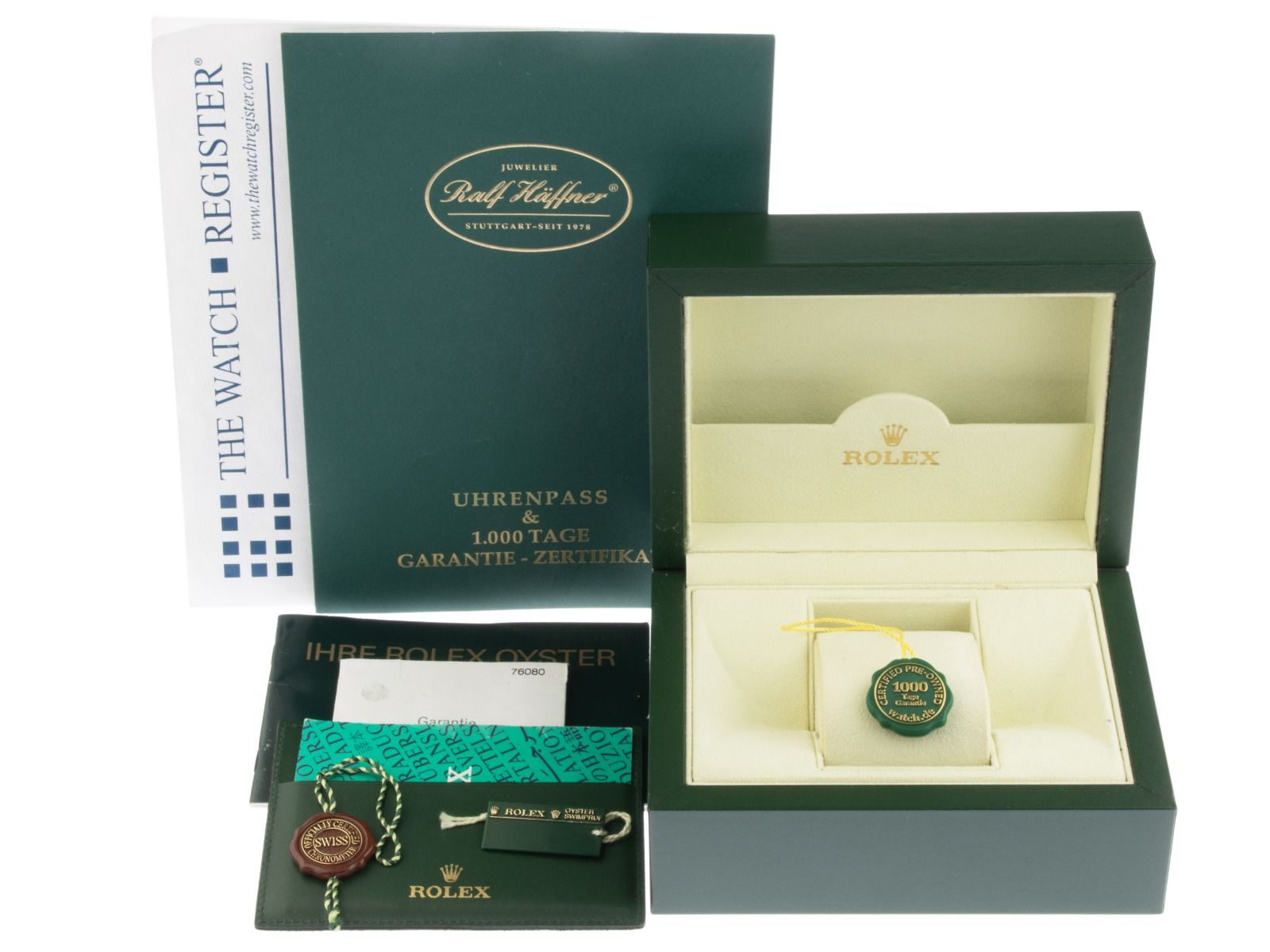 Inklusive certified pre owned Siegel / Uhrenpass mit einem Farbbild, der genauen Beschreibung sowie dem Wiederbeschaffungswert der Uhr über 6800,-€ und 1000 Tage Garantie ab Kaufdatum.