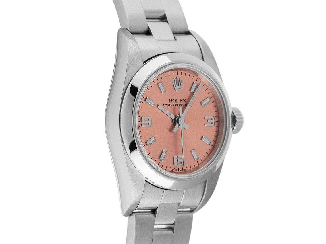 Gehäuse aus poliertem und satiniertem Edelstahl, Gehäusedurchmesser ohne Krone 25mm, Gehäusehöhe 9,5mm. Lünette aus glattem und poliertem Edelstahl. Armband Oyster aus poliertem und satiniertem Edelstahl, Rolex Faltschließe aus Edelstahl mit Hersteller-Logo. Zifferblatt in rosé mit aufgesetzten weißgoldenen Indexen und arabischen Ziffern sowie weißgoldenen Zeigern. Uhrwerk Automatik, Rolex Manufakturkaliber 2230 mit 31 Edelsteinen. Anzeige von Stunde, Minute und Sekunde über Zeiger aus der Mitte mit Sekundenstopp zur sekundengenauen Einstellung der Uhrzeit. Saphirglas kratzfest. Verschraubbare Krone mit Hersteller-Logo. Boden aus Edelstahl verschraubt. Gewicht der Uhr inklusive Armband 48g, Länge des Armbandes inklusive Gehäuse 160mm. Referenznummer: 76080, Gehäusenummer: Z102XXX, Baujahr: 2006, ID: P162264000925H-6800, Artikelnummer: 10000082422. Mit Gangkontrolle und kompletter äußerlicher Aufarbeitung von September 2025. Original Rolex Box mit Umkarton und Garantiepapieren von Mai 2007, LC 413 / Korea sowie Beschreibung, Ledermäppchen, Übersetzungsheft, Rolex Chronometer-Siegel, Tag und Watchregister-Auszug von September 2025, The Watch Register Zertifikat / ohne Eintrag (Internationale Datenbank für verlorene oder gestohlene Uhren), Full Set. Fast nicht getragen, sehr seltenes Sammlerstück. Sehr guter Zustand. Lieferzeit sofort.