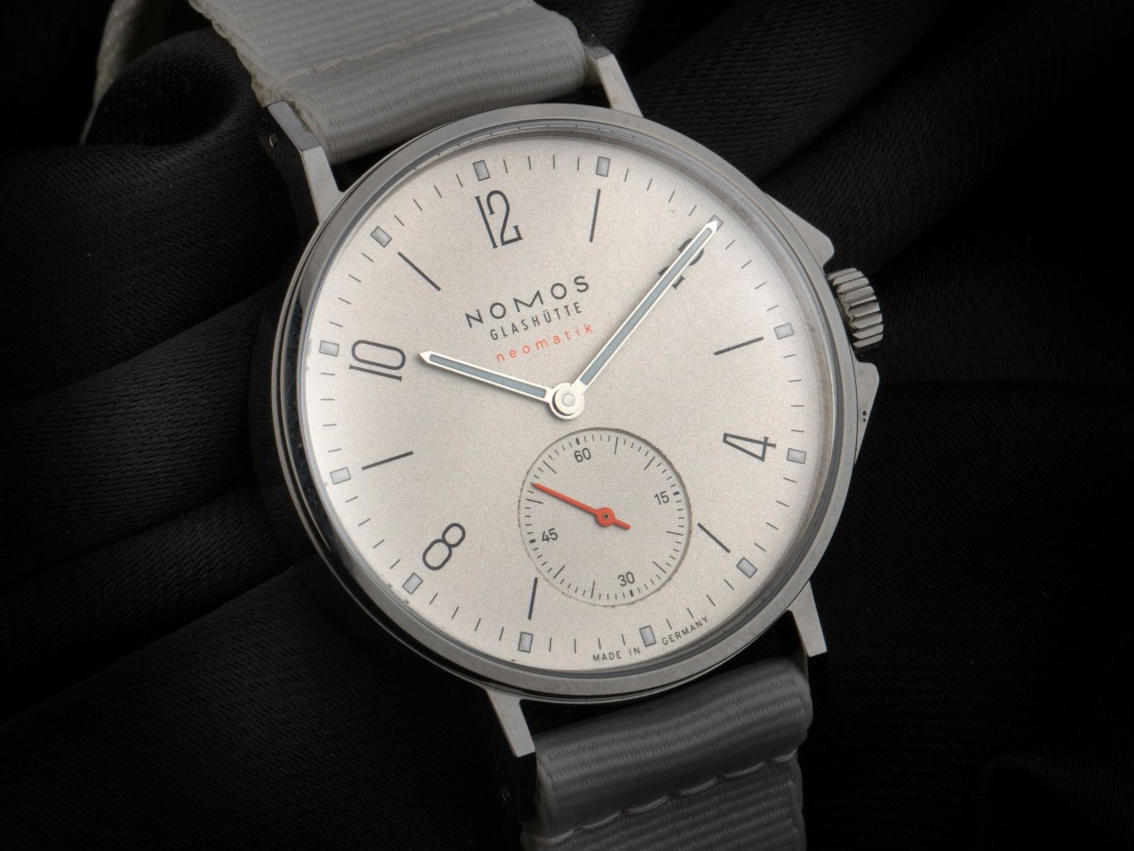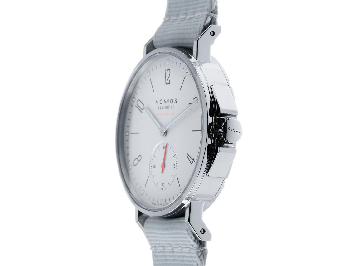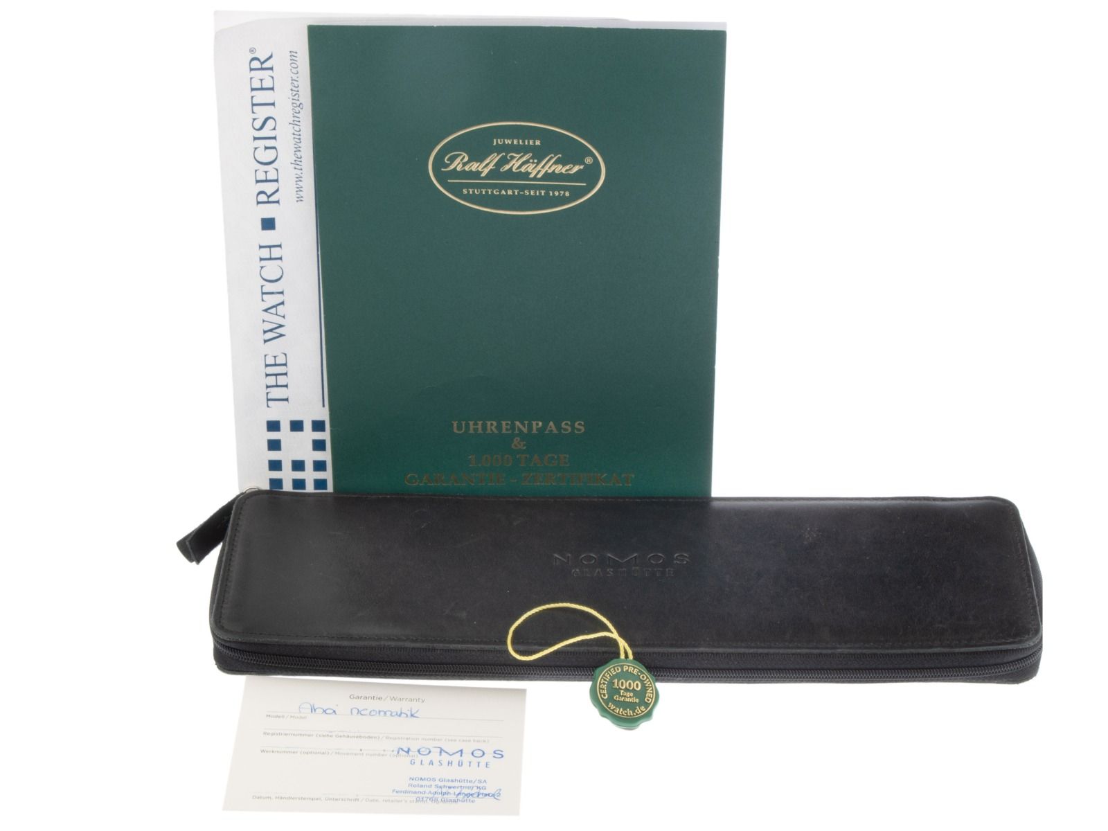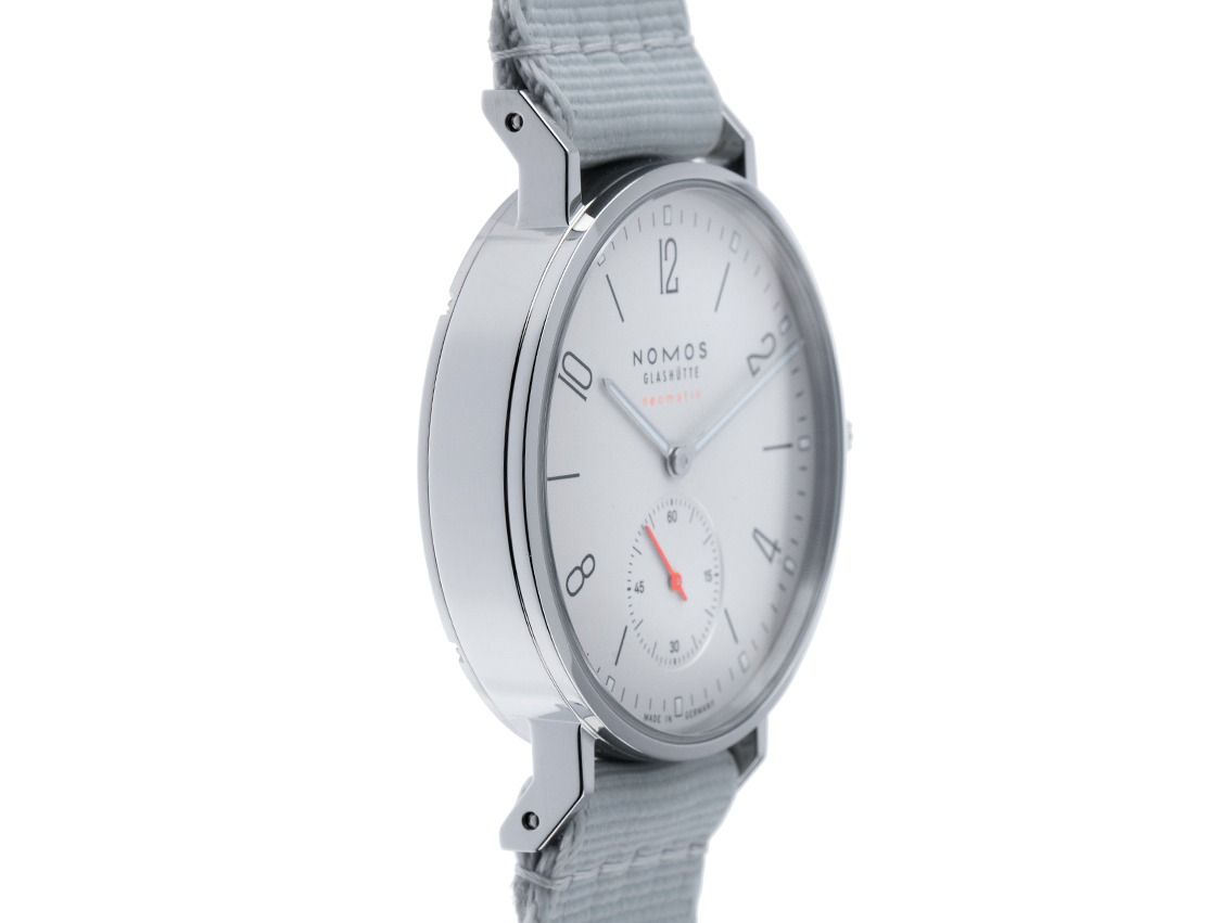 Gehäuse aus poliertem Edelstahl, Gehäusedurchmesser ohne Krone 36mm, Gehäusehöhe 9,6mm. Armband aus wasserfestem Textil in hellgrau, Anstoßbreite 18mm, Stiftschließe aus poliertem Edelstahl mit Hersteller-Logo. Zifferblatt in Weiß, versilbert galvanisiert mit schwarzen Indizes und arabischen Ziffern sowie Zeigern aus Edelstahl und einem neonorangefarbenen Sekundenzeiger. Uhrwerk Automatik, Nomos Manufakturkaliber DUW3001 mit 27 Edelsteinen. Anzeige von Stunde und Minute über Zeiger aus der Mitte, kleine Sekunde mit Sekundenstopp zur sekundengenauen Einstellung der Uhrzeit bei 6 Uhr. Saphirglas kratzfest. Verschraubbare Krone mit Flankenschutz und Hersteller-Logo. Boden aus Edelstahl, 6-fach verschraubt und graviert mit Saphirglas-Sichtfenster. Gewicht der Uhr inklusive Armband 53g. Referenznummer: 560, Gehäusenummer: 3XXX, ID: KK176732001225H-3540, Artikelnummer: 10000084024. Mit Gangkontrolle und kompletter äußerlicher Aufarbeitung von Dezember 2025. Original Nomos Box und Garantie-Papiere von Mai 2021 sowie Watchregister-Auszug von Dezember 2025, The Watch Register Zertifikat / ohne Eintrag (Internationale Datenbank für verlorene oder gestohlene Uhren), Full Set. Wie Neu. Lieferzeit sofort.