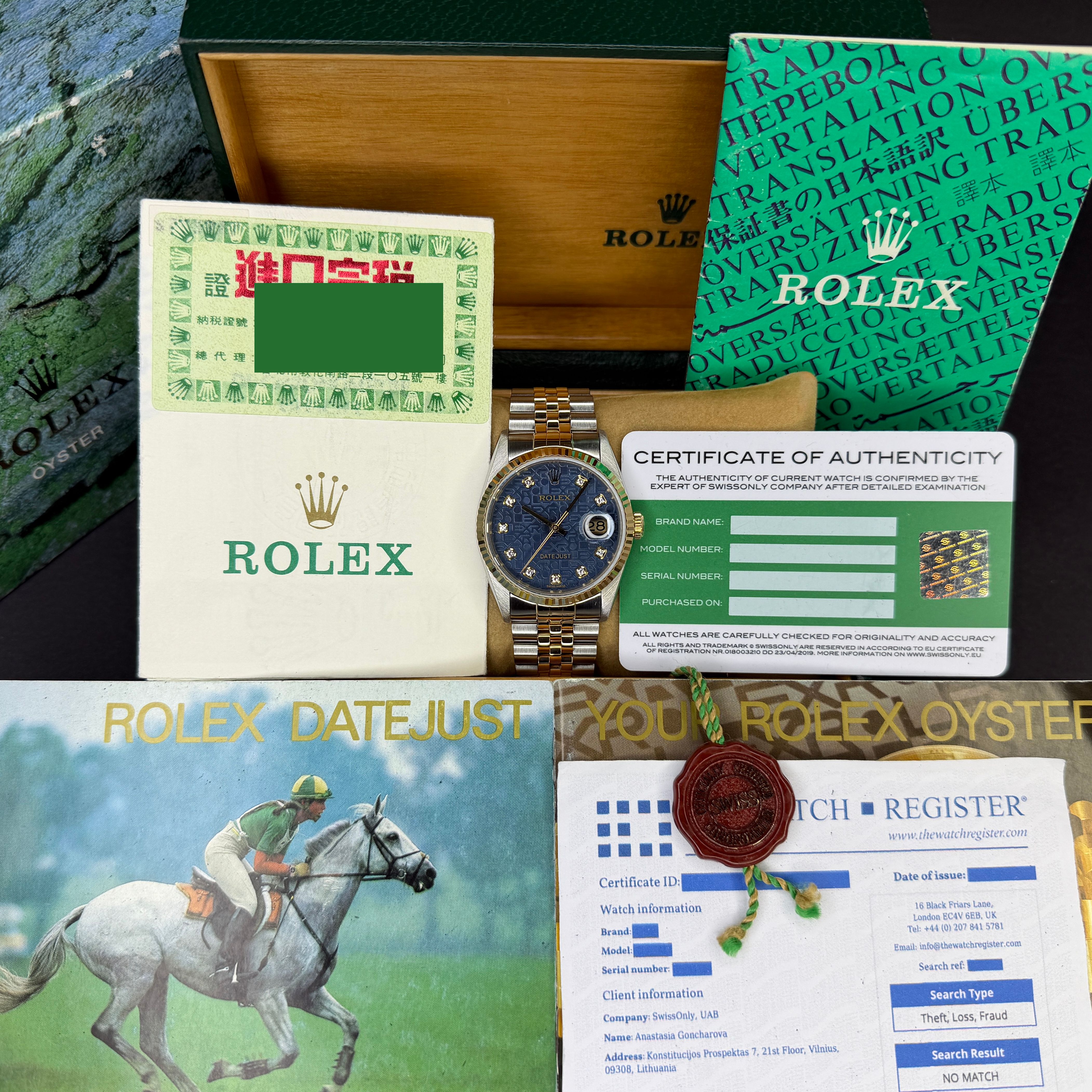 Rolex Datejust 36 Rolex Datejust, 16233, 36mm, 1993, Two-Tone, Blue Jubilee Big Diamond dial, Fullset, 1y warranty