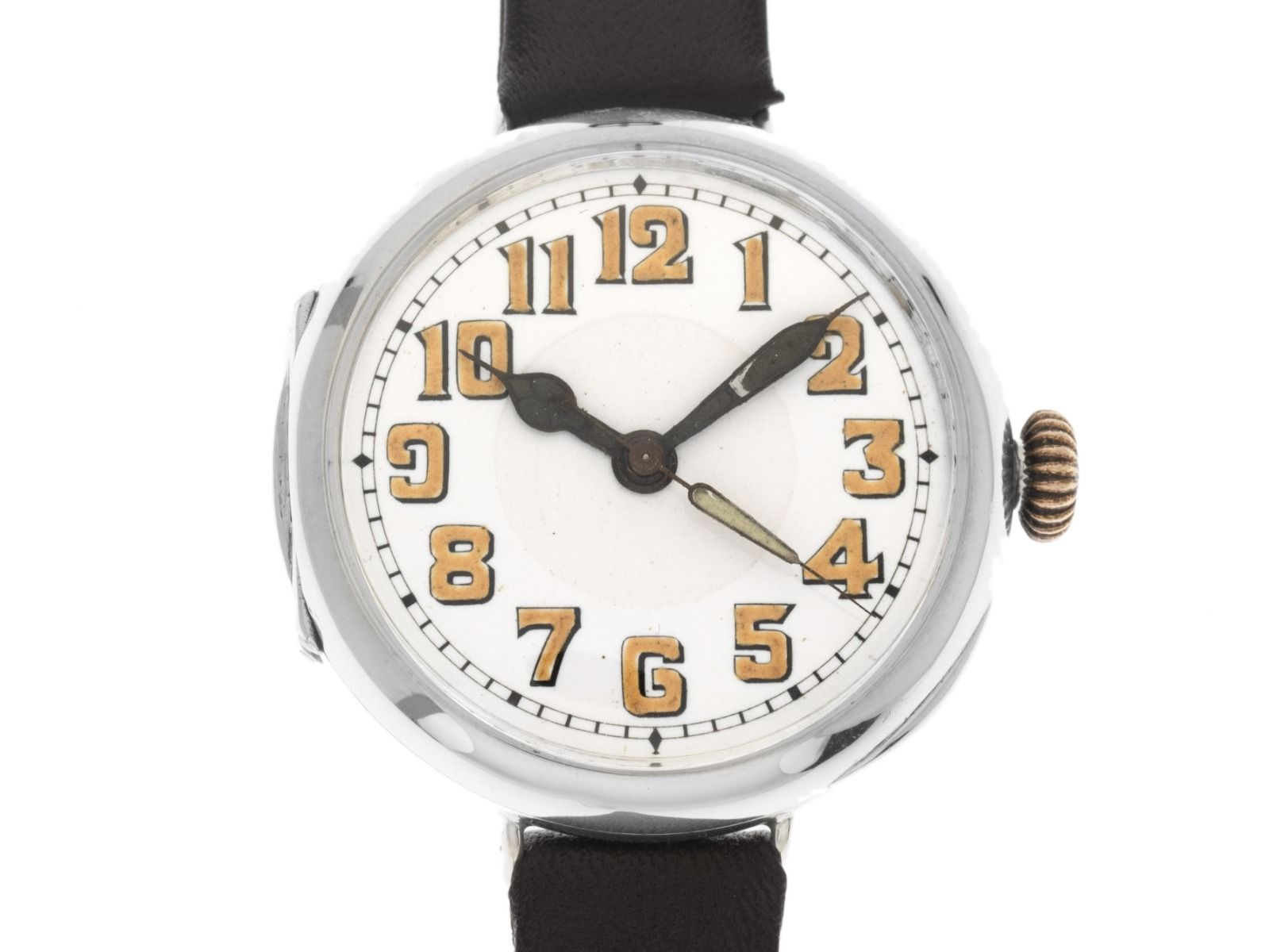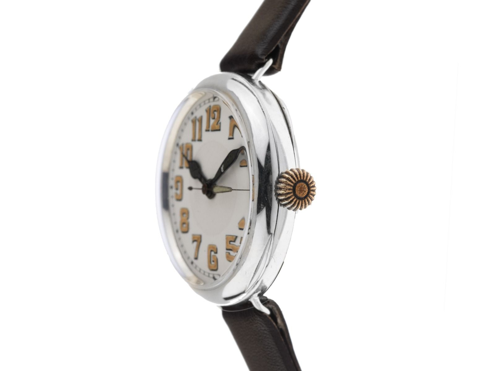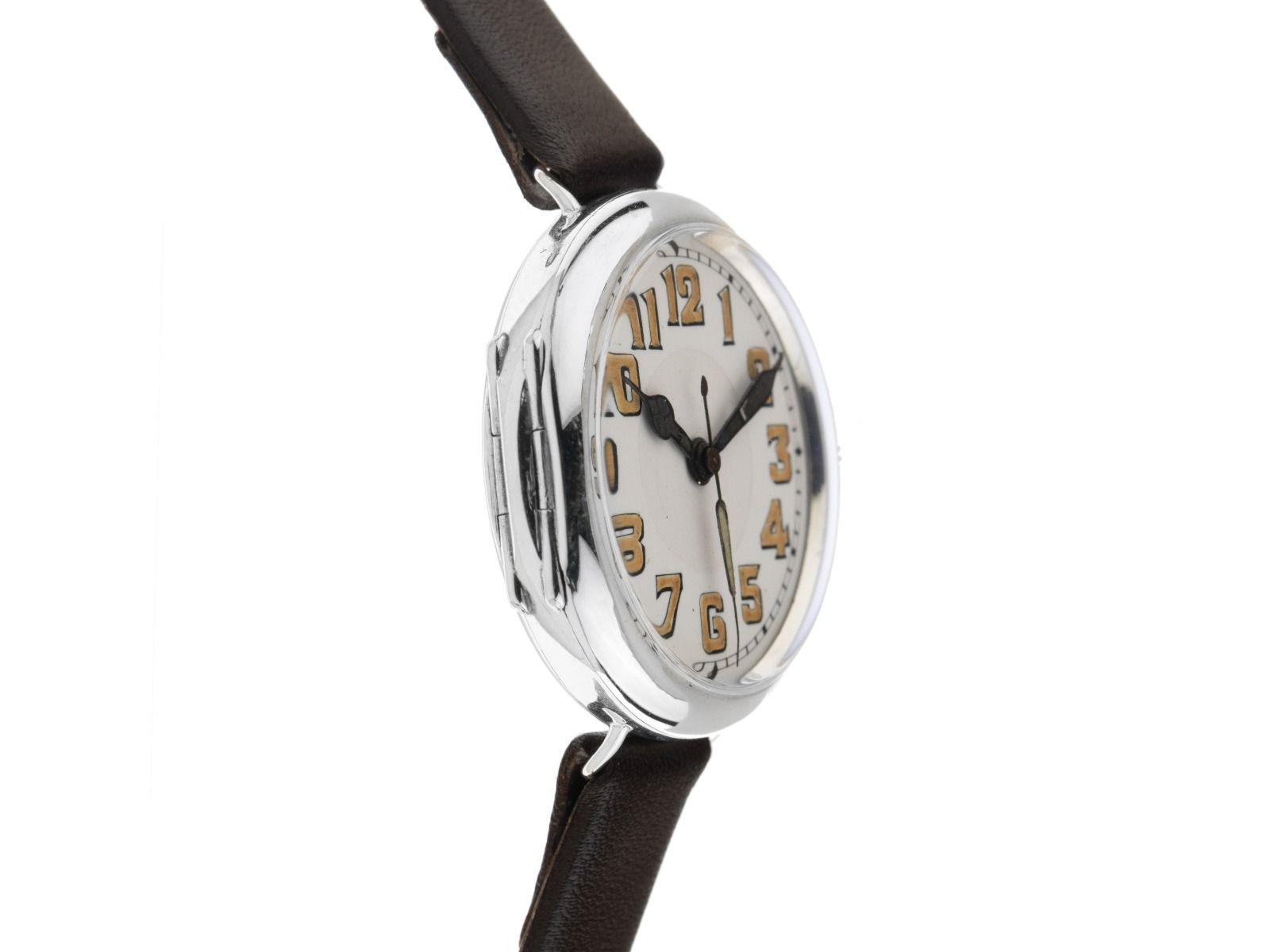 Gehäuse 935 Silber poliert, Gehäusemaße ohne Krone 34mm, Gehäusehöhe 11,4mm. Armband Leder braun, Anstoßbreite 12mm, Original Rolex Stiftschließe Edelstahl. Zifferblatt weiß mit arabischen Ziffern und schwarzen Zeigern, patiniert. Uhrwerk Handaufzug mit 15 Edelsteinen. Anzeige von Stunde, Minute und Sekunde über Zeiger aus der Mitte. Plexiglas. Krone geriffelt. Boden 935 Silber mit Klappdeckel. Gewicht der Uhr inklusive Armband 32g. Baujahr: 1915, ID: P209321201225H-4200, Artikelnummer: 10000083772. Mit Gangkontrolle und kompletter äußerlicher Aufarbeitung von Dezember 2025. Mit Gangkontrolle und kompletter äußerlicher Aufarbeitung von Dezember 2025. Original Rolex Box. Sehr seltenes Sammlerstück. Sehr guter Zustand. Lieferzeit sofort.