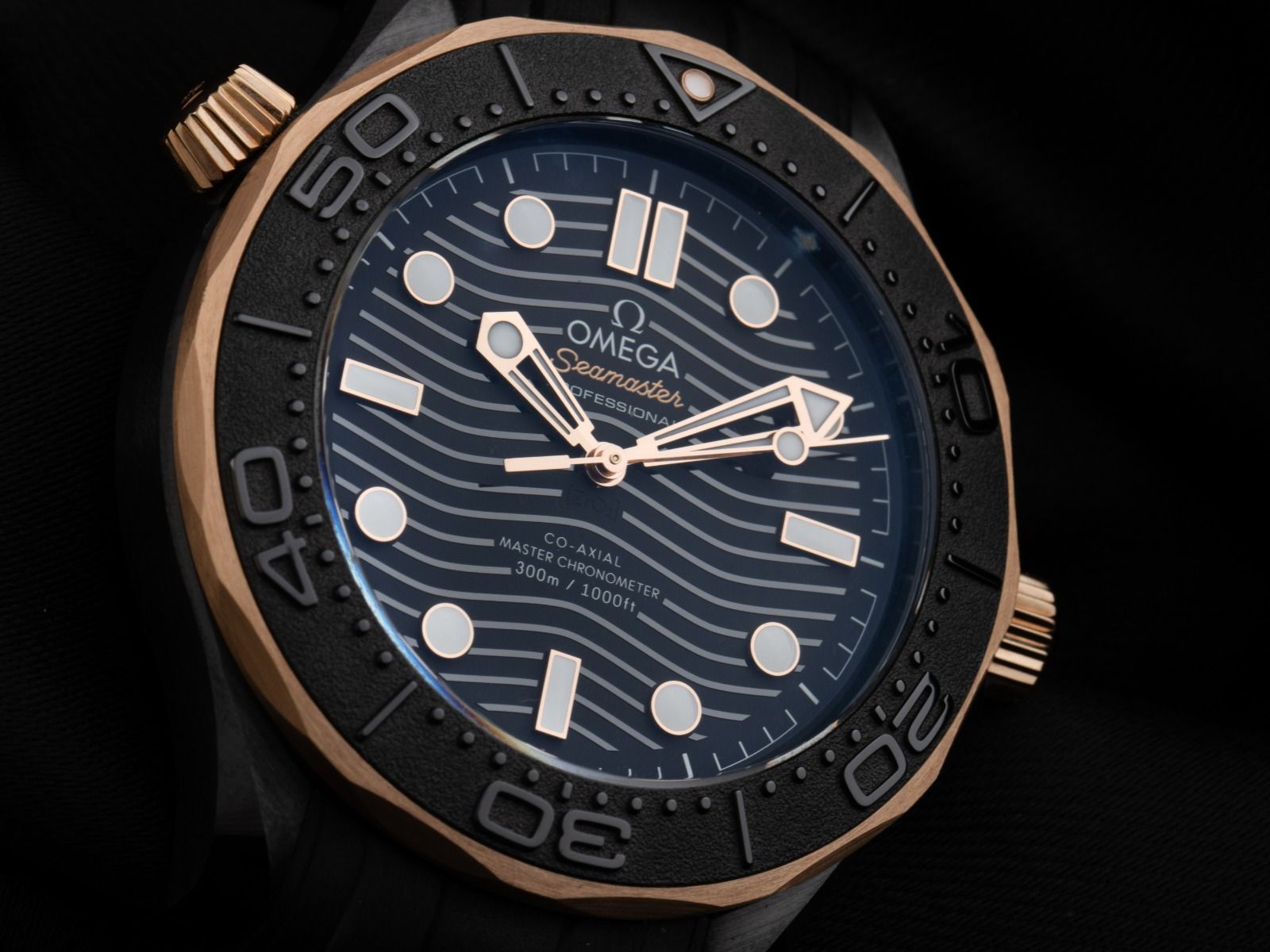 Omega Seamaster Diver 300m Co-Axial Master Chronometer Sedna™-Gold Keramik Automatik Armband Kautschuk