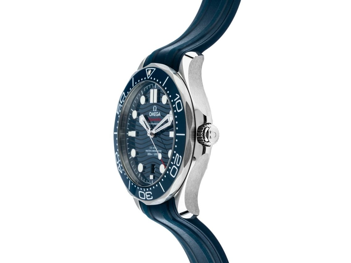 Gehäuse Edelstahl poliert und satiniert, Gehäusedurchmesser ohne Krone 42mm, Gehäusehöhe 13,6mm. Lünette Edelstahl mit blauem Keramik Inlay, 60-Minuten Skala und Leuchtpunkt, einseitig drehbar. Heliumventil bei 10 Uhr. Armband Kautschuk blau, Anstoßbreite 20mm, Stiftschließe Edelstahl mit Hersteller-Logo. Zifferblatt blau mit lasergraviertem Wellen-Muster, aufgesetzten Leuchtindexen und Leuchtpunkten sowie skelettierten Edelstahl Leuchtzeigern. Uhrwerk Automatik, Chronometer mit Zeugnis, Omega Manufakturkaliber 8800 mit 35 Edelsteinen, Co-Axial Hemmung und Gangreserve ca. 55 Stunden. Anzeige von Stunde, Minute und Sekunde über Zeiger aus der Mitte mit Sekundenstopp zur sekundengenauen Einstellung der Uhrzeit, Datumsanzeige mit Schnellverstellung bei 6 Uhr. Saphirglas kratzfest, gewölbt und doppelseitig entspiegelt. Krone verschraubbar mit Flankenschutz und Hersteller-Logo. Boden Edelstahl verschraubt und graviert mit Saphirglas Sichtfenster. Gewicht der Uhr inklusive Armband 112g. Wasserdicht bis 30 ATM. Referenznummer: 210.32.42.20.03.001, ID: ST116085581225H-6100, Artikelnummer: 10000084111. Original Omega Box mit Umkarton und Garantie Papiere von Dezember 2025 sowie Beschreibung, Full Set. Ungetragen. Lieferzeit sofort.