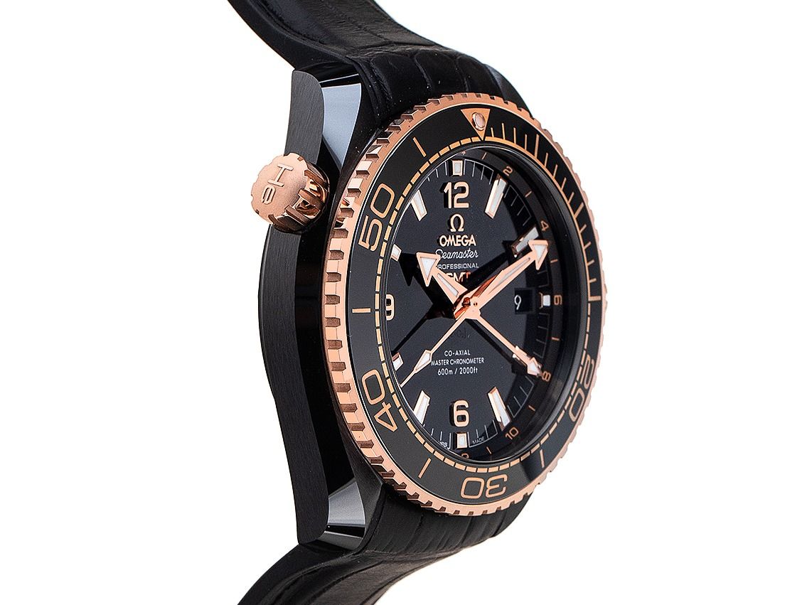 Omega Seamaster Planet Ocean 600M Deep Black Co-Axial Master Chronometer GMT Keramik Sedna™-Gold Automatik Armband Krokoleder Kautschuk Faltschließe