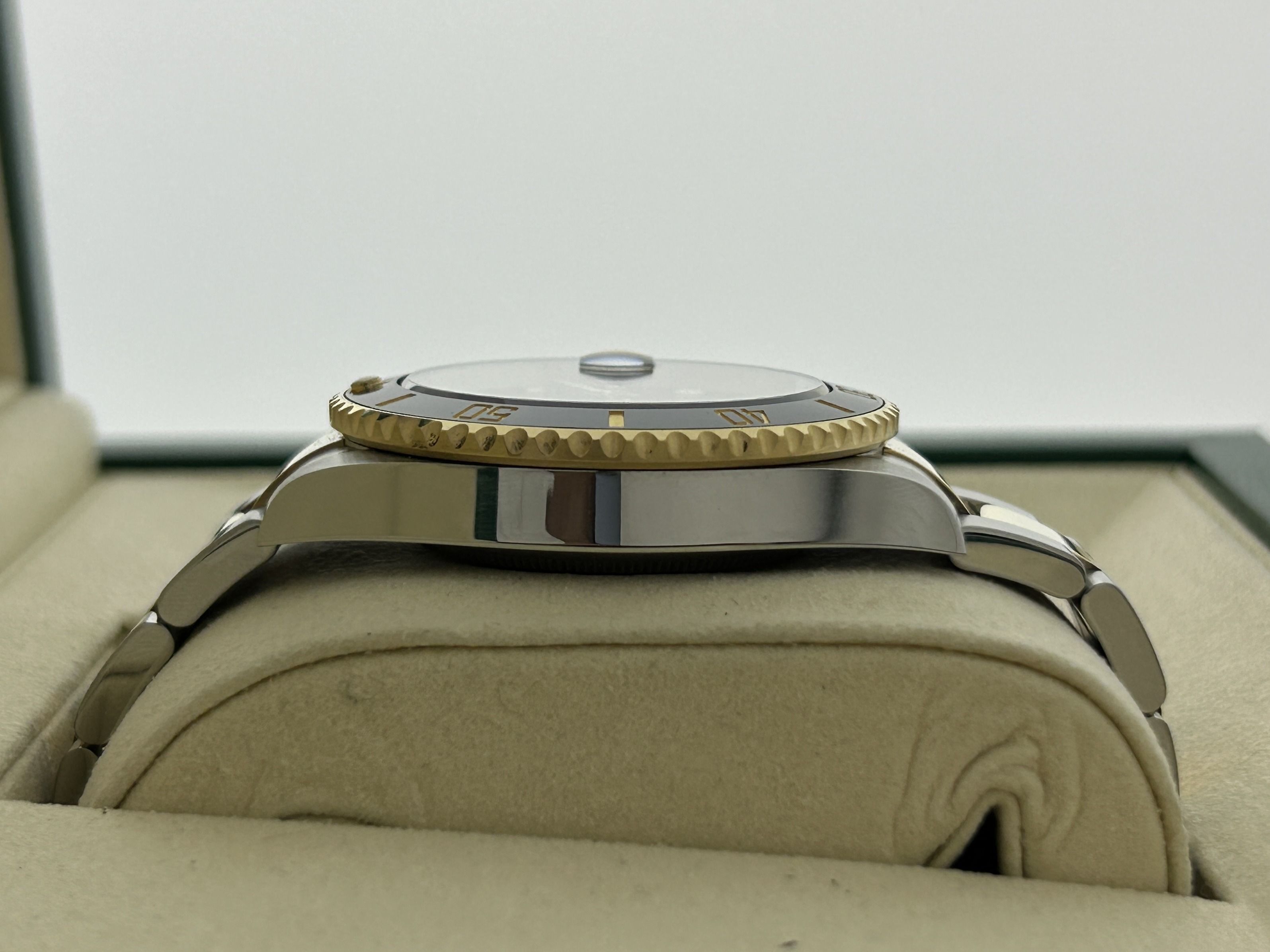 Eine Gold/Stahl Rolex Submariner Date, Ref. 126613LN, Fullset, aus 2025. Die Rolex hat ein 40 mm Gehäuse aus Gold und Stahl mit einem Gold/Stahl Oyster-Armband. Die Uhr verfügt über eine schwarze Zifferblatt mit einer goldenen Lünette und einem schwarzen Einsatz sowie einem Datumsfenster bei 3 Uhr. Die Rolex ist komplett mit der originalen Box und dem Zertifikat. Die Uhr ist wie neu, mit einigen Aufklebern.