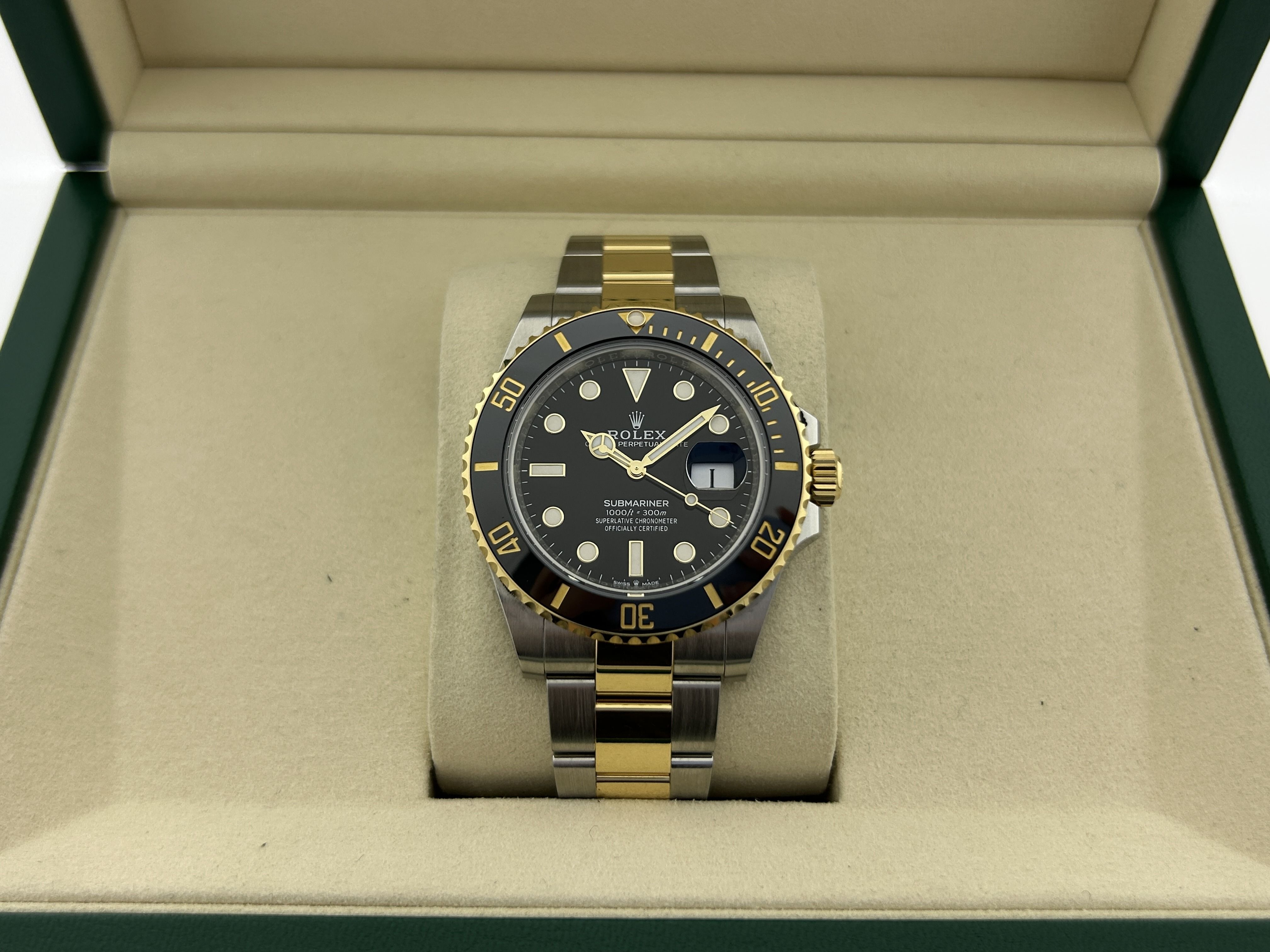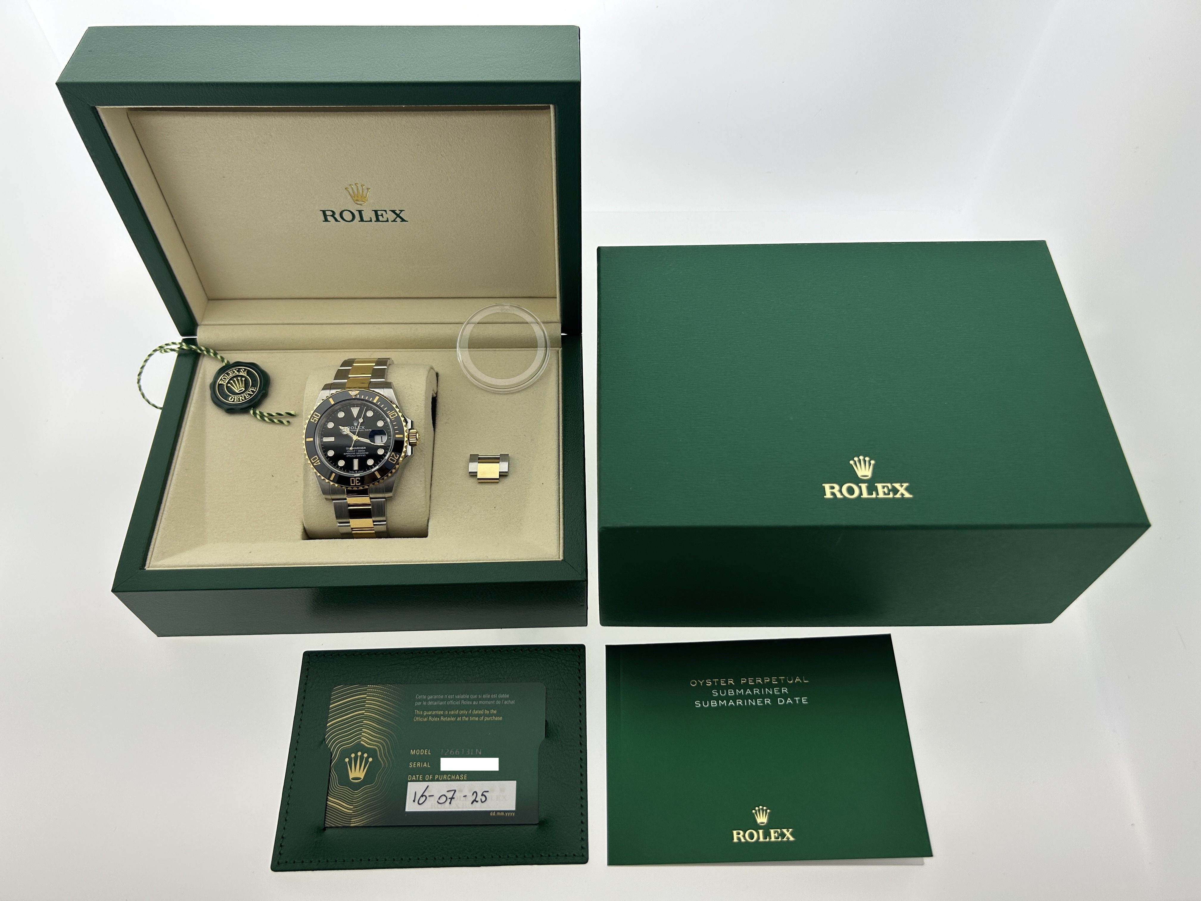 The Rolex comes with the international Rolex warrantyA gold/steel Rolex Submariner Date, ref. 126613LN, fullset, from 2025. The Rolex has a gold/steel 40mm case with a gold/steel Oyster-bracelet. The watch has a black dial with a gold bezel and a black insert and a date-window at 3 o'clock. The Rolex is complete with the original box and certificate. The watch is like new, with some stickers.