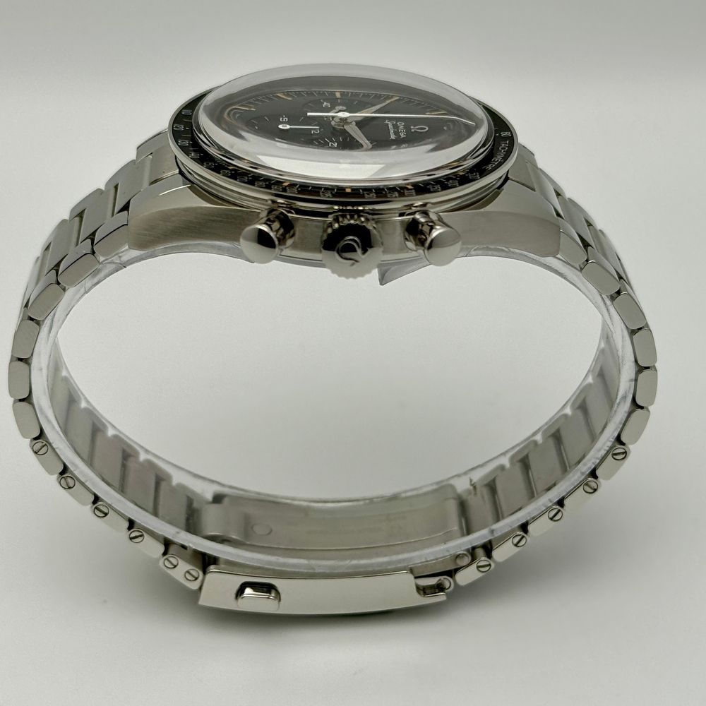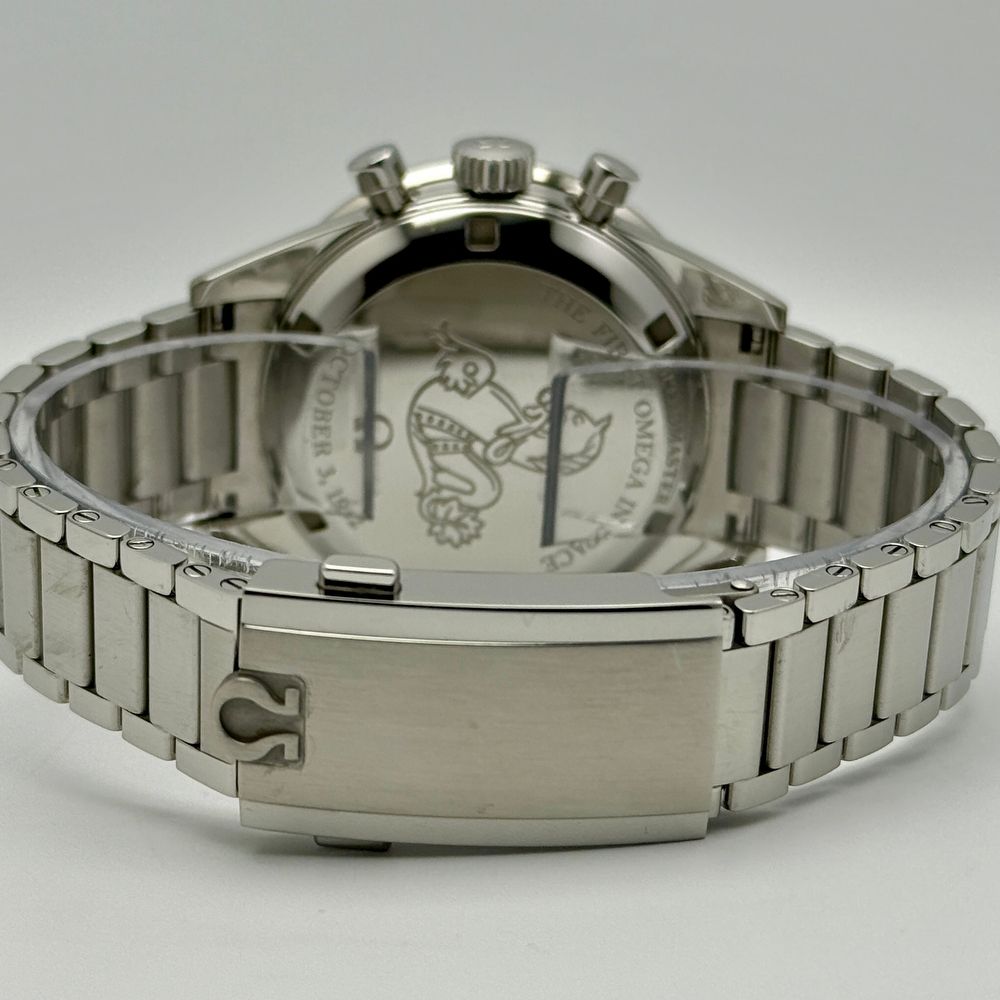 A sapphire crystal on the front ensures clarity and scratch resistance, while the sapphire exhibition case back reveals the beautifully finished movement and special engravings dedicated to the “First OMEGA in Space” theme. The black aluminum tachymeter bezel with “Dot Over Ninety” maintains the classic Speedmaster identity. Water resistance of 50 meters and the compact case size make this model versatile for daily wear. The watch is fitted on a stainless steel flat-link bracelet with Omega’s comfort release adjustment system.