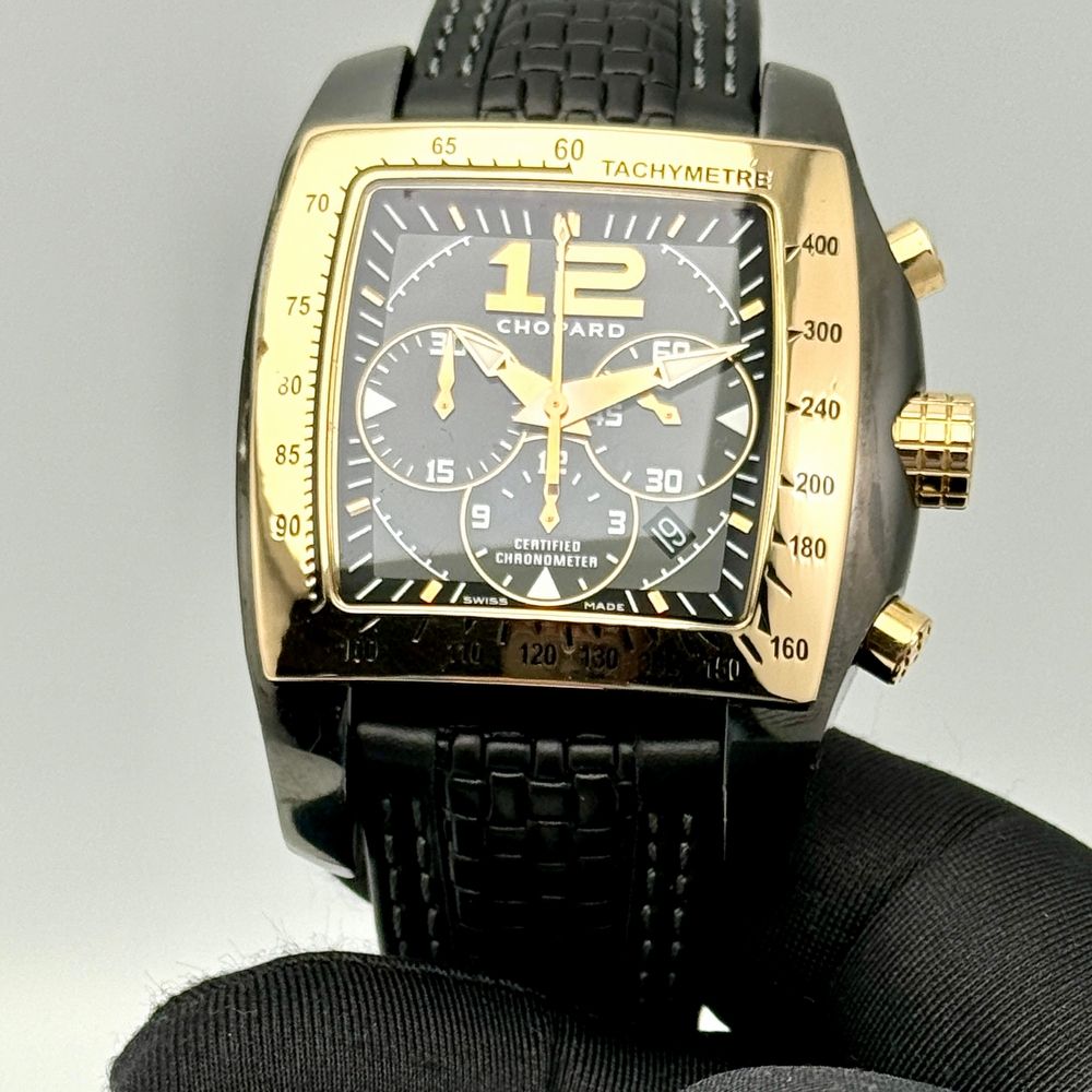 Founded in 1860 in Sonvilier, Switzerland, Chopard is renowned for its refined craftsmanship, technical expertise, and elegant design language. Alongside its haute joaillerie heritage, Chopard has built a strong reputation in high-end sports watchmaking. The Two O Ten collection represents a bold and modern chapter in the brand’s history, combining luxury materials with professional chronograph performance.The Chopard Two O Ten Chronograph Limited Edition, reference 8961, features a robust 43 mm case crafted from black DLC-coated stainless steel, accented by a unidirectional rotating bezel in 18k rose gold. The black dial is highlighted by rose gold details and luminous hands and markers, creating a striking contrast and a distinctly sporty yet luxurious appearance. This model is part of a limited edition of only 500 pieces worldwide.