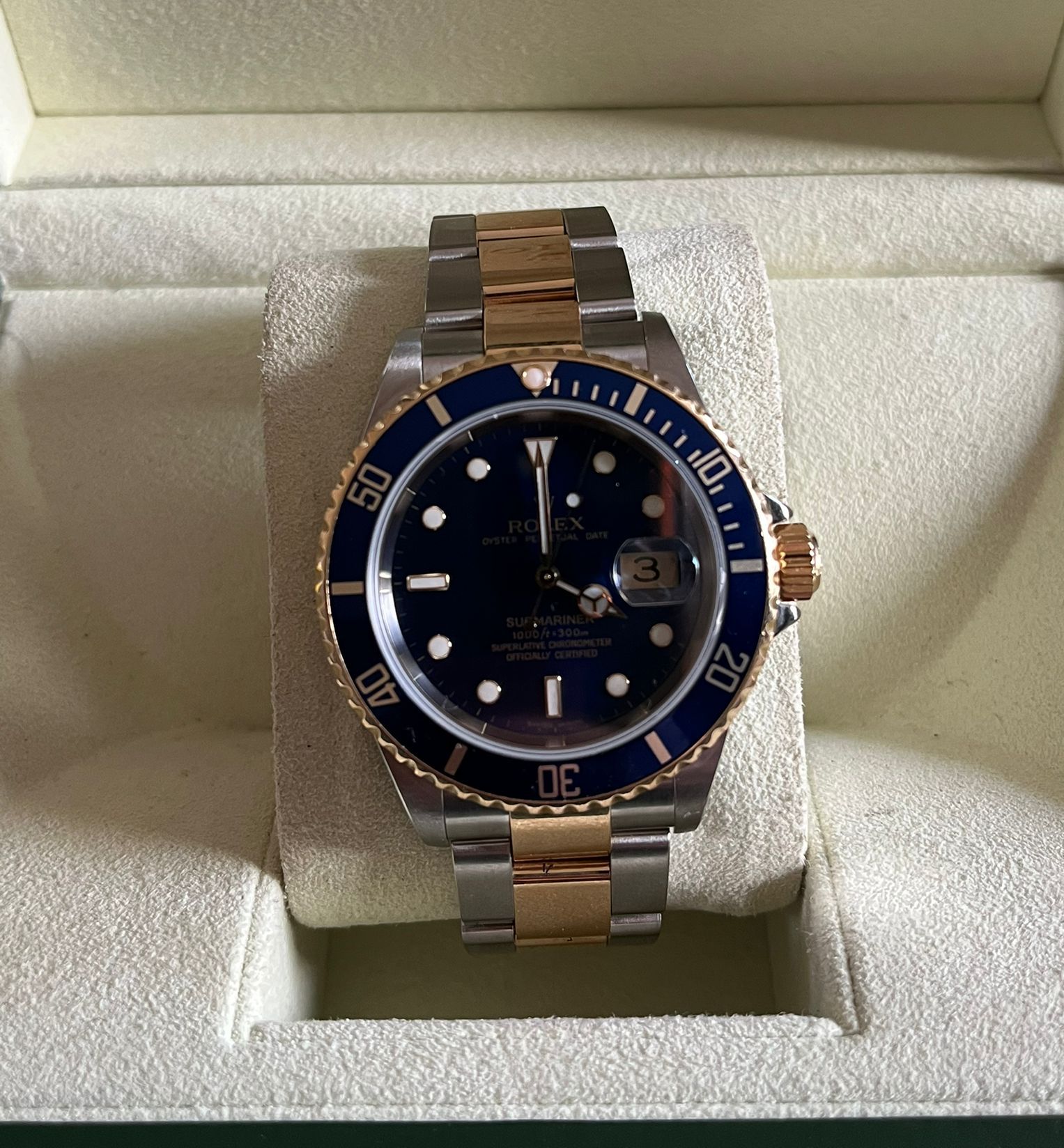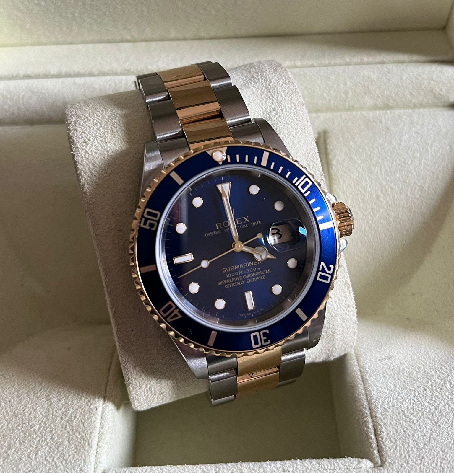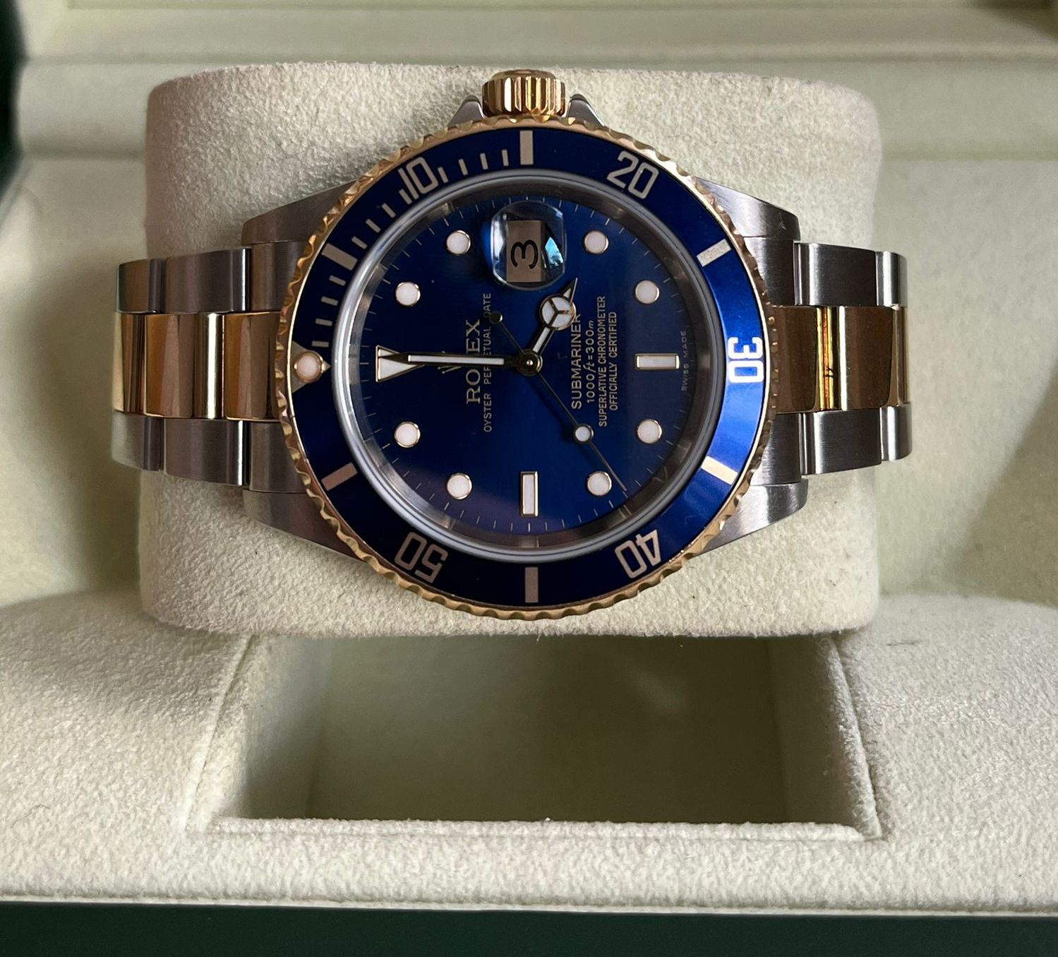 This stunning Rolex Submariner Date ref. 16613LB is presented in the iconic blue and yellow gold “Bluesy” configuration—one of the most recognizable and sought-after versions within the Submariner collection. The vibrant blue dial and matching blue bezel, combined with the rich yellow gold accents and robust stainless steel and gold Oyster bracelet, create a perfect balance between sporty character and unmistakable luxury. This example is dated 2007 and is offered with the original Rolex box, along with service papers from Tempus dated January. A fantastic opportunity to acquire a highly desirable Submariner in an attractive and well-documented configuration.⸻