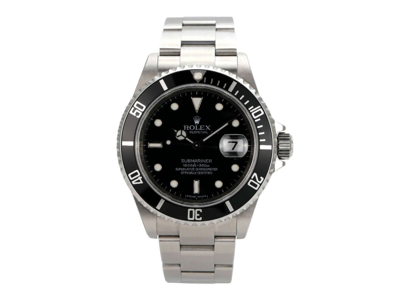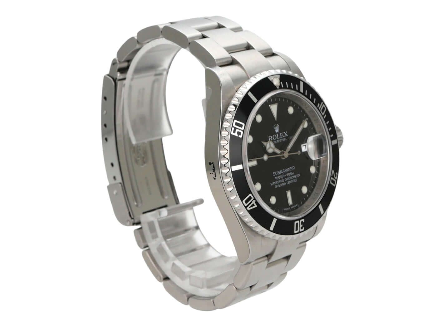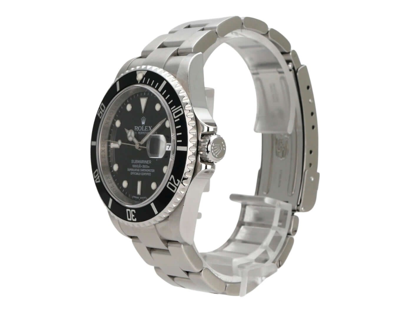 Rolex Submariner Date Ref. 16610 stainless steel from 2008Case made of polished and satin-finished stainless steel, case diameter 40 mm, stainless steel bezel fluted and rotatable with black insert, 60-minute scale and luminous dot, Oyster bracelet made of satin-finished stainless steel with folding clasp, black dial with applied luminous indices and luminous dots, automatic movement, Rolex manufacture caliber 3135, frequency 28,800 A/h, power reserve approx. 48 hours, date display with magnifying glass at 3 o'clock, chronometer, scratch-resistant sapphire crystal, screw-down crown with flank protection, screw-down stainless steel case back, water-resistant up to 30 bar.