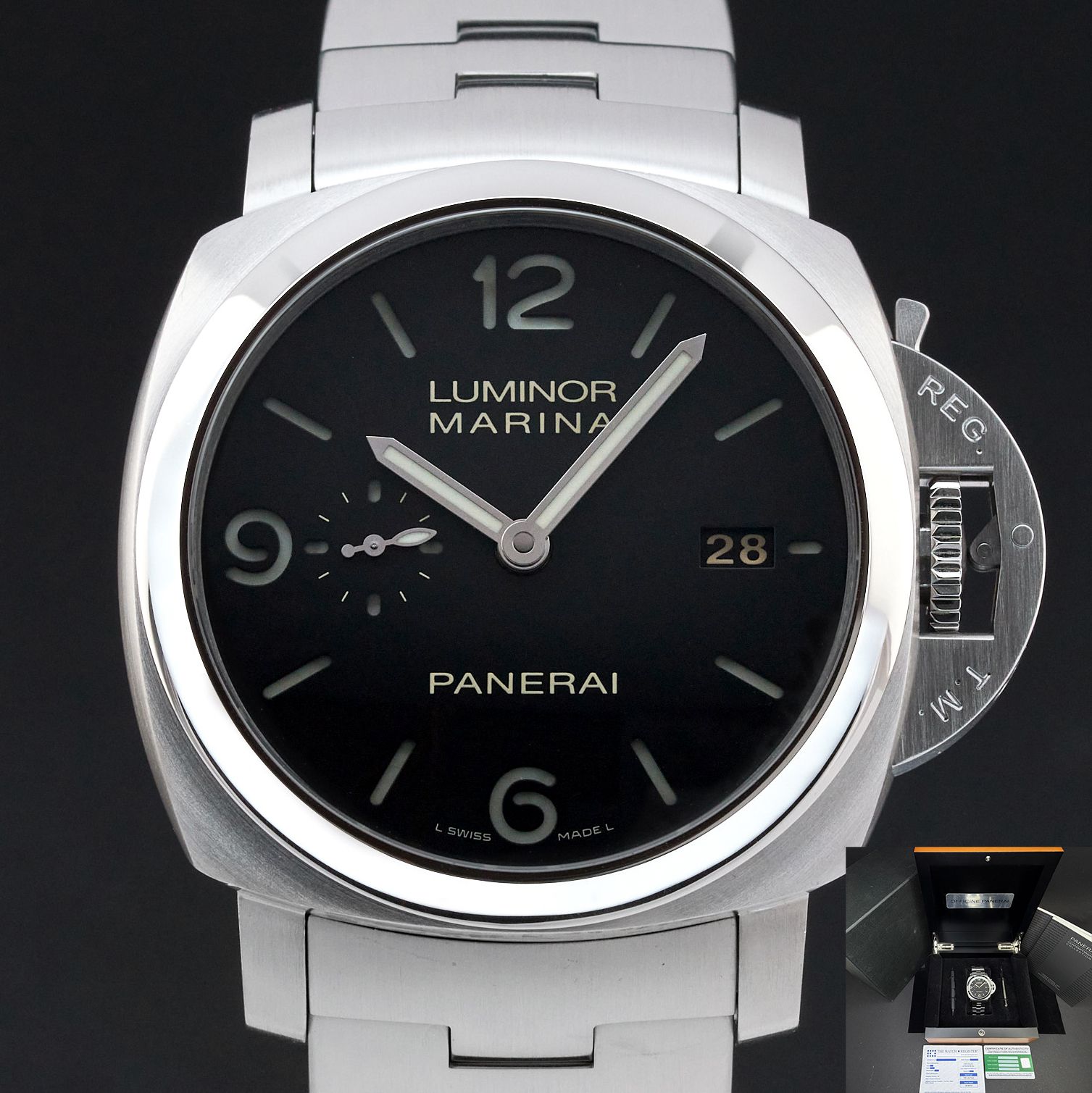 Diese Panerai Luminor Marina PAM 00328 verfügt über eine schwarze arabische Ziffernblatt und ist aus Edelstahl gefertigt.