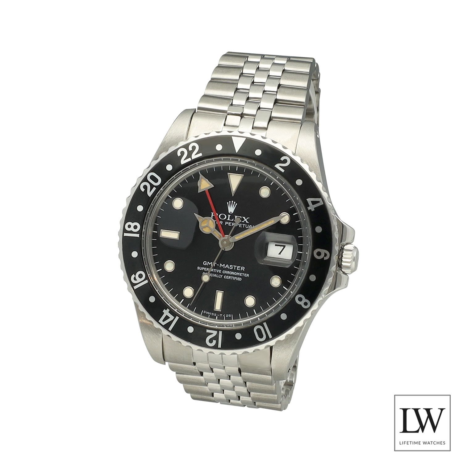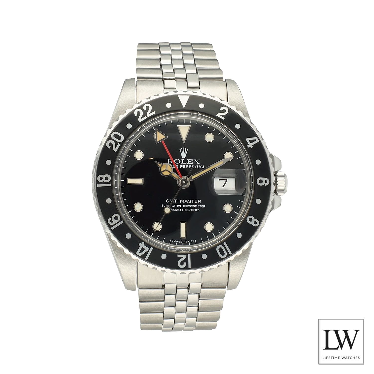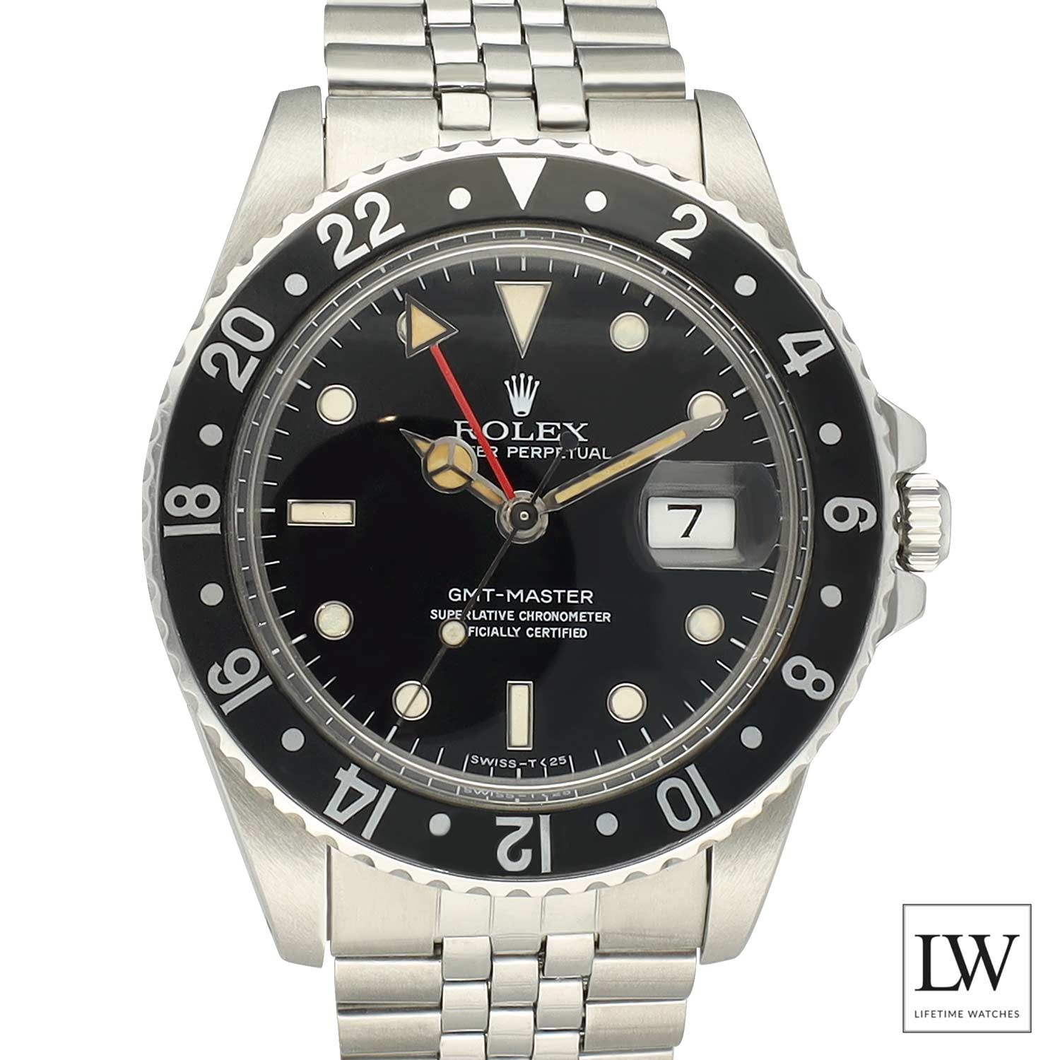 Die Uhr verfügt über ein 40 mm Gehäuse aus Oystersteel, kombiniert mit einer schwarzen Aluminium bidirektionalen 24-Stunden-Lünette und einem schwarzen Zifferblatt, das die unverwechselbare und zeitlose Ästhetik der GMT-Master verkörpert. Ausgestattet mit einem Jubilee-Armband bietet diese Konfiguration sowohl Komfort als auch Vintage-Charme, was sie besonders begehrenswert bei Sammlern macht.