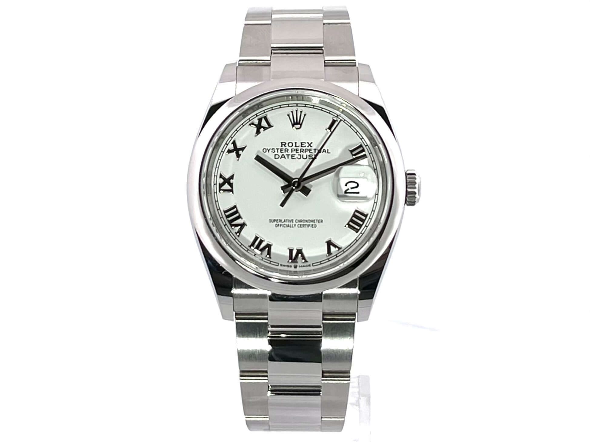 Rolex Datejust 36 Oystersteel Ref. 126200 Weiße römische Ziffern Gehäuse aus poliertem und satiniertem Oystersteel-Edelstahl, Gehäusedurchmesser 36 mm, Oyster-Edelstahlarmband mit Faltschließe, weiße Zifferblatt mit aufgesetzten römischen Ziffern, Automatik, Rolex Manufakturkaliber 3235, 70 Stunden Gangreserve, Datumsanzeige, Chronometer, Saphirglas, verschraubte Krone, verschraubter Edelstahlboden, wasserdicht bis 10 bar.