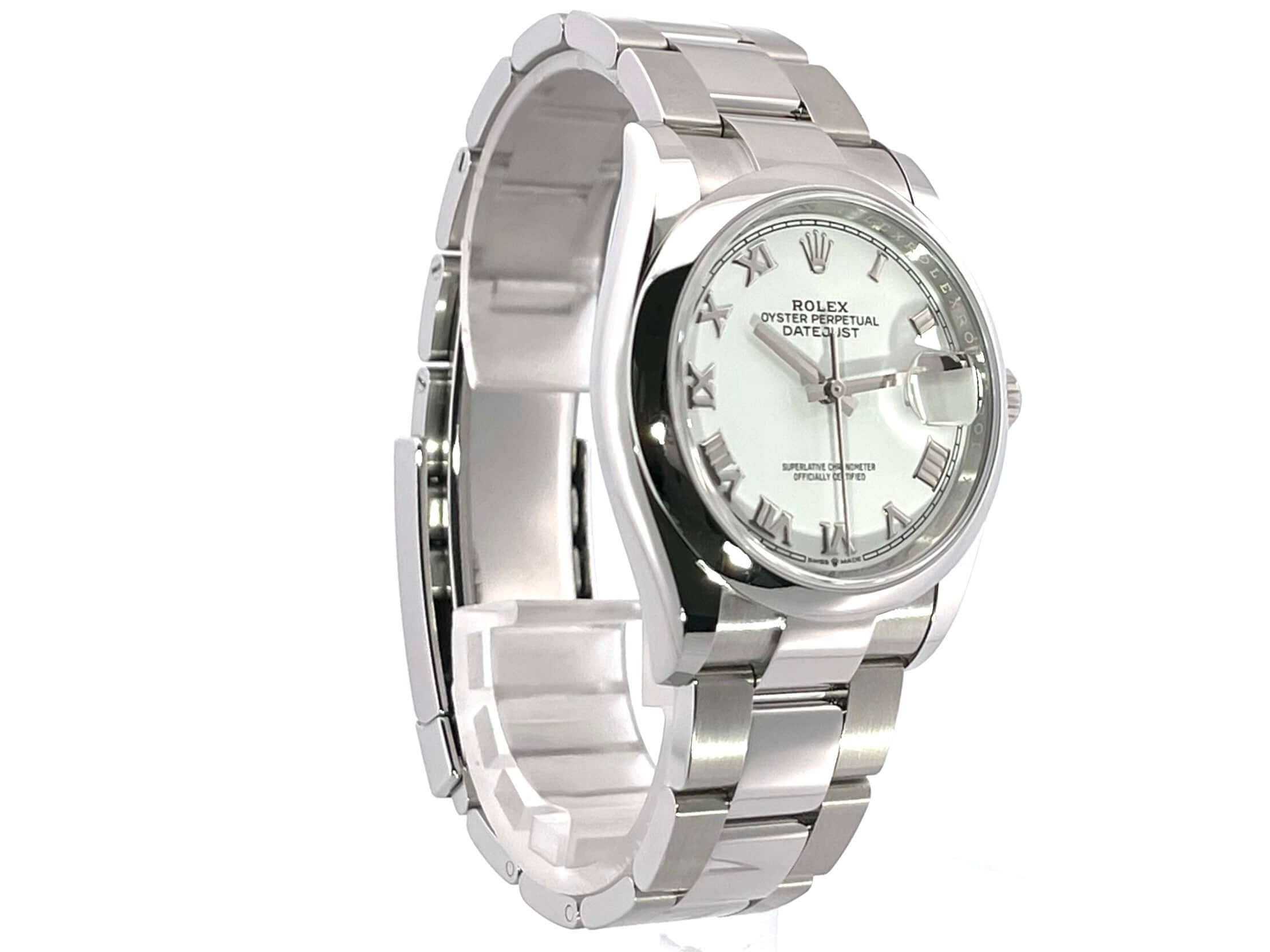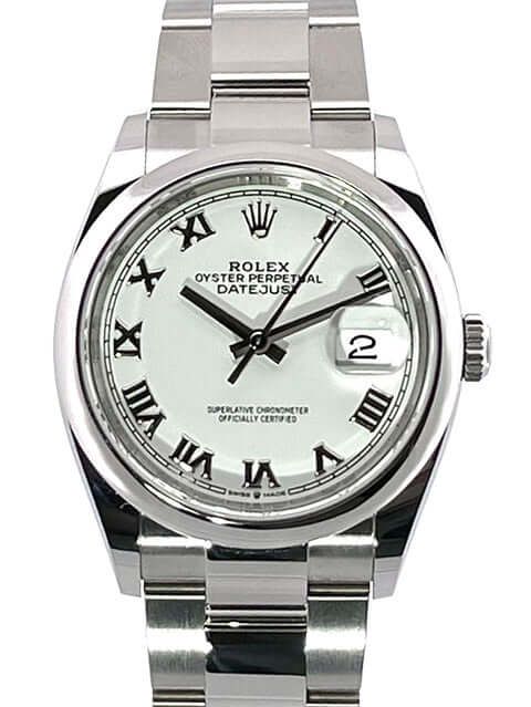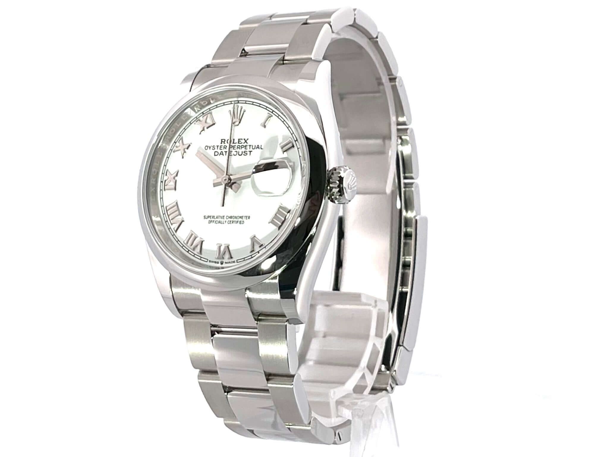 Rolex Datejust 36 Oystersteel Ref. 126200 White Roman Case made of polished and satin-finished Oystersteel stainless steel, case diameter 36 mm, Oyster stainless steel strap with folding clasp, white dial with applied Roman numerals, automatic, Rolex manufacture caliber 3235, 70-hour power reserve, date display, chronometer, sapphire crystal, screw-down crown, screw-down stainless steel back, water-resistant to 10 bar.
