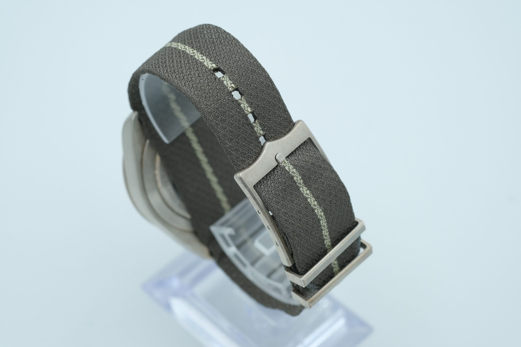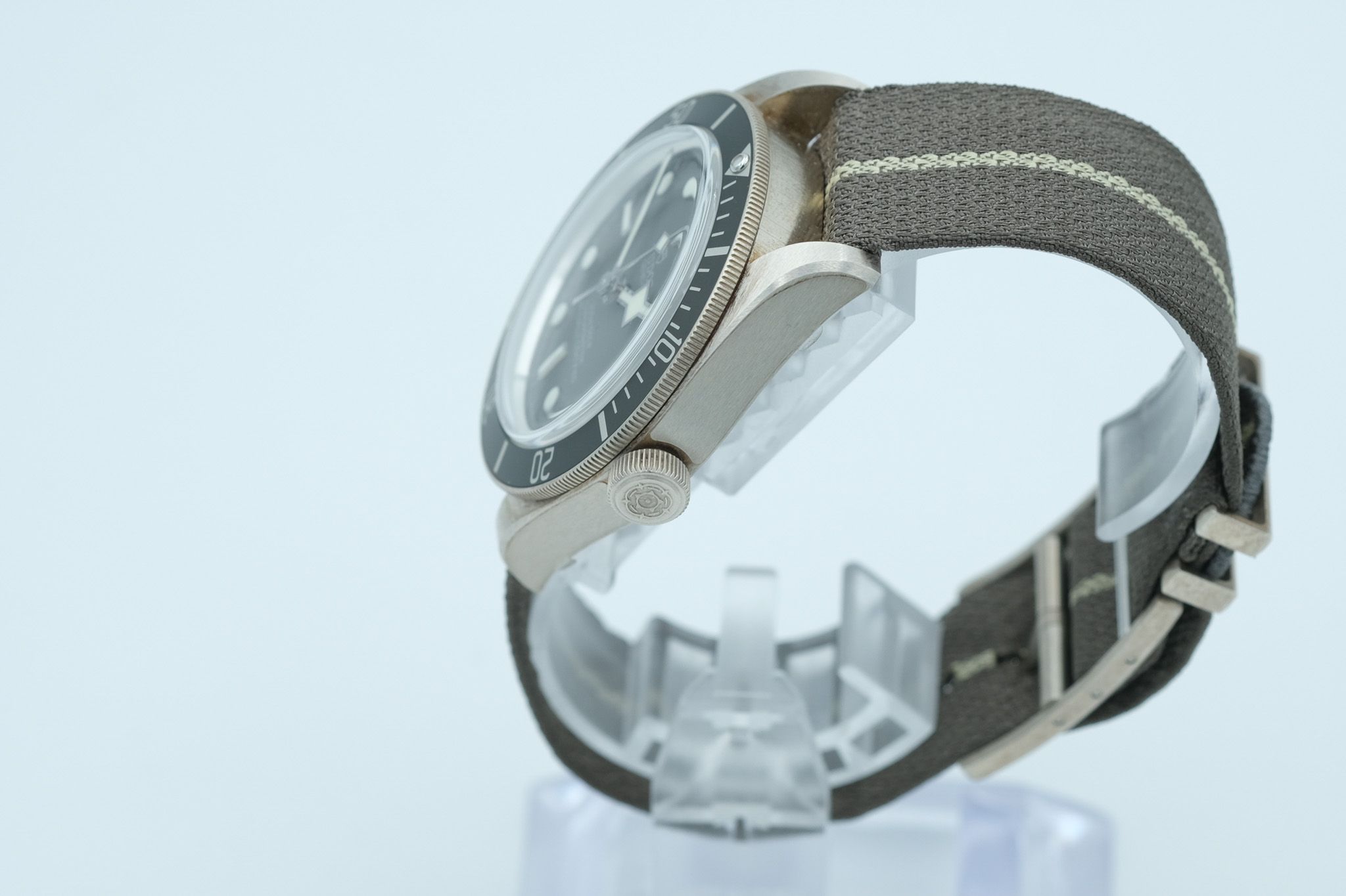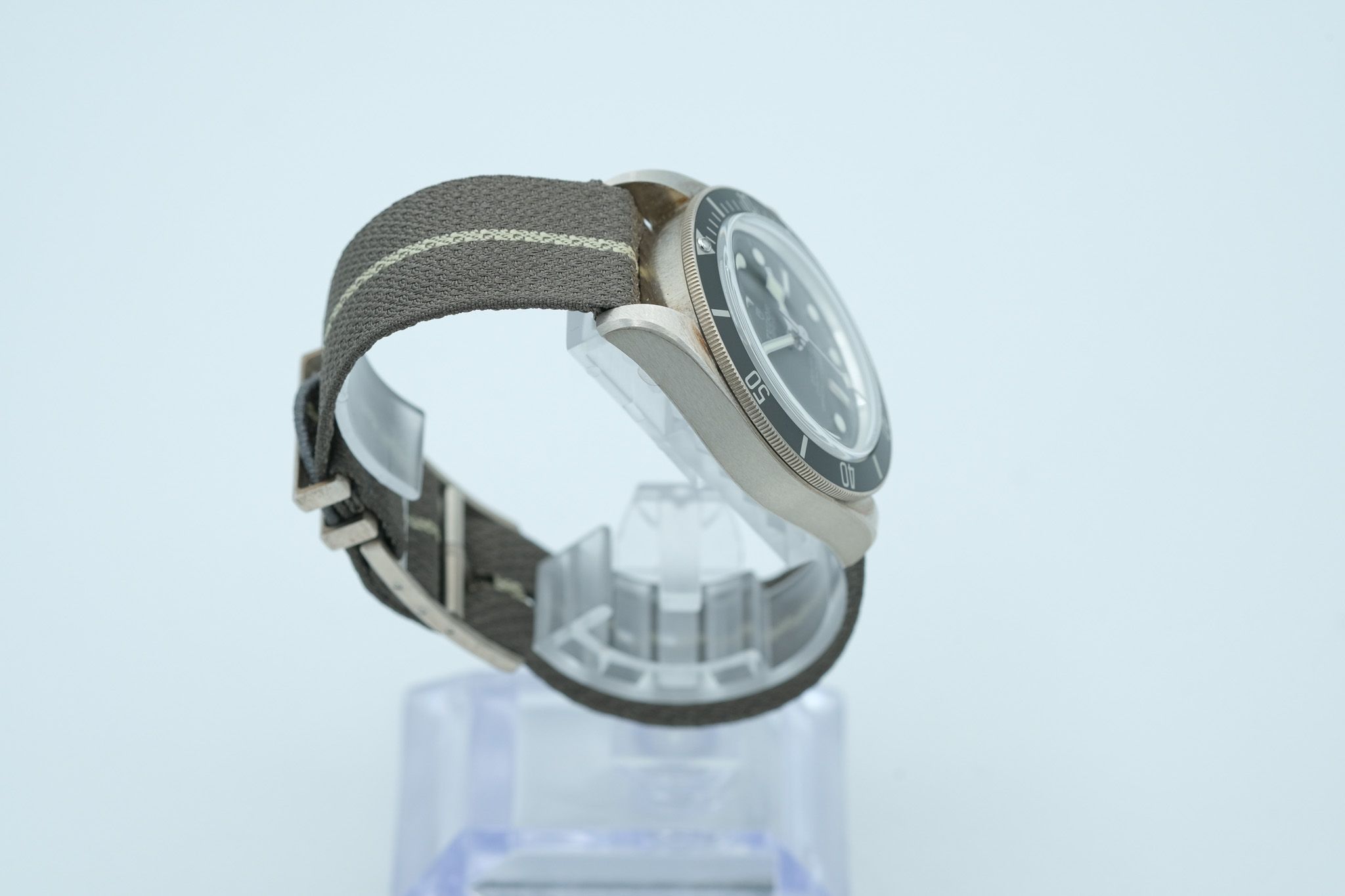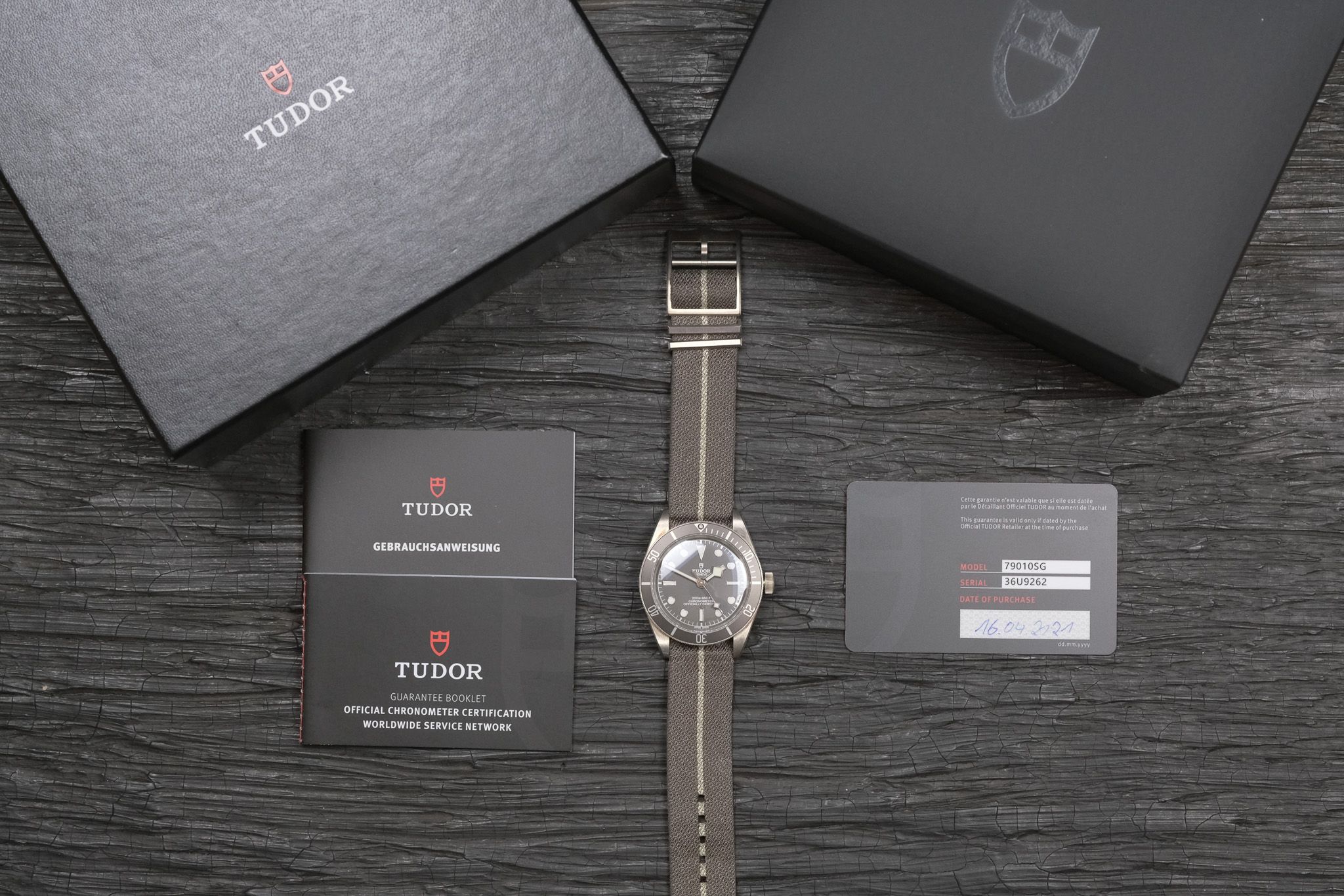 The watch comes with all documents, the original box and outer packaging, and a fabric strap.