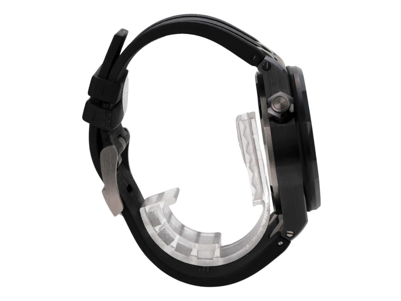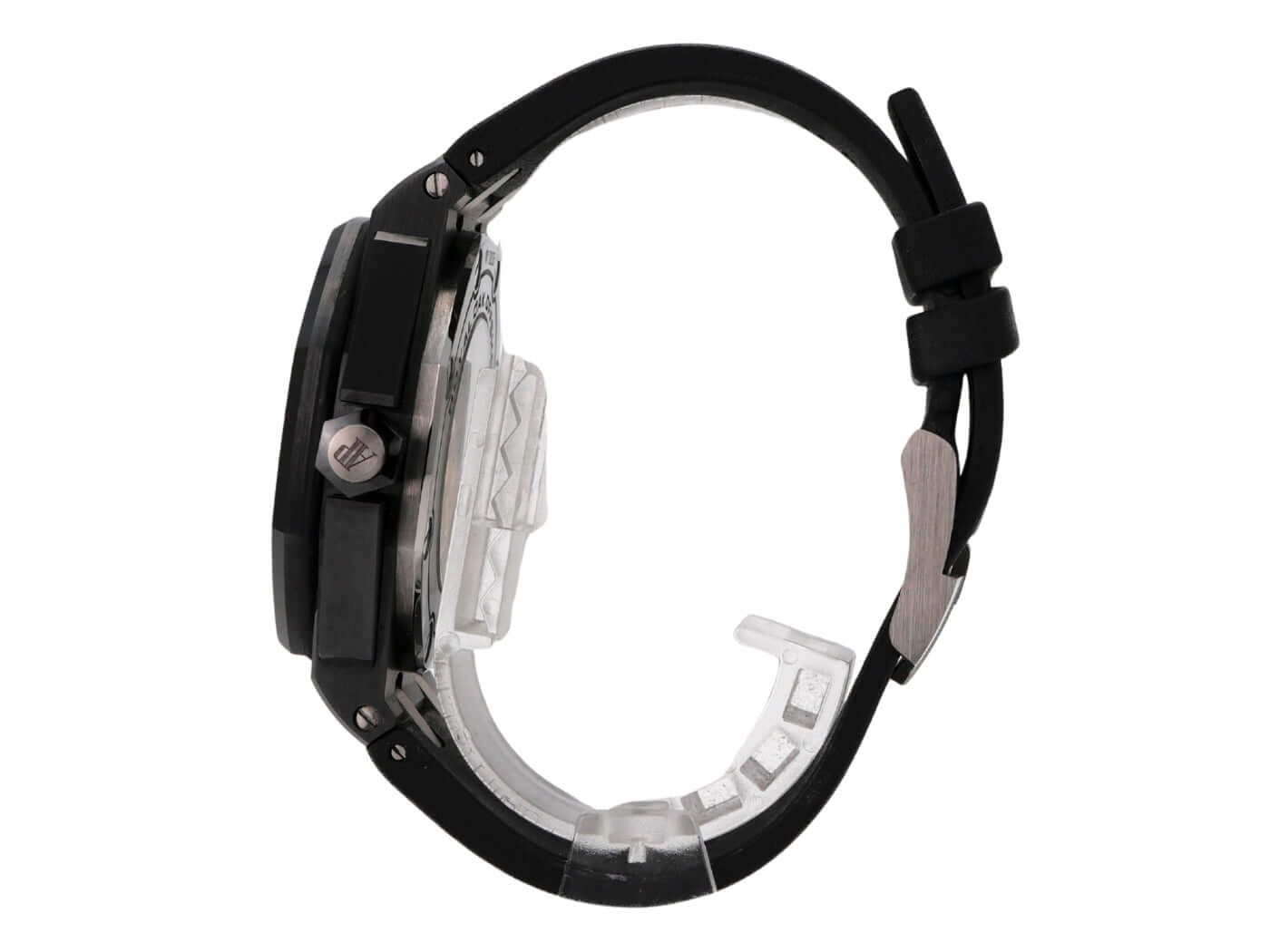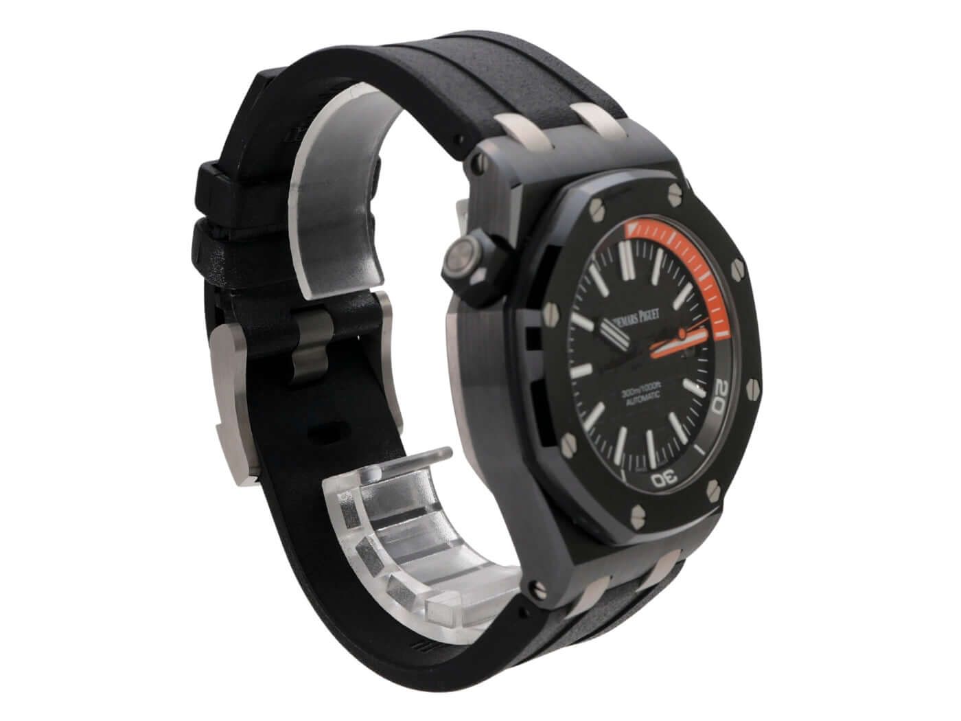 Audemars Piguet Royal Oak Offshore Diver Ceramic 15707CE.OO.A002CA.01 from 2013Ceramic case, case diameter 42 mm, case height 13.90 mm, ceramic bezel, black rubber strap with titanium pin buckle, black dial with applied luminous indices and luminous markers, automatic movement, manufacture caliber 3120 with 40 jewels, frequency 21,600 vibrations per hour, power reserve of approximately 60 hours, date display, scratch-resistant sapphire crystal, screwed and engraved stainless steel case back, water-resistant up to 30 bar.