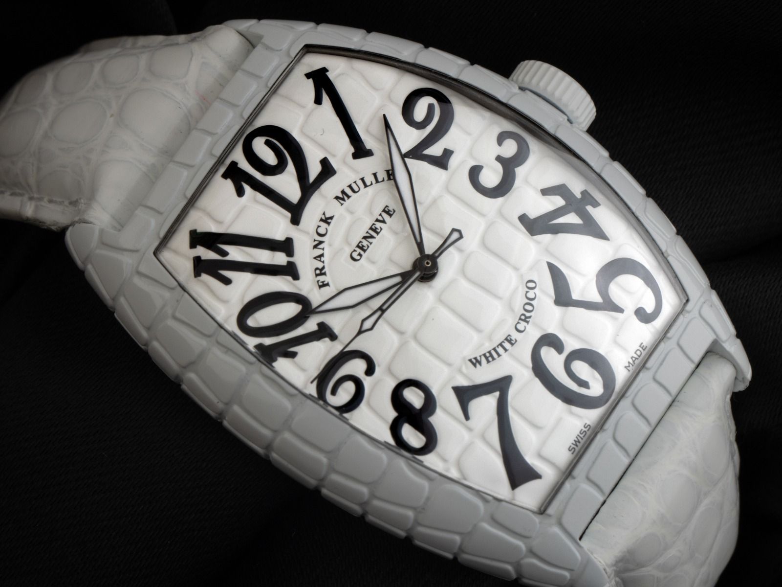 Franck Muller Croco WHT CRO Stahl Black Automatik Armband KrokolederGehäuse Edelstahl weiß beschichtet mit Kroko-Optik, tonneauförmig, Gehäusemaße ohne Krone (L x B x H) 55,5 x 39 x 16mm. Armband Krokoleder weiß mit Ziernaht mit Schnellwechsel Option, Anstoßbreite 21mm, Franck Muller Stiftschließe Edelstahl weiß beschichtet. Zifferblatt weiß mit Kroko-Optik und schwarzen arabischen Ziffern sowie schwarzen Zeigern. Uhrwerk Automatik, Kaliber 2892A2. Anzeige von Stunde und Minute über Zeiger aus der Mitte, kleine Sekunde bei 6 Uhr. Saphirglas kratzfest und gewölbt. Krone mit Hersteller-Logo. Boden Edelstahl 4-fach verschraubt und graviert. Gewicht der Uhr inklusive Armband 103g. Referenznummer: 8880 SC WTH CRO, Baujahr: 2020, Gehäusenummer: XXX, ID: P217026000126H-7600, Artikelnummer: 10000084127. Mit Gangkontrolle und kompletter äußerlicher Aufarbeitung von Januar 2026. Original Franck Muller Box mit Umkarton und Garantie Papiere ohne Datumseintrag, Full Set. Kapitalanlage mit Wertsteigerungspotential, sehr seltenes Sammlerstück. Sehr guter Zustand. Lieferzeit sofort.