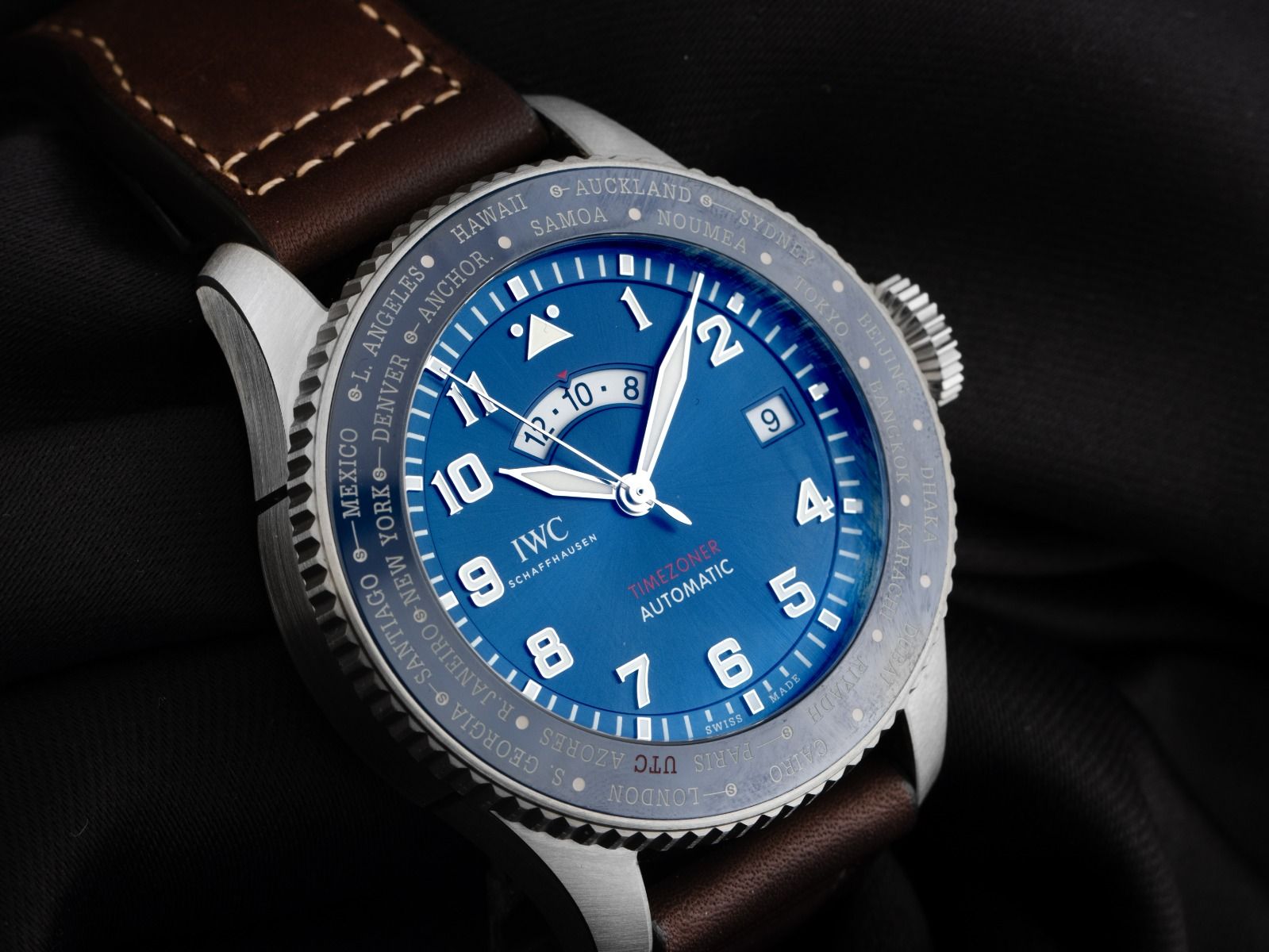 Gehäuse aus poliertem und satiniertem Edelstahl, Gehäusedurchmesser ohne Krone 46mm, Gehäusehöhe 15mm. Lünette aus Edelstahl mit blauem Inlay und bedruckten Zeitzonen, beidseitig drehbar. Armband aus braunem Leder mit Ziernaht, Anstoßbreite 18mm, Stiftschließe aus Edelstahl mit Hersteller-Logo. Zifferblatt in Blau mit arabischen Leuchtziffern und Leuchtindexen sowie Leuchtzeigern. Uhrwerk Automatik, IWC Manufakturkaliber 82760 mit 22 Edelsteinen, Gangreserve ca. 60 Stunden. Anzeige von Stunde und Minute über Zeiger aus der Mitte, kleine Sekunde mit Sekundenstopp zur sekundengenauen Einstellung der Uhrzeit bei 6 Uhr, Datumsanzeige mit Schnellverstellung bei 3 Uhr, zweite Zeitzone (GMT) ablesbar über Scheibe bei 12 Uhr. Saphirglas kratzfest und gewölbt. Krone verschraubbar mit Hersteller-Logo. Boden aus Edelstahl, verschraubt und graviert mit Saphirglas Sichtfenster. Gewicht der Uhr inklusive Armband 147g. Referenznummer: IW395503, ID: ST1160233640126H-16000, Artikelnummer: 10000084223. Original IWC Box mit Umkarton und Garantieunterlagen von Januar 2026 sowie Beschreibung und Poliertuch, Full Set. Ungetragen. Lieferzeit sofort.