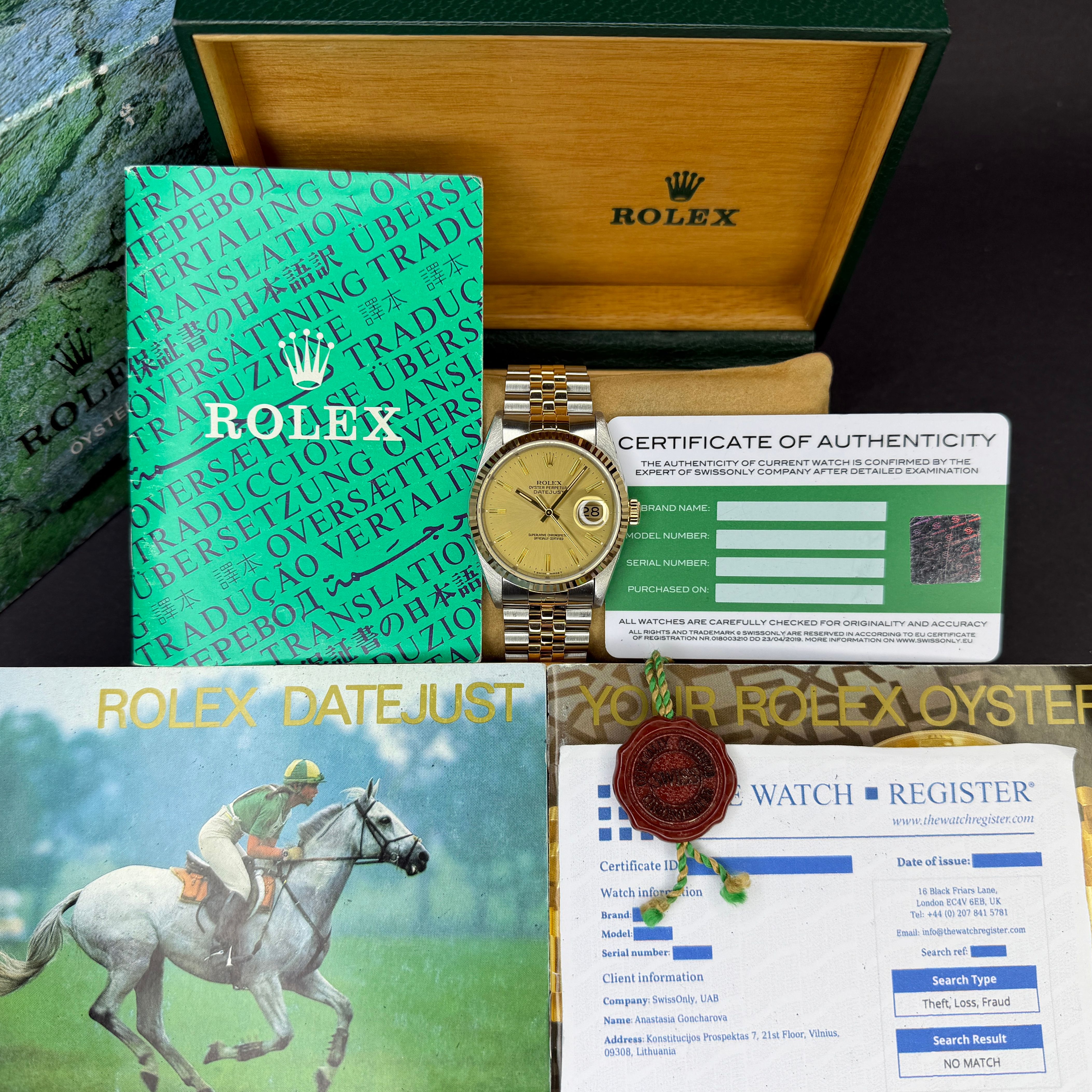 This Rolex Datejust 16233 features a Champagne dial and is crafted from 18K yellow gold and stainless steel, with a production year of 1990.Case No: E20XXXX