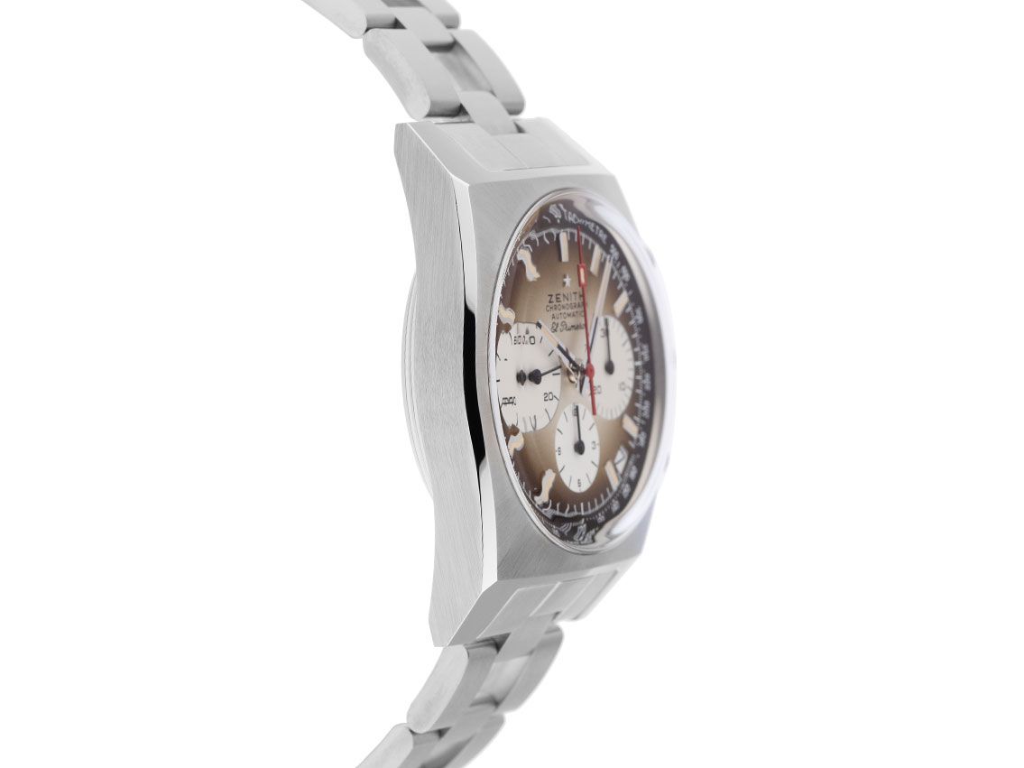 Gehäuse aus poliertem und satiniertem Edelstahl, Gehäusedurchmesser ohne Krone 37mm, Gehäusehöhe 12,9mm. Armband aus satiniertem Edelstahl, Sicherheitsfaltschließe aus Edelstahl mit Hersteller-Logo. Zifferblatt in braunem Verlauf mit aufgesetzten, polierten Edelstahl-Indizes und polierten Edelstahl-Leuchtzeigern. Uhrwerk Automatik, Chronograph, Zenith Manufakturkaliber El Primero 400 mit 31 Edelsteinen, Gangreserve ca. 50 Stunden. Anzeige von Stunde und Minute über Zeiger aus der Mitte, kleine Sekunde mit Sekundenstopp zur sekundengenauen Einstellung der Uhrzeit bei 9 Uhr, Datumsanzeige mit Schnellverstellung zwischen 4 und 5 Uhr. Saphirglas kratzfest, gewölbt und beidseitig entspiegelt. Geriffelte Krone mit Hersteller-Logo. Boden aus Edelstahl, verschraubt und graviert mit Saphirglas-Sichtfenster. Gewicht der Uhr inklusive Armband 113g, Länge des Armbandes inklusive Gehäuse 195mm. Wasserdicht bis 5 ATM. Referenznummer: 03.A384.400/385.M385, ID: ST1160127960624H-9600, Artikelnummer: 10000075002. Original Zenith Box mit Umkarton und Garantiepapieren von 2024 sowie Beschreibung, Full Set. Ungetragen. Lieferzeit sofort.