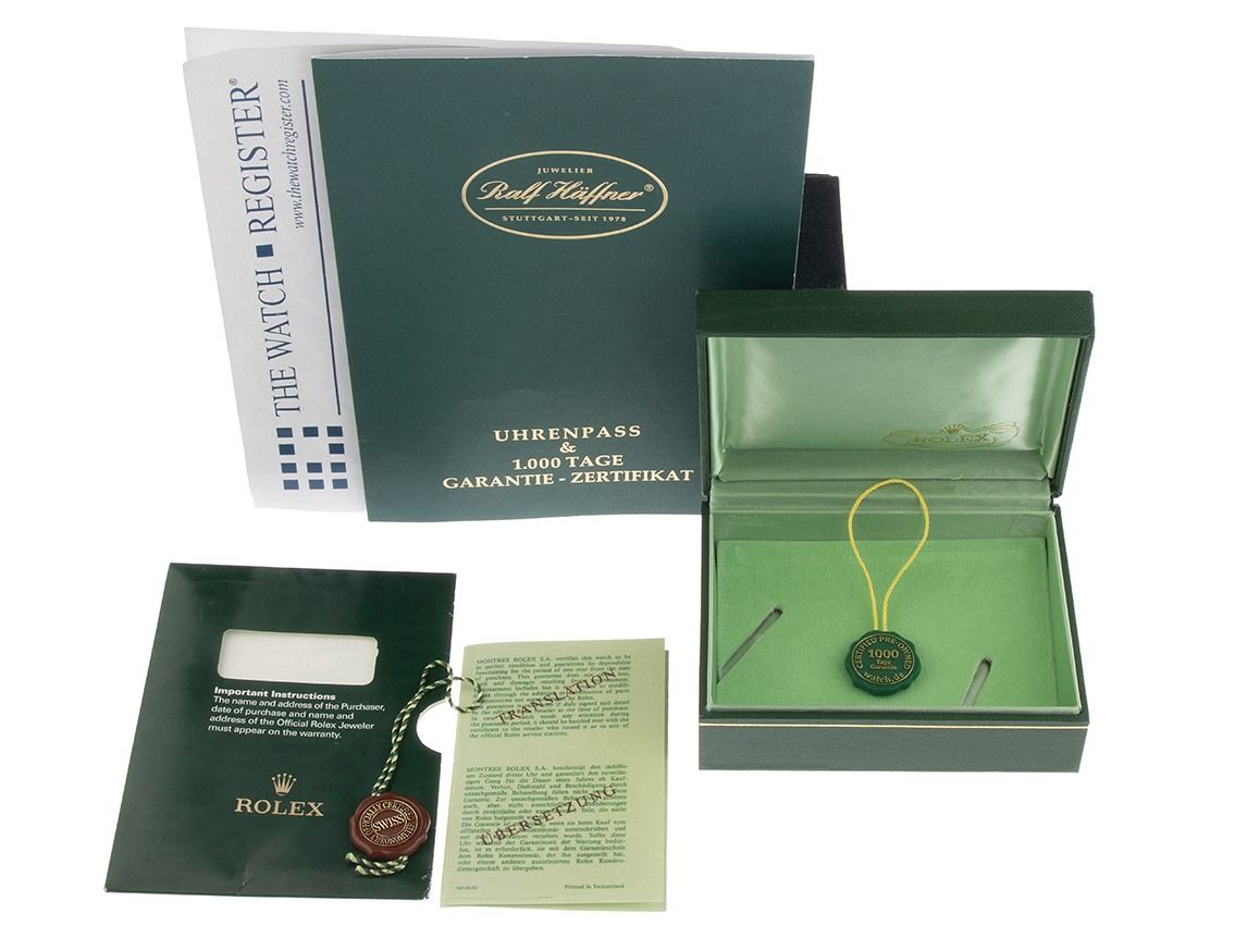Inklusive certified pre owned Siegel / Uhrenpass mit einem Farbbild, der genauen Beschreibung sowie dem Wiederbeschaffungswert der Uhr über 45000,-€ und 1000 Tage Garantie ab Kaufdatum.