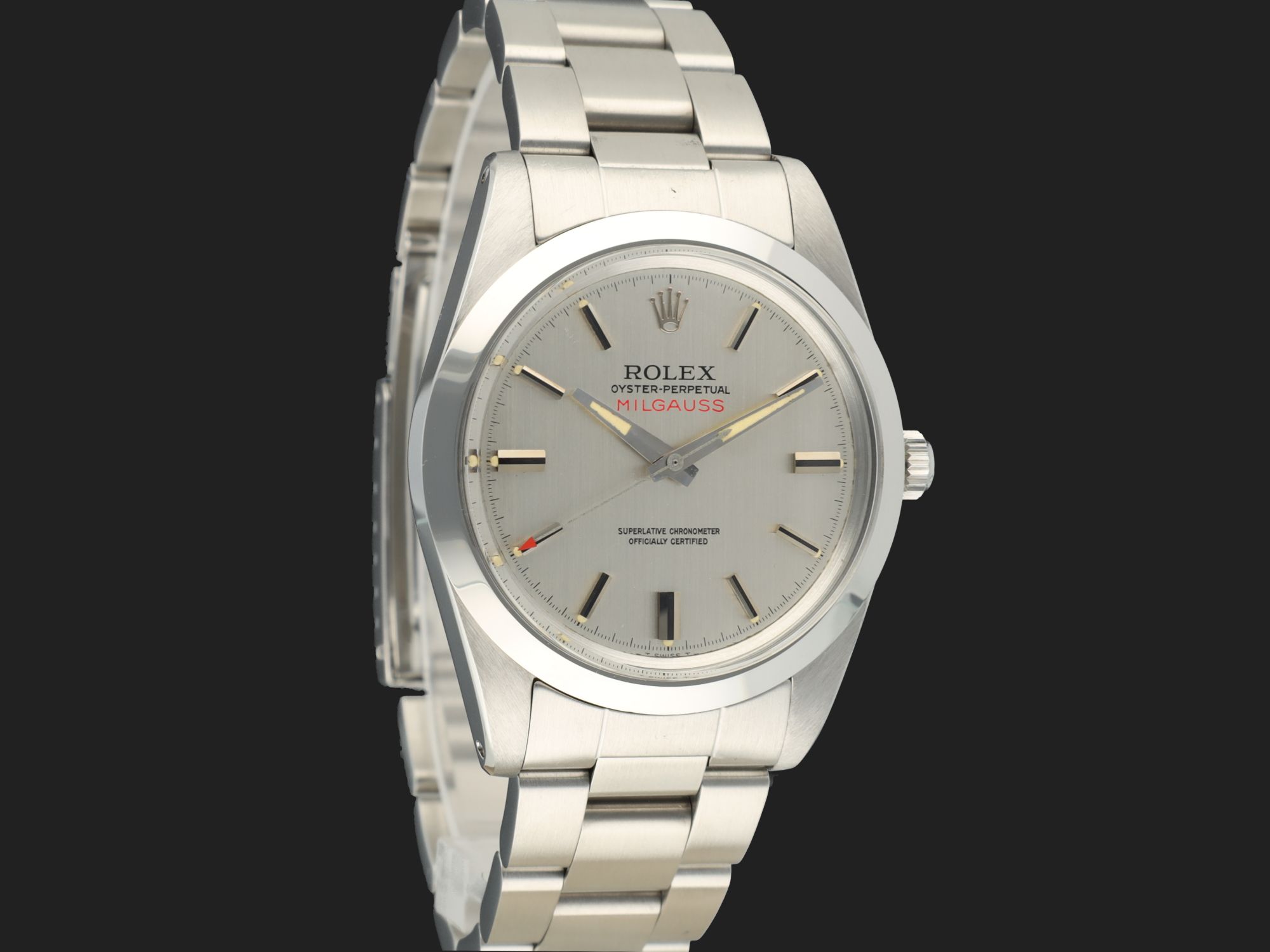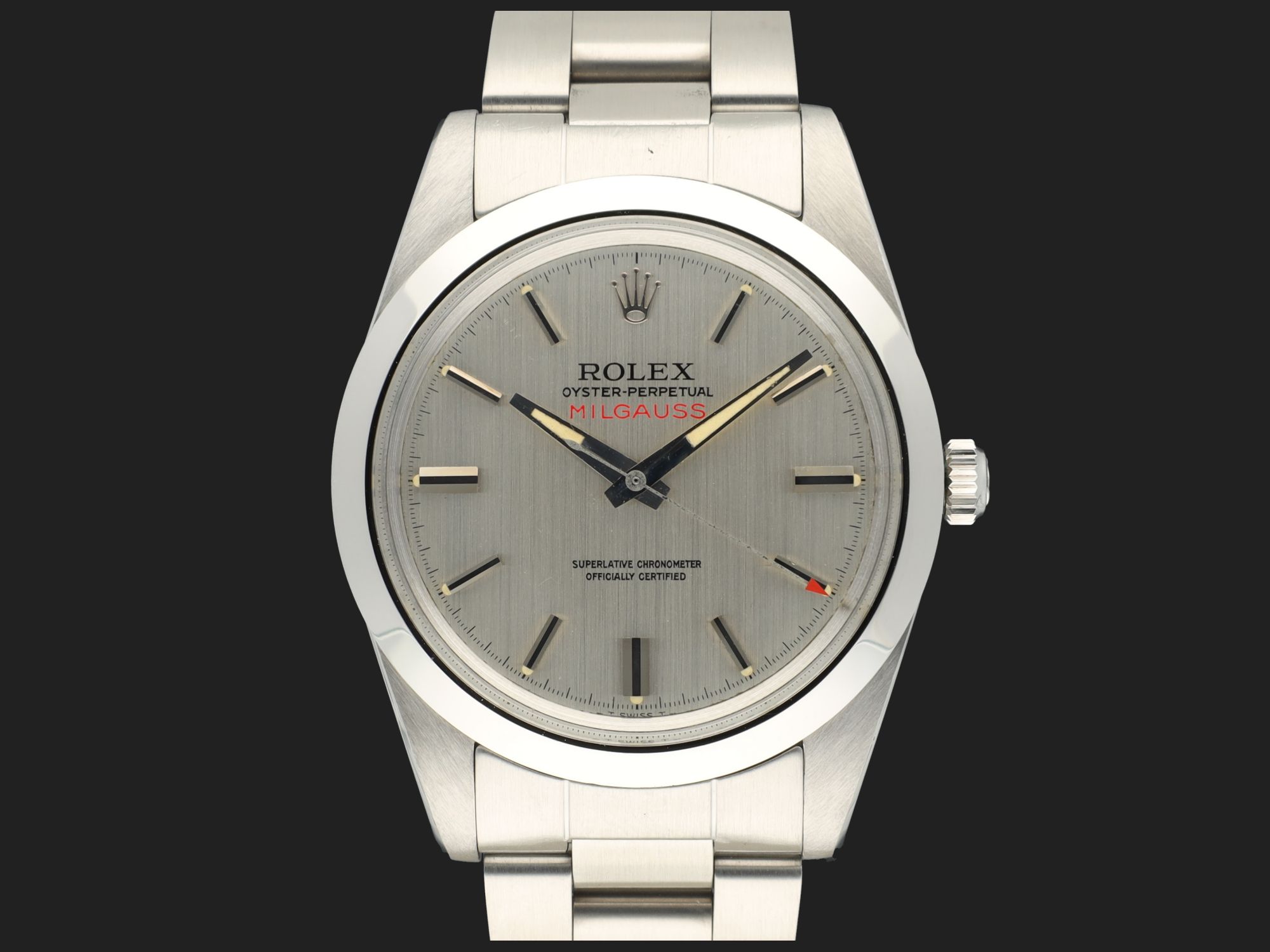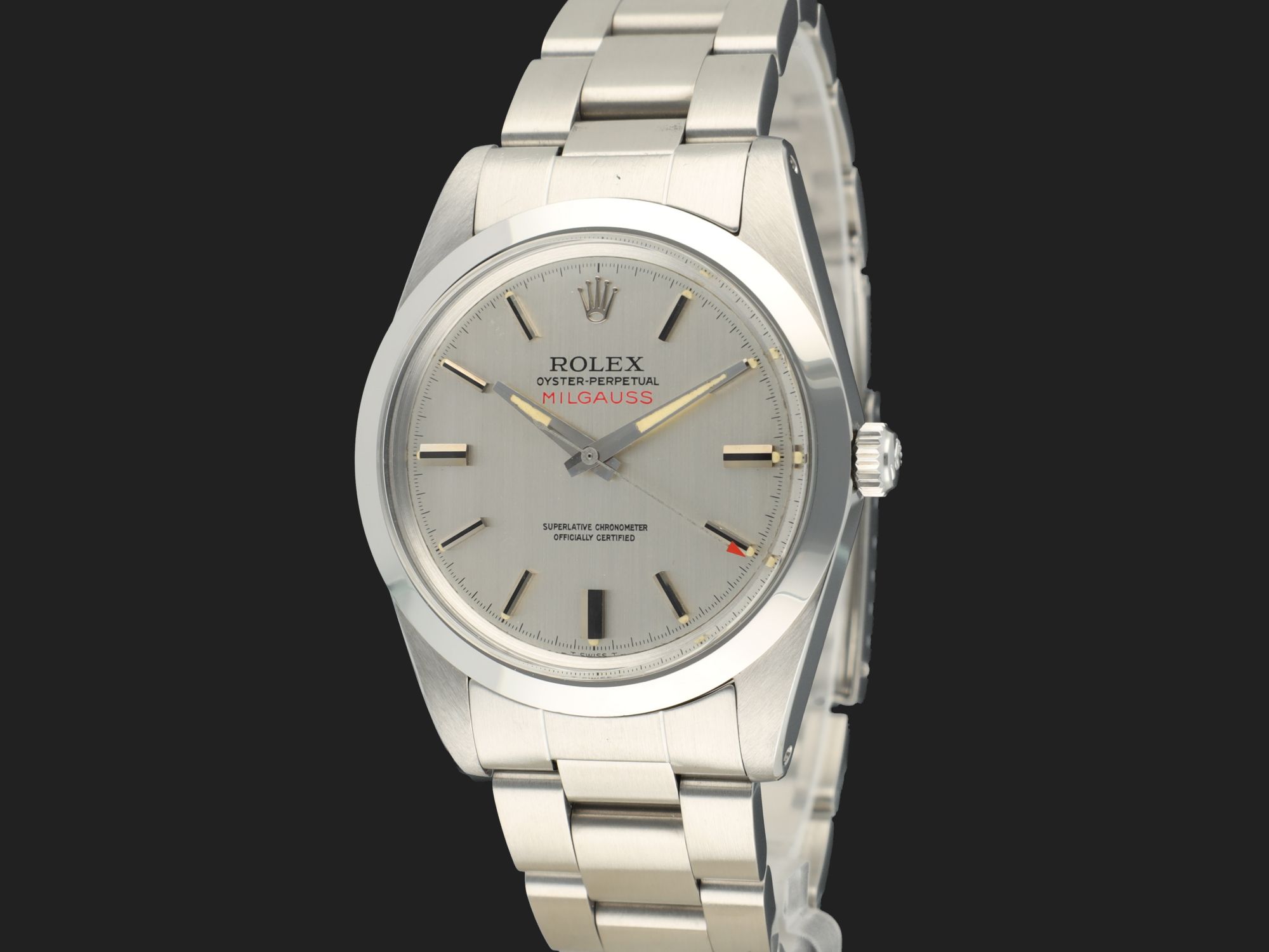 Rolex Milgauss 1019 mit vertikaler silberner Bürstenschliff-Wijzerplaat. Die Wijzerplaat ist in ausgezeichnetem Zustand und verfügt über die bekannten späteren Leuchtpunkte, die sich durch ihre Platzierung neben den Stundenmarkierungen auszeichnen. Die Milgauss kommt an einem 78360 Oyster-Armband (Schließe Code VE, 1980) mit 580 Endlinks. Das Gehäuse und das Armband wurden professionell nachbearbeitet, um den ausgezeichneten Zustand der Wijzerplaat zu ergänzen.