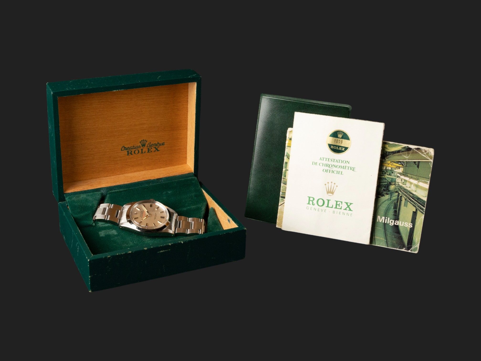 Ein echtes Sammlerset, einschließlich des Milgauss-Buchlets, der ursprünglichen Kaufquittung und Service-Rechnungen über die Jahre, alles direkt vom ursprünglichen Besitzer erhalten.