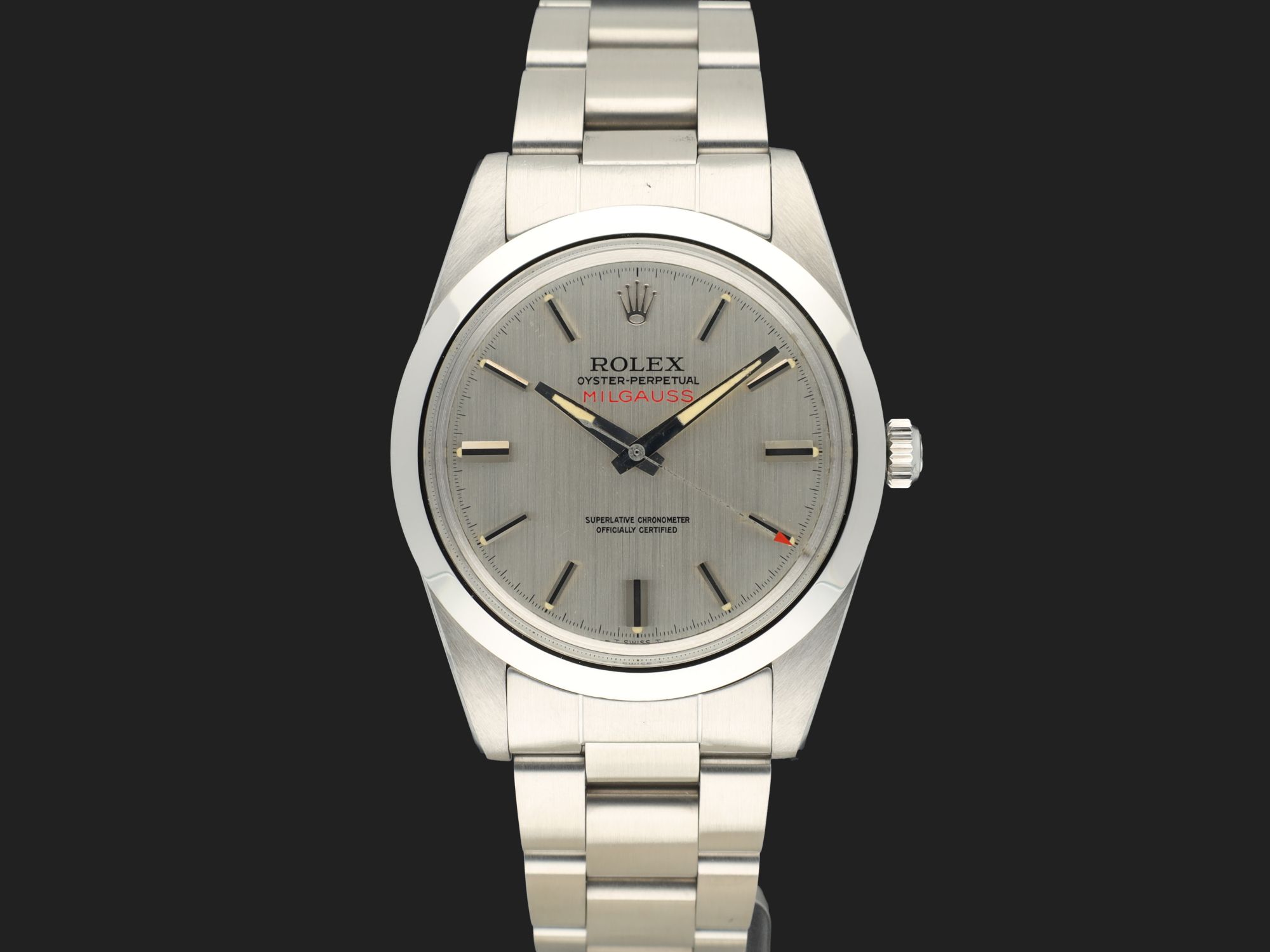 Rolex Milgauss 1019 with vertical silver brush dial. The dial is in excellent condition and features the well-known later lume plots, identifiable by their placement next to the hour markers. The Milgauss comes on a 78360 Oyster bracelet (clasp code VE, 1980) with 580 end links. The case and bracelet have been professionally retouched to complement the excellent condition of the dial.A true collector’s set, including the Milgauss booklet, original purchase receipt, and service invoices over the years, all obtained directly from the original owner.