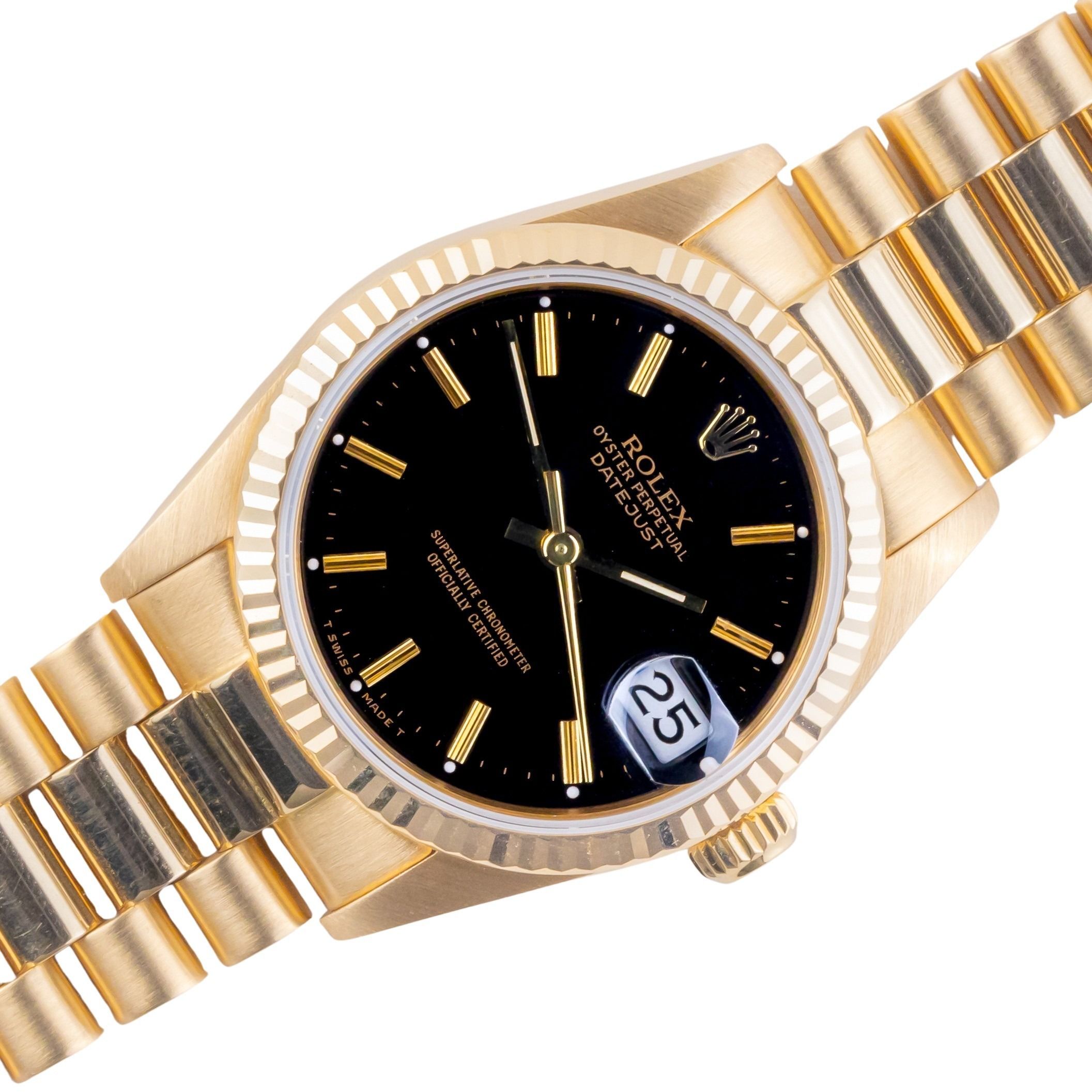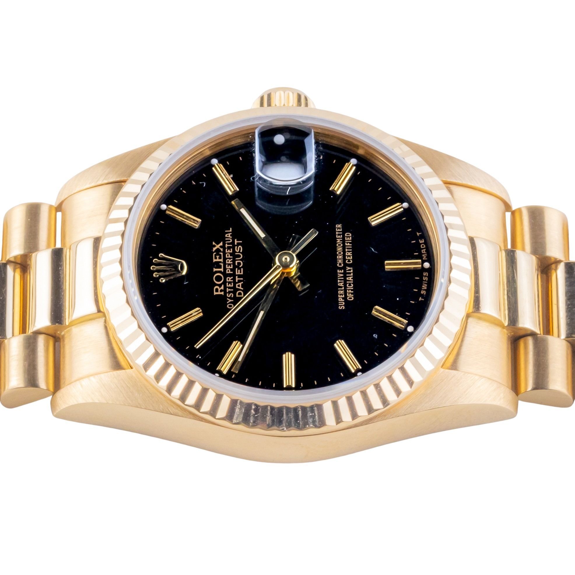 Rolex Oyster Perpetual Lady-Datejust Referenz 68278 aus 1985, inklusive vollständigem Set. Die Lady-Datejust 68278 hat ein 31 mm Gehäuse aus Gold, ein Gold-Präsidentenarmband und eine geriffelte Lünette aus 18 Karat Gold. Die Lady-Datejust 68278 verfügt über ein automatisches Uhrwerk Kaliber 2135 mit Schnellverstellung für das Datum, ein Saphirglas und eine schwarze Stiftzifferblatt.