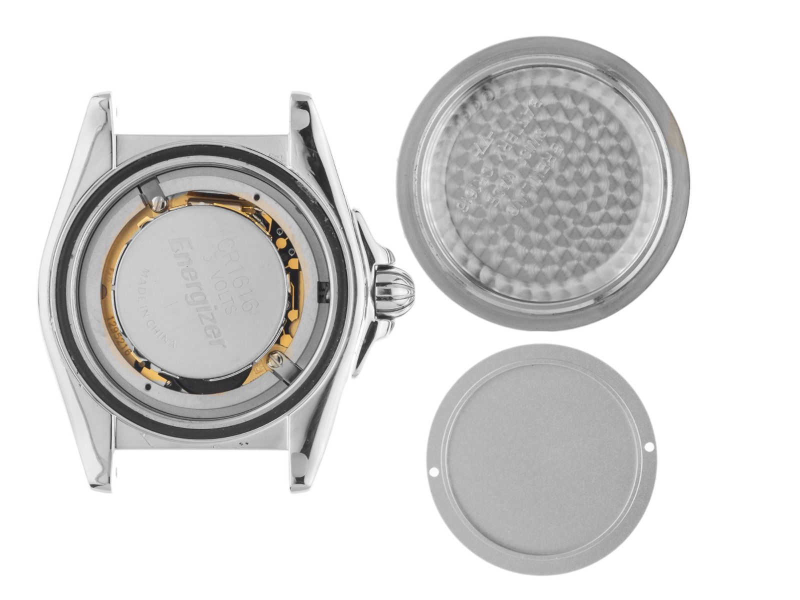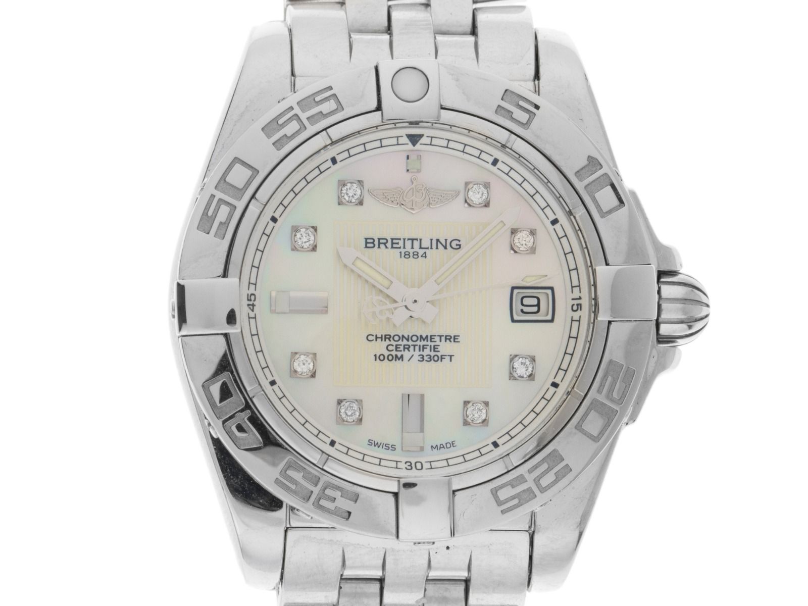 Gehäuse aus poliertem Edelstahl, Gehäusedurchmesser ohne Krone 30mm, Gehäusehöhe 11,0mm. Lünette aus poliertem Edelstahl mit 60-Minuten-Einteilung, einseitig drehbar. Breitling Pilot Armband aus poliertem Edelstahl, Sicherheitsfaltschließe aus Edelstahl mit Hersteller-Logo. Zifferblatt in Perlmutt mit Diamantindexen, aufgesetzten Edelstahl-Indexen sowie Edelstahlzeigern. Uhrwerk quarzgesteuert, Kaliber Breitling B71 mit 7 Edelsteinen. Anzeige von Stunde, Minute und Sekunde über Zeiger aus der Mitte mit Sekundenstopp zur sekundengenauen Einstellung der Uhrzeit, Datumsanzeige mit Schnellverstellung bei 3 Uhr. Saphirglas, kratzfest und gewölbt. Krone mit Flankenschutz. Boden aus Edelstahl, verschraubt und graviert. Gewicht der Uhr inklusive Armband 78g, Länge des Armbandes inklusive Gehäuse 155mm. Referenznummer: A71365, Gehäusenummer: 1295XXX, ID: P227430000126H-5100, Artikelnummer: 10000084271. Mit Gangkontrolle und kompletter äußerlicher Aufarbeitung von Januar 2026. Original Breitling Box mit Umkarton und Garantie-Papieren von August 2013, Beschreibung sowie Watchregister-Auszug von Januar 2026, The Watch Register Zertifikat / ohne Eintrag (Internationale Datenbank für verlorene oder gestohlene Uhren), inkl. Erstkaufrechnung, Full Set. Sehr guter Zustand. Superschnäppchen, sehr seltenes Sammlerstück. Lieferzeit sofort.