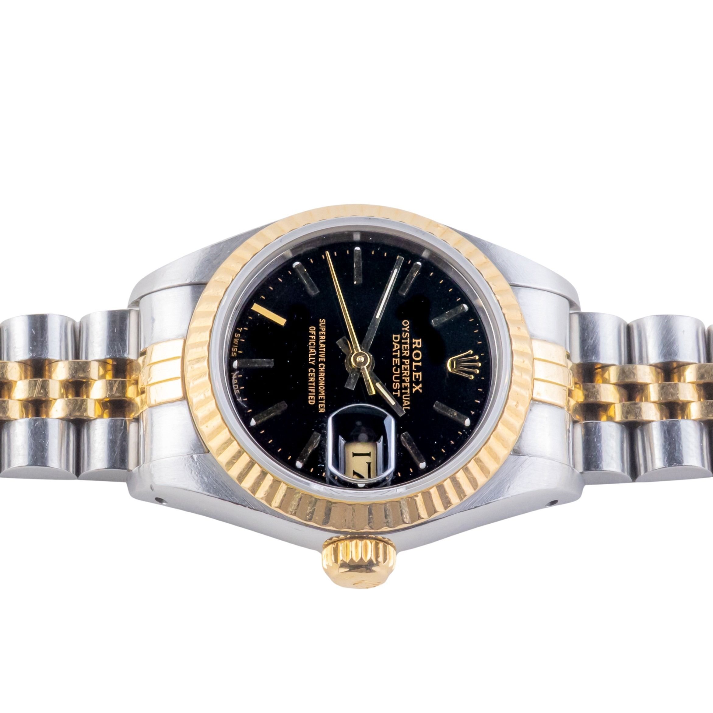Rolex Oyster Perpetual Lady-Datejust Referenz 69173 aus 1987, inklusive vollständigem Set. Die Lady-Datejust 69173 hat ein 26mm Gehäuse aus Gold und Edelstahl, ein zweifarbiges Jubiléearmband und eine geriffelte Lünette aus 14k Gold. Diese Lady-Datejust 69173 verfügt über ein automatisches Uhrwerk Kaliber 2135 mit Schnellschaltung für das Datum, ein kratzfestes Saphirglas und ein schwarzes Zifferblatt mit Tritiumzeigern.