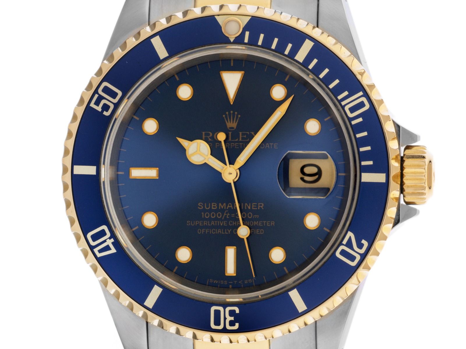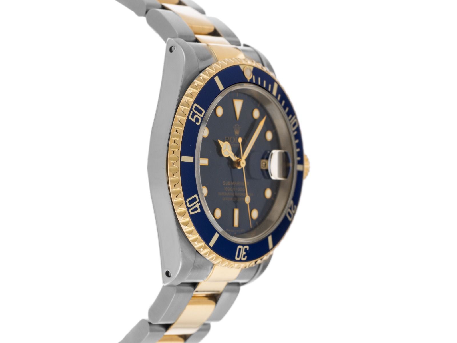 Gehäuse aus poliertem und satiniertem Edelstahl, Gehäusedurchmesser ohne Krone 40mm, Gehäusehöhe 12,8mm. Lünette aus 18kt Gelbgold mit blauem Inlay und 60-Minuten Skala, einseitig drehbar. Armband Oyster aus poliertem und satiniertem Edelstahl / 18kt Gelbgold, Sicherheitsfaltschließe aus Edelstahl mit Hersteller-Logo. Zifferblatt blau mit aufgesetzten, in Gelbgold gefassten Indexen und Punkten sowie gelbgoldenen Zeigern. Uhrwerk Automatik, Chronometer mit Zeugnis, Rolex Manufakturkaliber 3135 mit 31 Edelsteinen. Anzeige von Stunde, Minute und Sekunde über Zeiger aus der Mitte mit Sekundenstopp zur sekundengenauen Einstellung der Uhrzeit, Datumsanzeige mit Schnellverstellung unter Glaslupe bei 3 Uhr. Saphirglas kratzfest. Krone verschraubbar mit Flankenschutz und Hersteller-Logo. Boden aus Edelstahl verschraubt. Gewicht der Uhr inklusive Armband 139g, Länge des Armbandes inklusive Gehäuse 180mm. Referenznummer: 16613, Gehäusenummer: T361XXX, ID: P2168174980126H-13500, Artikelnummer: 10000084121. Mit Gangkontrolle und kompletter äußerlicher Aufarbeitung von Januar 2026. Original Rolex Box und Garantie Papiere von Mai 1997, LC 130 / Luxemburg, EU sowie Beschreibung, Ledermäppchen, Übersetzungsheft, Rolex Chronometer-Siegel und Watchregister Auszug von Januar 2026, The Watch Register Zertifikat / ohne Eintrag (Internationale Datenbank für verlorene oder gestohlene Uhren), inklusive Erstkaufrechnung, Full Set. Superschnäppchen, Kapitalanlage mit Wertsteigerungspotential, sehr seltenes Sammlerstück. Sehr guter Zustand. Lieferzeit sofort.