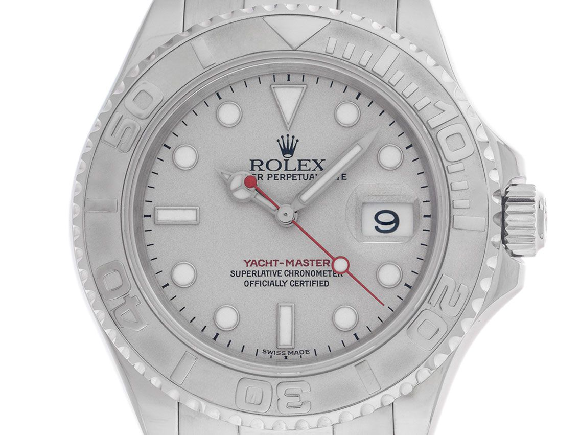 Rolex Yacht-Master Stahl Platin Automatik Armband OysterGehäuse Edelstahl poliert, Gehäusedurchmesser ohne Krone 35mm, Gehäusehöhe 11,0mm. Lünette 950 Platin gerädelt mit 60-Minuten Relief Skala, beidseitig drehbar. Armband Oyster Edelstahl poliert und satiniert, Sicherheitsfaltschließe Edelstahl mit Hersteller-Logo. Zifferblatt 950 Platin mit aufgesetzten weißgoldenen Indexen und Punkten sowie weißgoldenen Zeigern und rotem Sekundenzeiger. Uhrwerk Automatik, Chronometer mit Zeugnis, Rolex Manufakturkaliber 2235 mit 31 Edelsteinen. Anzeige von Stunde, Minute und Sekunde über Zeiger aus der Mitte mit Sekundenstopp zur sekundengenauen Einstellung der Uhrzeit, Datumsanzeige mit Schnellverstellung unter Glaslupe bei 3 Uhr. Saphirglas kratzfest. Krone verschraubbar mit Flankenschutz und Hersteller-Logo. Boden Edelstahl verschraubt. Gewicht der Uhr inklusive Armband 103g, Länge des Armbandes inklusive Gehäuse 180mm. Referenznummer: 168622, Gehäusenummer: D459XXX, Baujahr: 2005, ID: P2234112240126H-9900, Artikelnummer: 10000084214. Mit Gangkontrolle und kompletter äußerlicher Aufarbeitung von Januar 2026. Original Rolex Box mit Umkarton und Garantie Papiere von März 2006, LC 127 / Österreich EU sowie Beschreibung, Ledermäppchen, Kalender 2004 / 2005, Rolex Chronometer-Siegel und Watchregister Auszug von Januar 2026, The Watch Register Zertifikat / ohne Eintrag (Internationale Datenbank für verlorene oder gestohlene Uhren), Full Set. Superschnäppchen, Kapitalanlage mit Wertsteigerungspotential, sehr seltenes Sammlerstück. Sehr guter Zustand. Lieferzeit sofort.