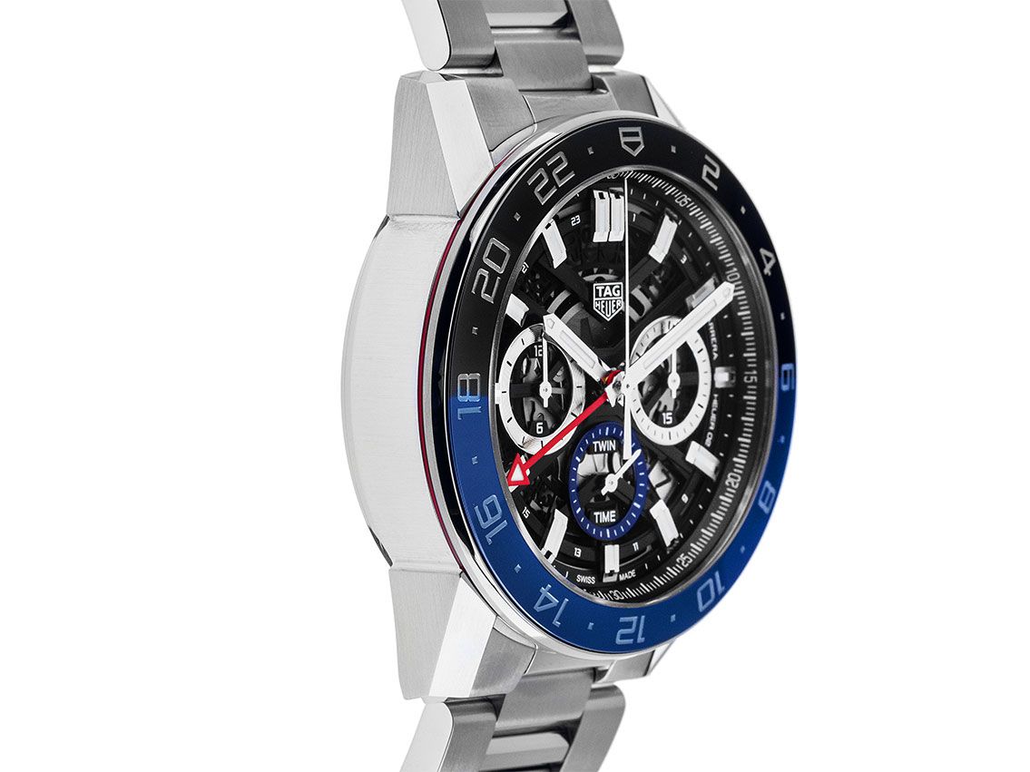 Tag Heuer Carrera GMT Twin-Time Stahl Keramik Automatik Chronograph Armband StahlGehäuse Edelstahl poliert und satiniert, Gehäusedurchmesser ohne Krone 45mm, Gehäusehöhe 16,8mm. Lünette Edelstahl poliert mit schwarz / blauem Keramik Inlay mit gravierter 24-Stunden Skala. Armband Edelstahl poliert und satiniert, verdeckte Sicherheitsfaltschließe Edelstahl mit Hersteller-Logo. Zifferblatt skelettiert mit aufgesetzten Edelstahl Leuchtindexen und Edelstahl Leuchtzeigern. Uhrwerk Automatik, Chronograph, Tag Heuer Manufakturkaliber Calibre 02 mit 33 Edelsteinen, Gangreserve ca. 80 Std. Anzeige von Stunde und Minute über Zeiger aus der Mitte, kleine Sekunde mit Sekundenstopp zur sekundengenauen Einstellung der Uhrzeit 6 Uhr, Datumsanzeige mit Schnellverstellung zwischen 4 und 5 Uhr. Saphirglas kratzfest. Krone mit Hersteller-Logo und Flankenschutz. Boden Edelstahl 4-fach verschraubt und graviert mit Saphirglas Sichtfenster. Gewicht der Uhr inklusive Armband 212g, Länge des Armbandes inklusive Gehäuse 185mm. Wasserdicht bis 10 ATM. Referenznummer: CBG2A1Z.BA0658, Gehäusenummer: WMC0XXX, ID: P229268000126H-7200, Artikelnummer: 10000084298. Mit Gangkontrolle und kompletter äußerlicher Aufarbeitung von Januar 2026. Original Tag Heuer Box mit Umkarton und Garantie Papiere von Januar 2020 sowie Beschreibung und Watchregister Auszug von Januar 2026, The Watch Register Zertifikat / ohne Eintrag (Internationale Datenbank für verlorene oder gestohlene Uhren), inkl. Erstkaufrechnung, Full Set. Superschnäppchen, Tresoruhr, Ungetragen. Lieferzeit sofort.