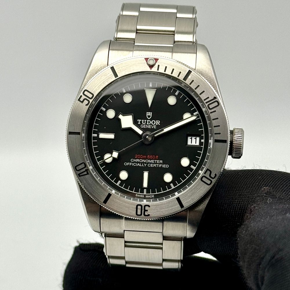 Founded in 1926 by Hans Wilsdorf, the founder of Rolex, Tudor is known for producing robust, reliable tool watches that combine heritage-inspired design with modern Swiss watchmaking technology. The Black Bay collection draws heavily from Tudor’s historic dive watches, and the Black Bay Steel stands out with its clean, utilitarian appearance and brushed steel finish.The Tudor Black Bay Steel, reference M79730, features a 41 mm stainless steel case with a fully brushed finish, paired with a black dial and matching black unidirectional rotating bezel. The signature snowflake hands and applied hour markers are filled with luminous material to ensure excellent legibility in all conditions. Powered by the in-house Tudor caliber MT5602 automatic movement, it delivers a 70-hour power reserve, a frequency of 28,800 vph, a silicon balance spring, and COSC-certified chronometer accuracy. Functions include hours, minutes, and central seconds.A domed sapphire crystal protects the dial, while the screw-down crown and 200 meters of water resistance confirm its professional dive-watch credential.
