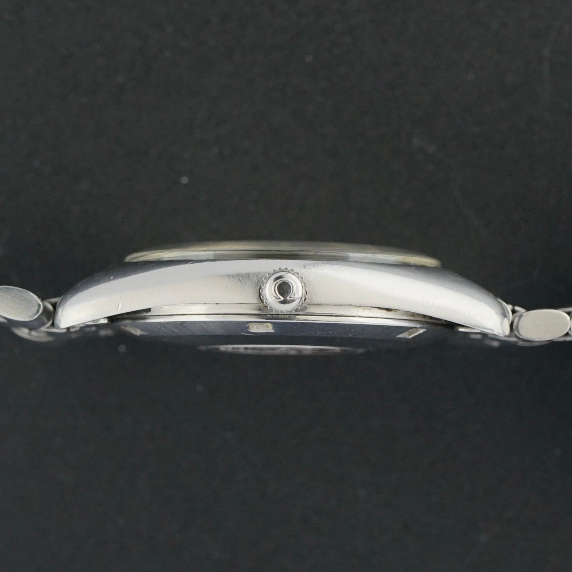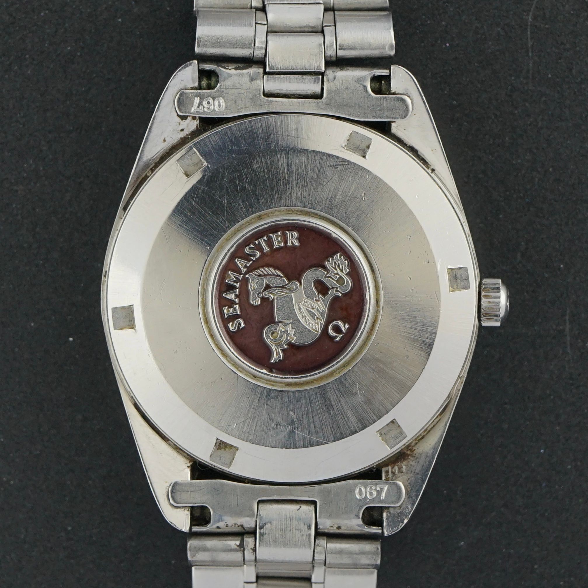 Das Stahlgehäuse hat eine Breite von 36 mm und behält den Großteil seines ursprünglichen Polierens. Der Gehäuseboden zeigt noch Reste des lila Fabrikdichtungsaufklebers, der unberührt gelassen wurde als Zeugnis für den Zustand und die Originalität der Uhr, was ihren Wert erhöht. Bis heute vollständig original, ist diese Seamaster am besten als sportliche Alltagsuhr aus der Vintage-Ära zu betrachten.