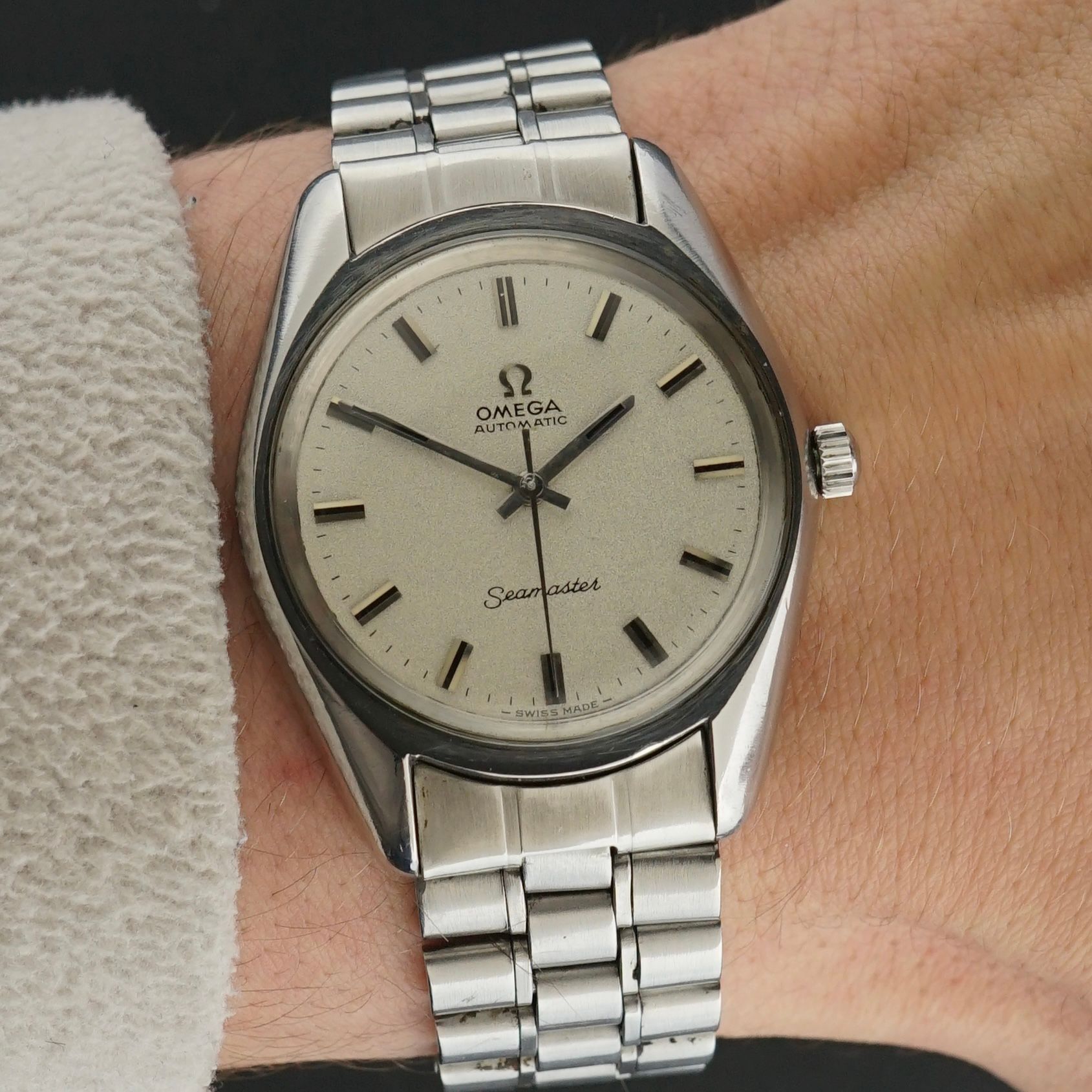 This vintage Omega Seamaster dates to 1969 and features a steel case paired with its original Omega steel bracelet. The white dial has a subtle sparkle effect that shimmers beautifully in the sun. Inside is a caliber 552 automatic movement, freshly serviced in January 2026 and currently running and functioning excellently.The steel case measures 36 mm in width and retains most of its original polish. The caseback still shows remnants of the purple factory seal sticker, left untouched as a testament to the watch’s condition and originality, adding to its value. Entirely original to this day, this Seamaster is best considered a sporty daily wear from the vintage era.