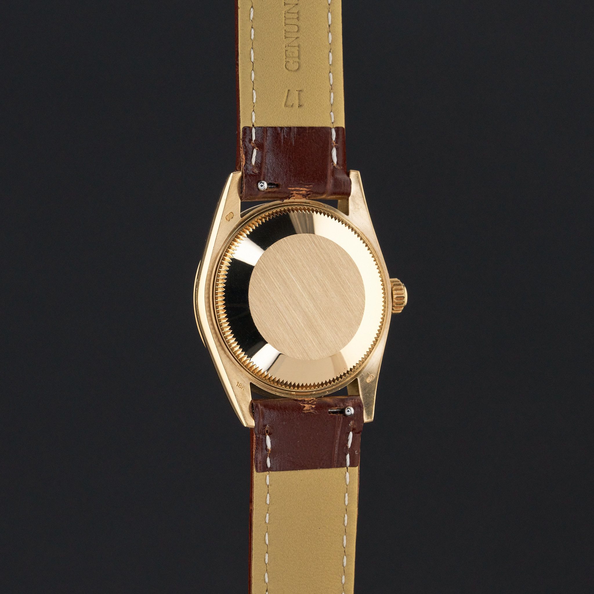 This Rolex Oyster Perpetual 67518 features a Black dial and is crafted from 18K yellow gold, with a production year of 1990.Case No: E23XXXX