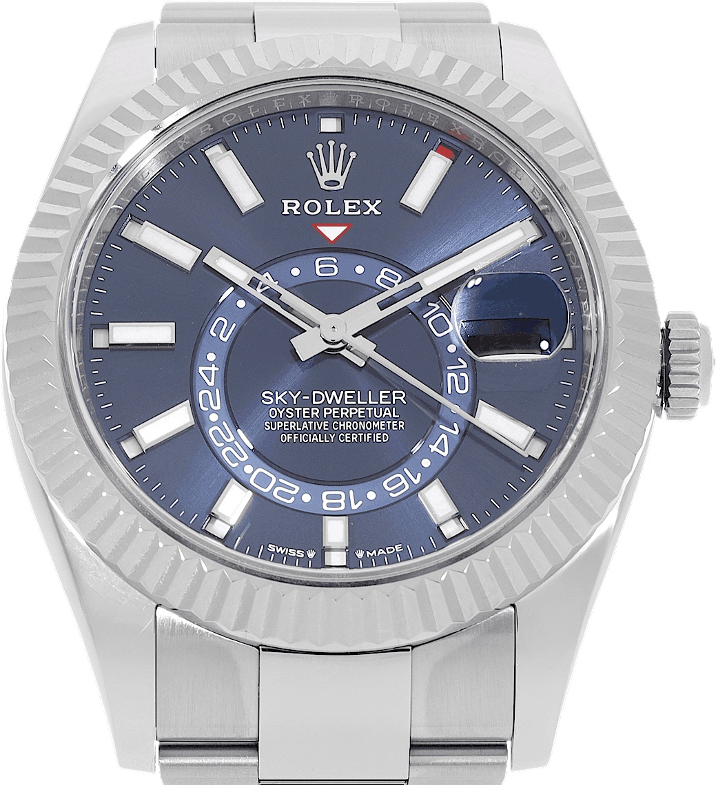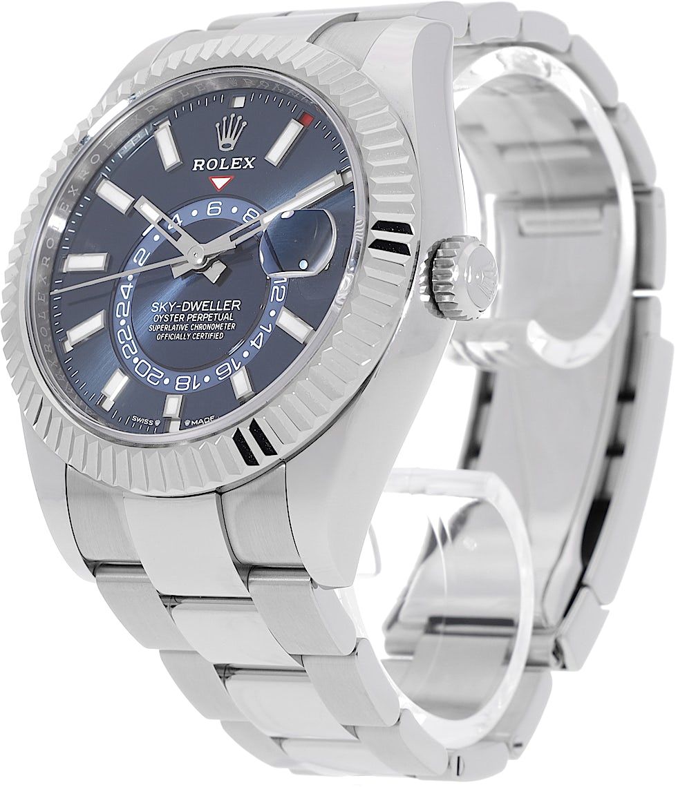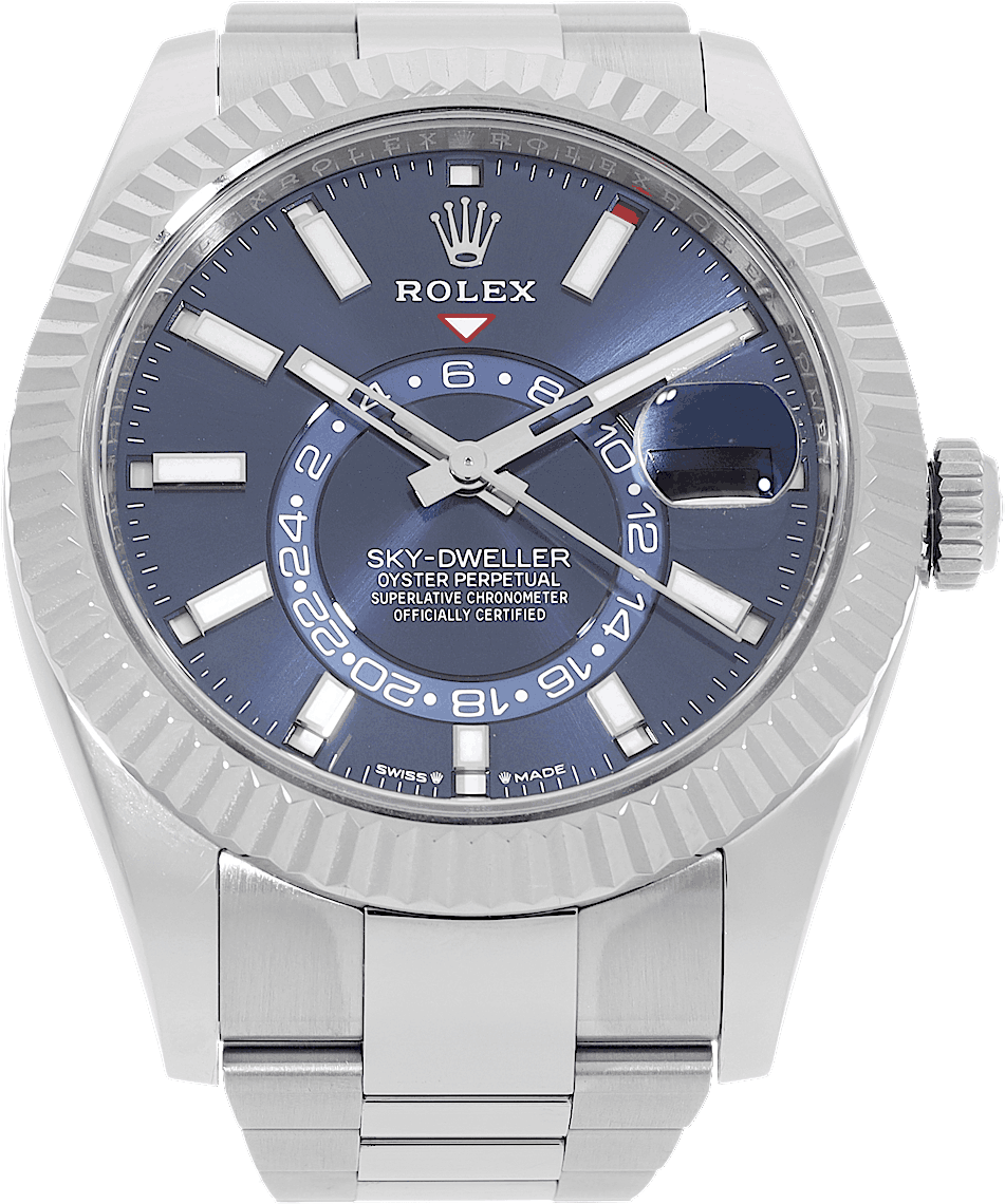 Rolex Sky-Dweller, Reference: 336934, Gender: Male, Size: 42mm, Dial color: Blue, Strap material: Stainless Steel, Movement: Automatic, Year: 2024, Condition: Previously worn, minor to no signs of usage. The movement is flawless and the case has been cleaned. watch tested ensure full functionality. An inspection by our certified watchmakers guarantees its authenticity., Documents: Original papers, CHRONEXT Certificate